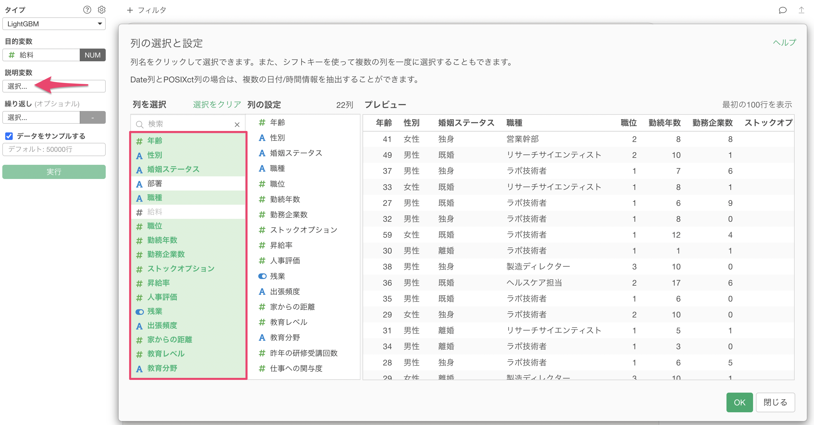 説明変数の列をクリックして、給料を予測する上で使用する列を選択します。列の選択画面では、個別に列を選ぶことも、列の範囲を指定してまとめて選ぶこともできます。
