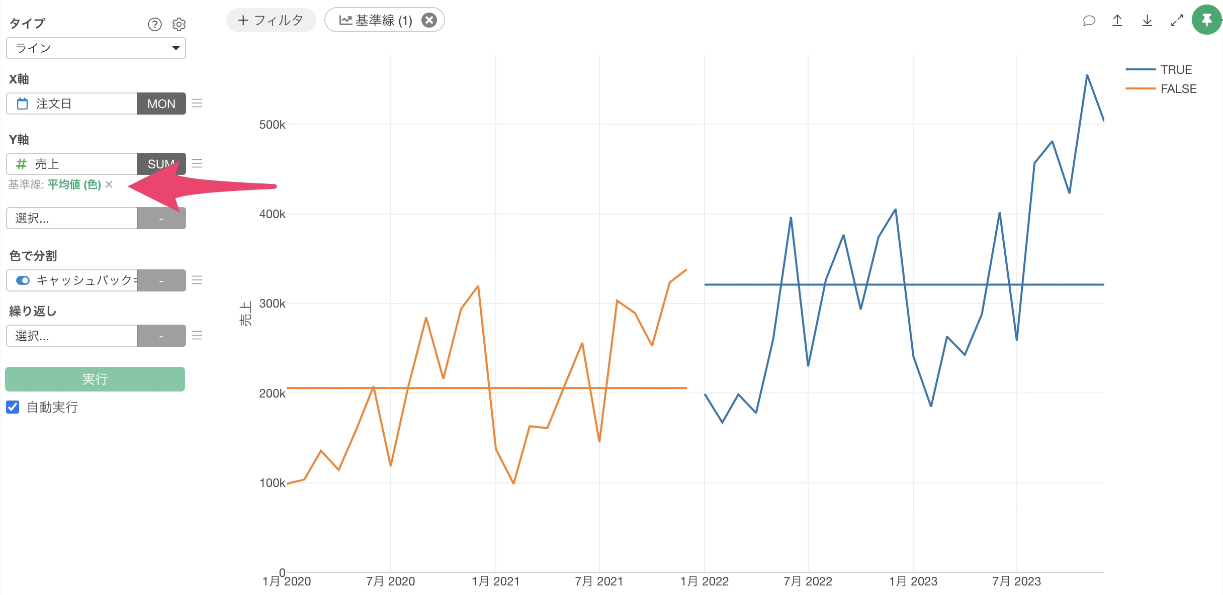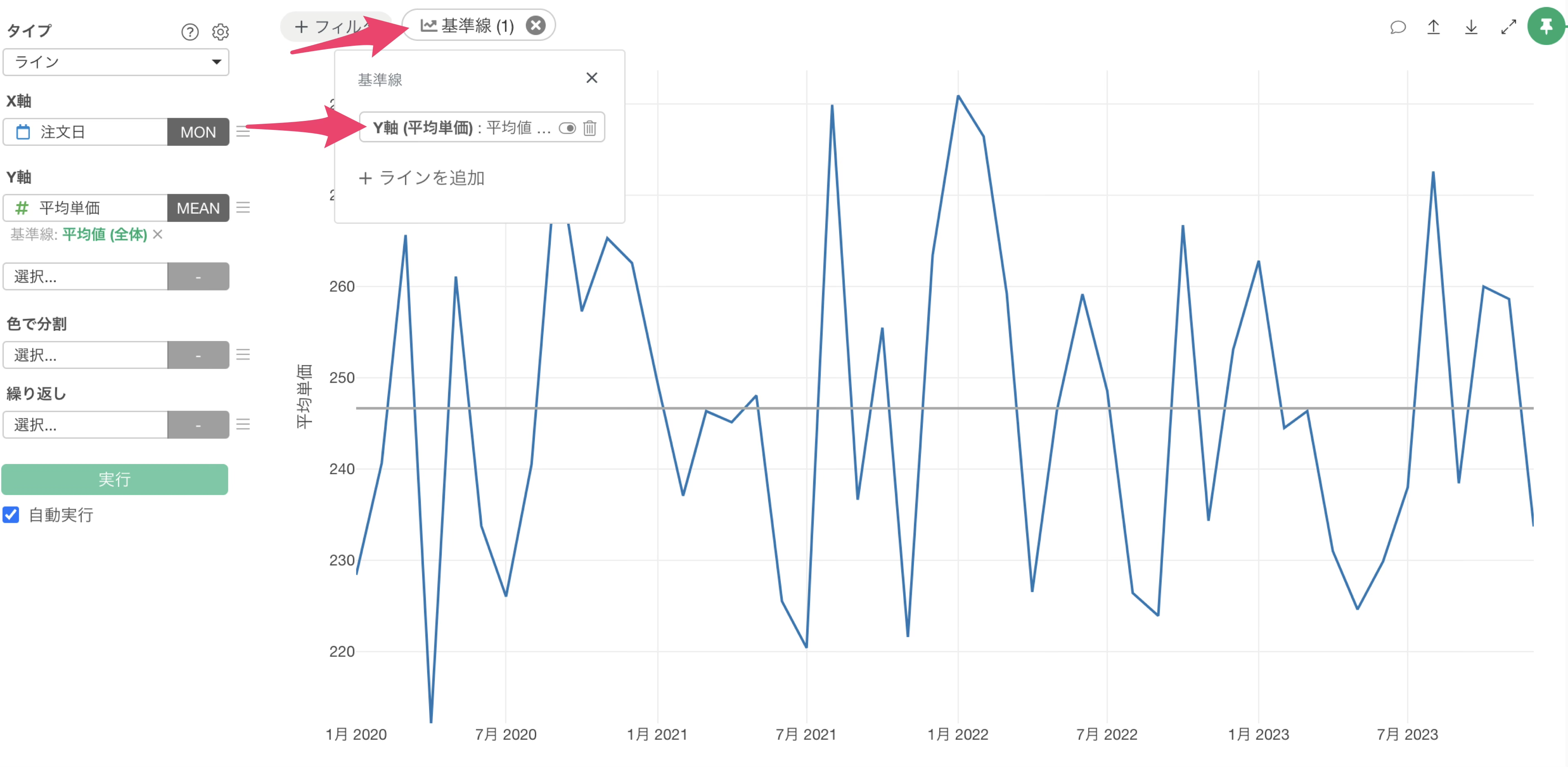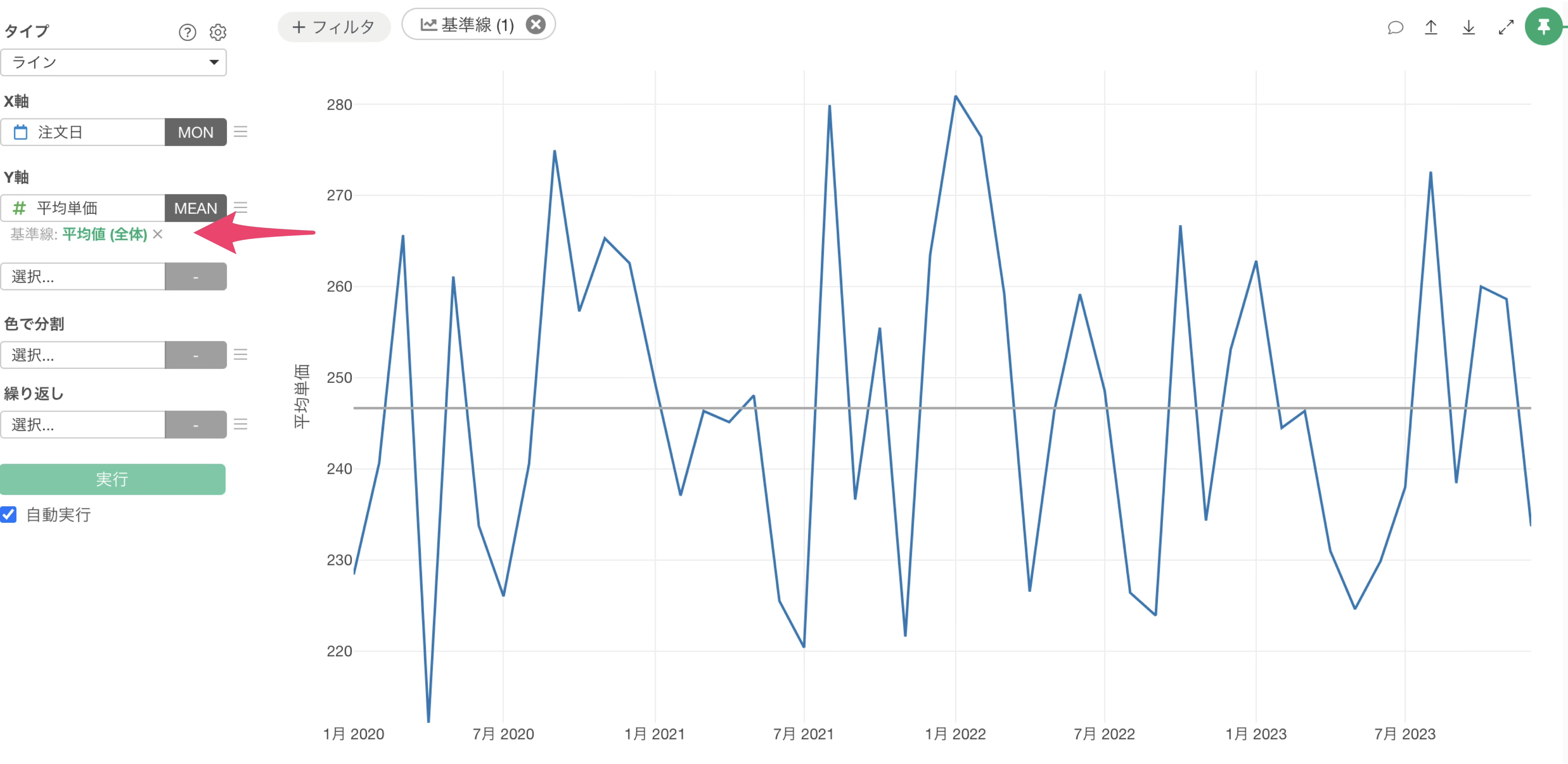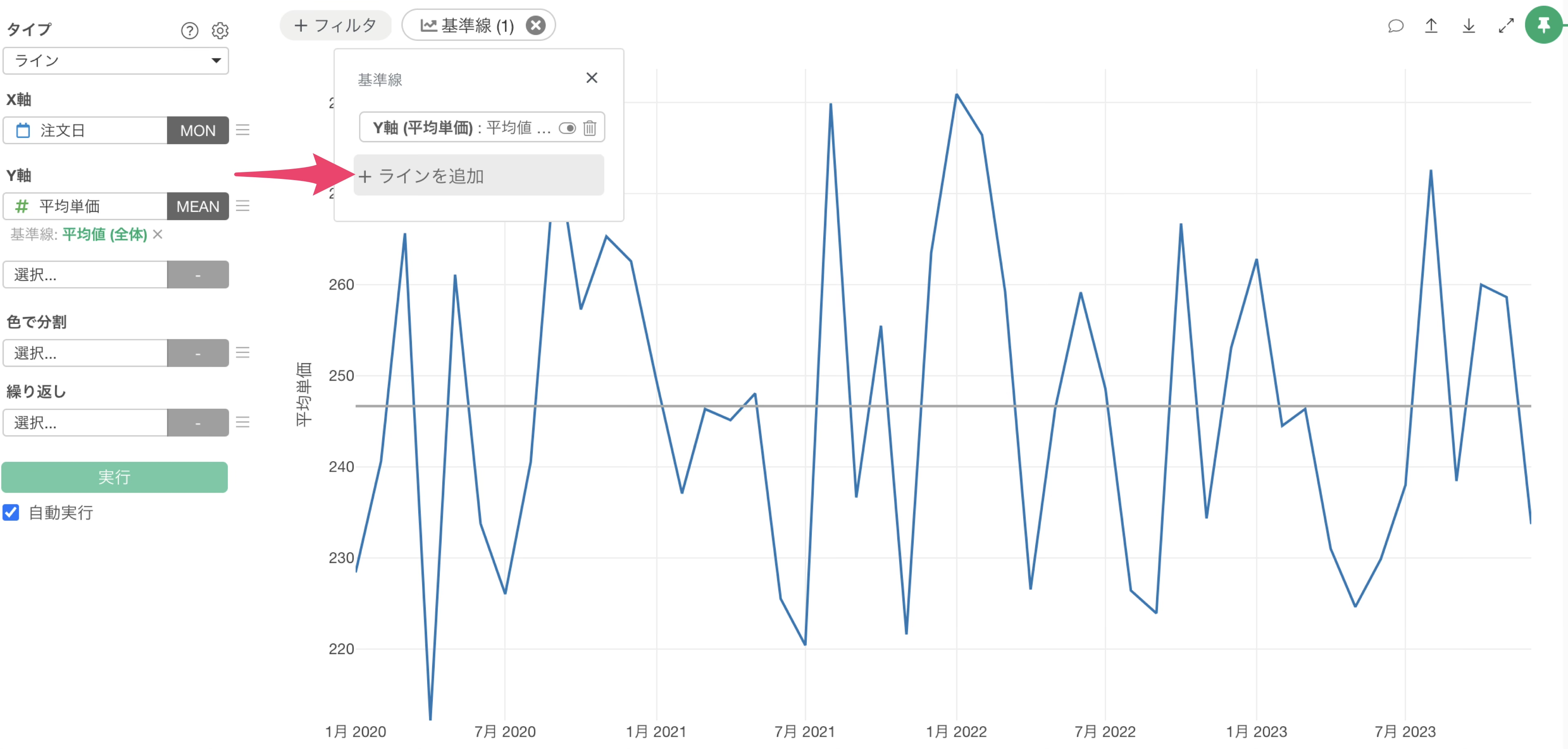 前述した平均のような集計値ではなく、「移動平均」のような表計算をもとにした基準線の設定も可能です。