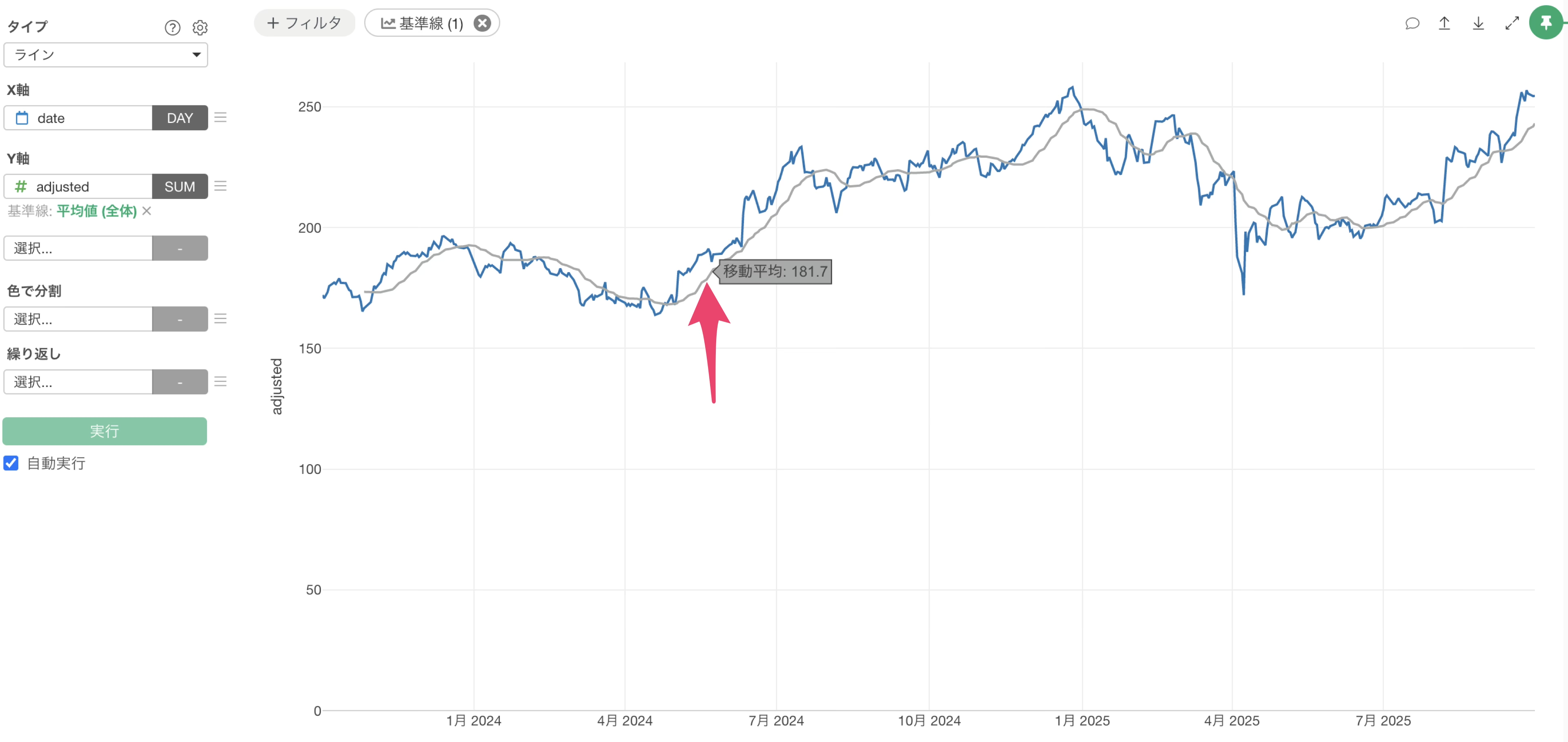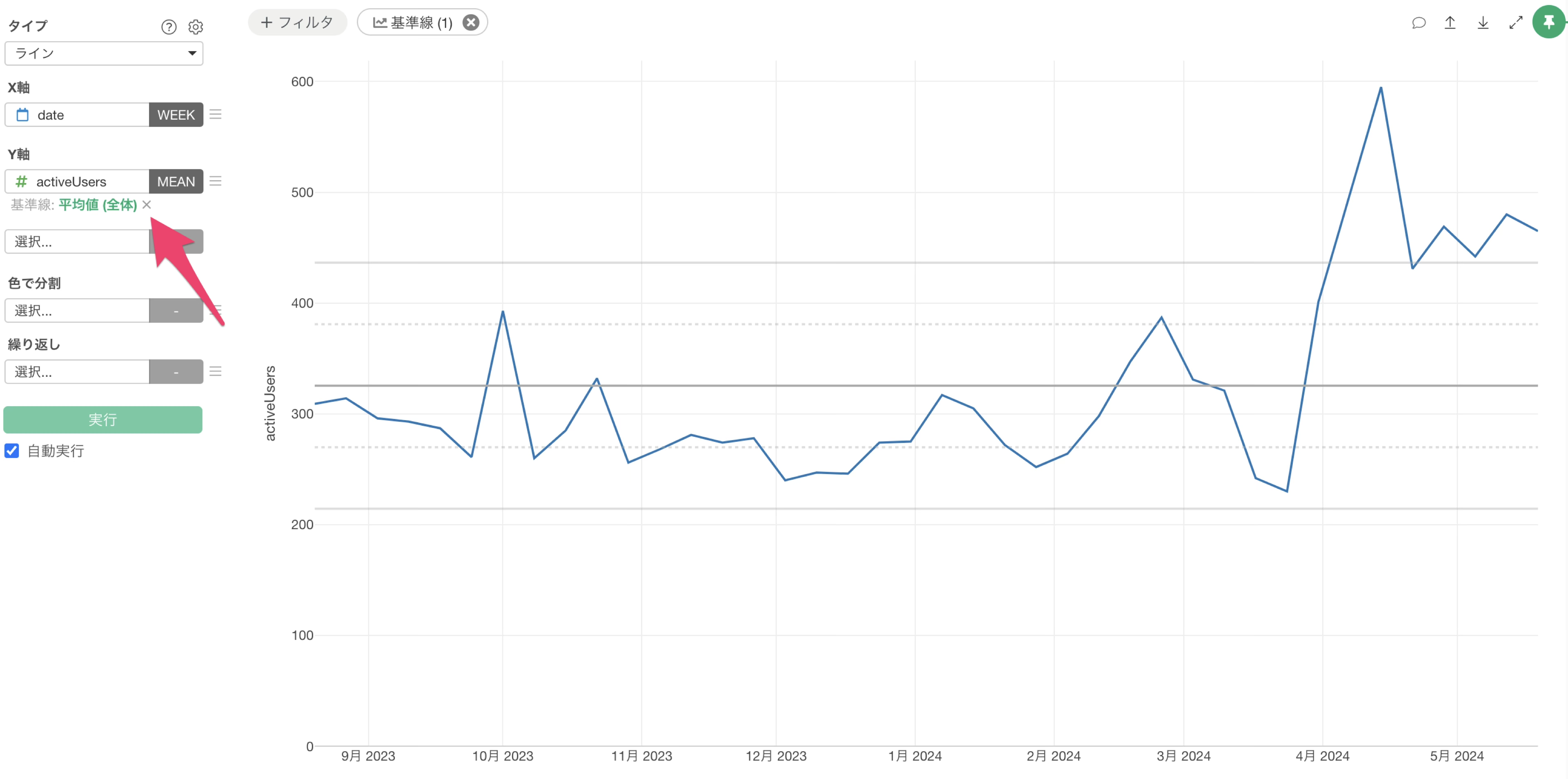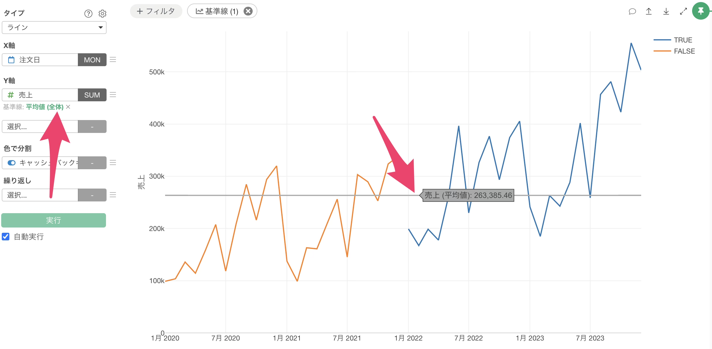 前述した平均のような集計値ではなく、「移動平均」のような表計算をもとにした基準線の設定も可能です。