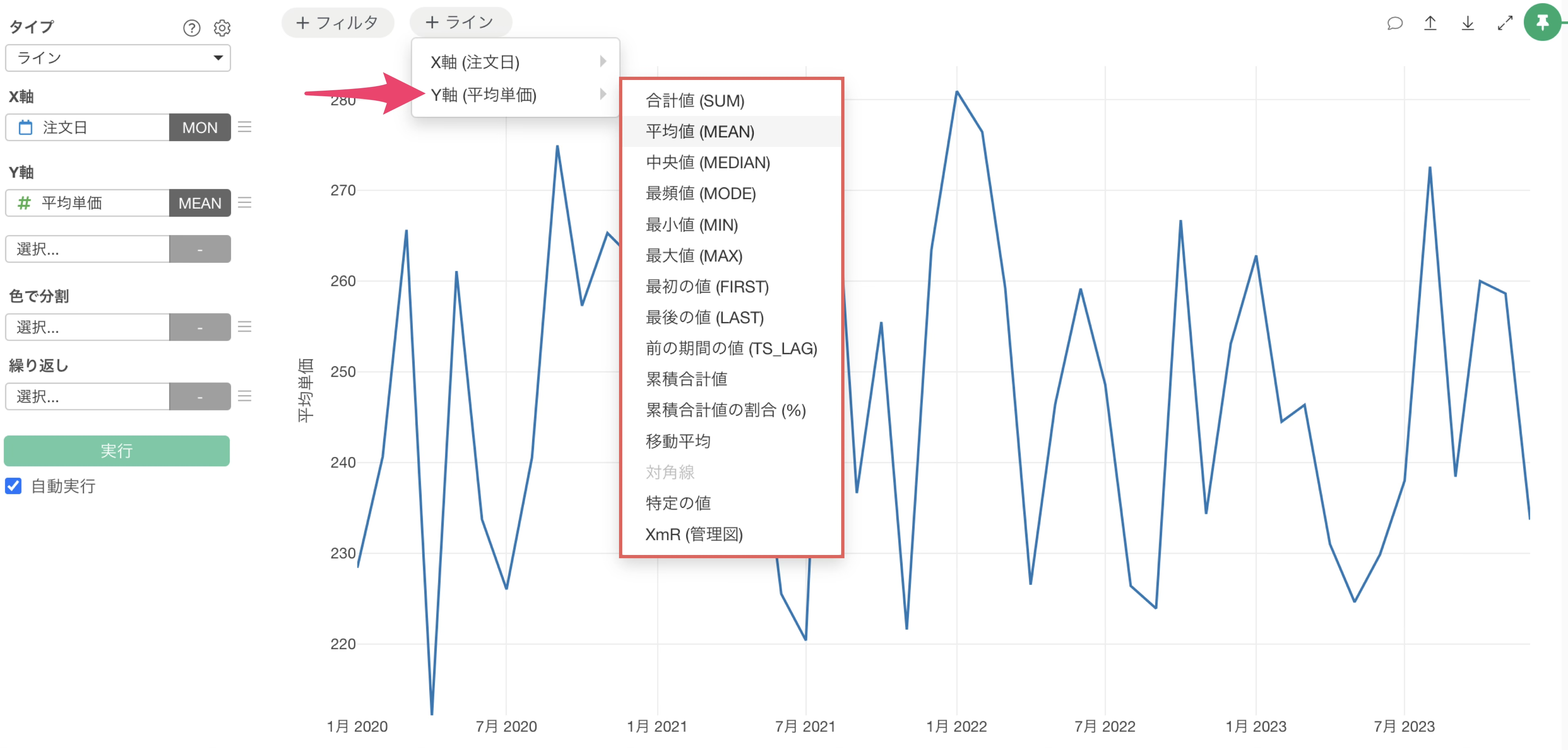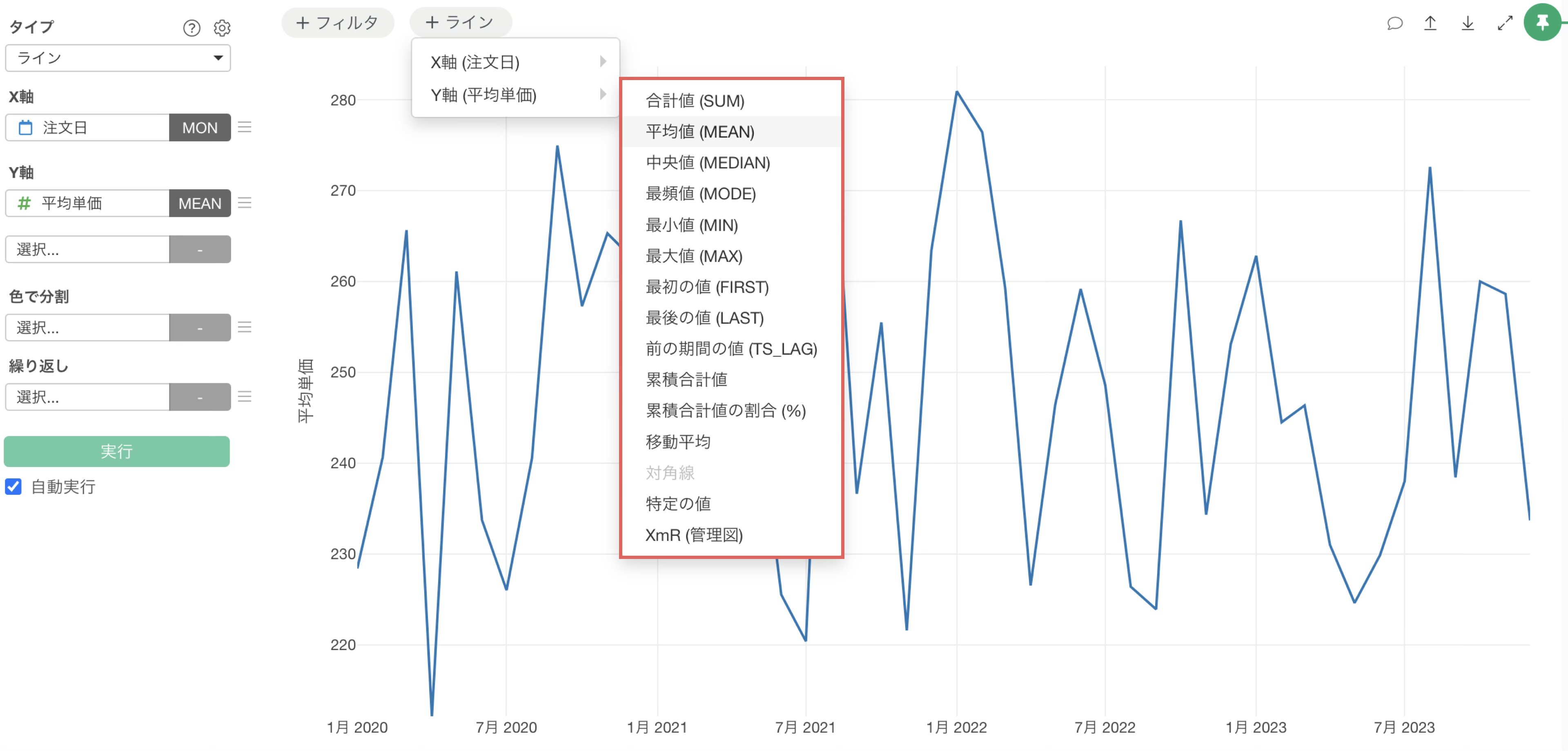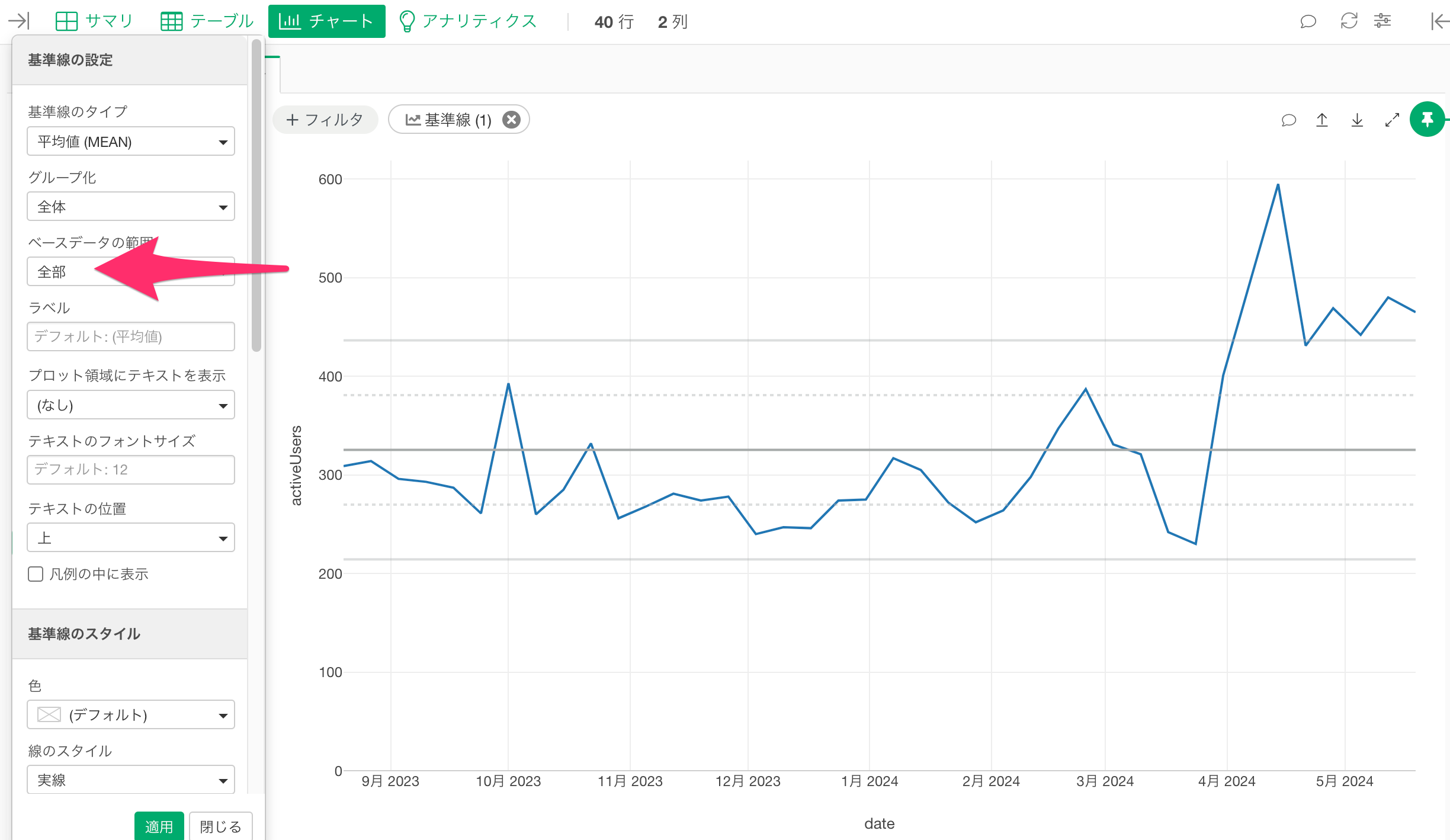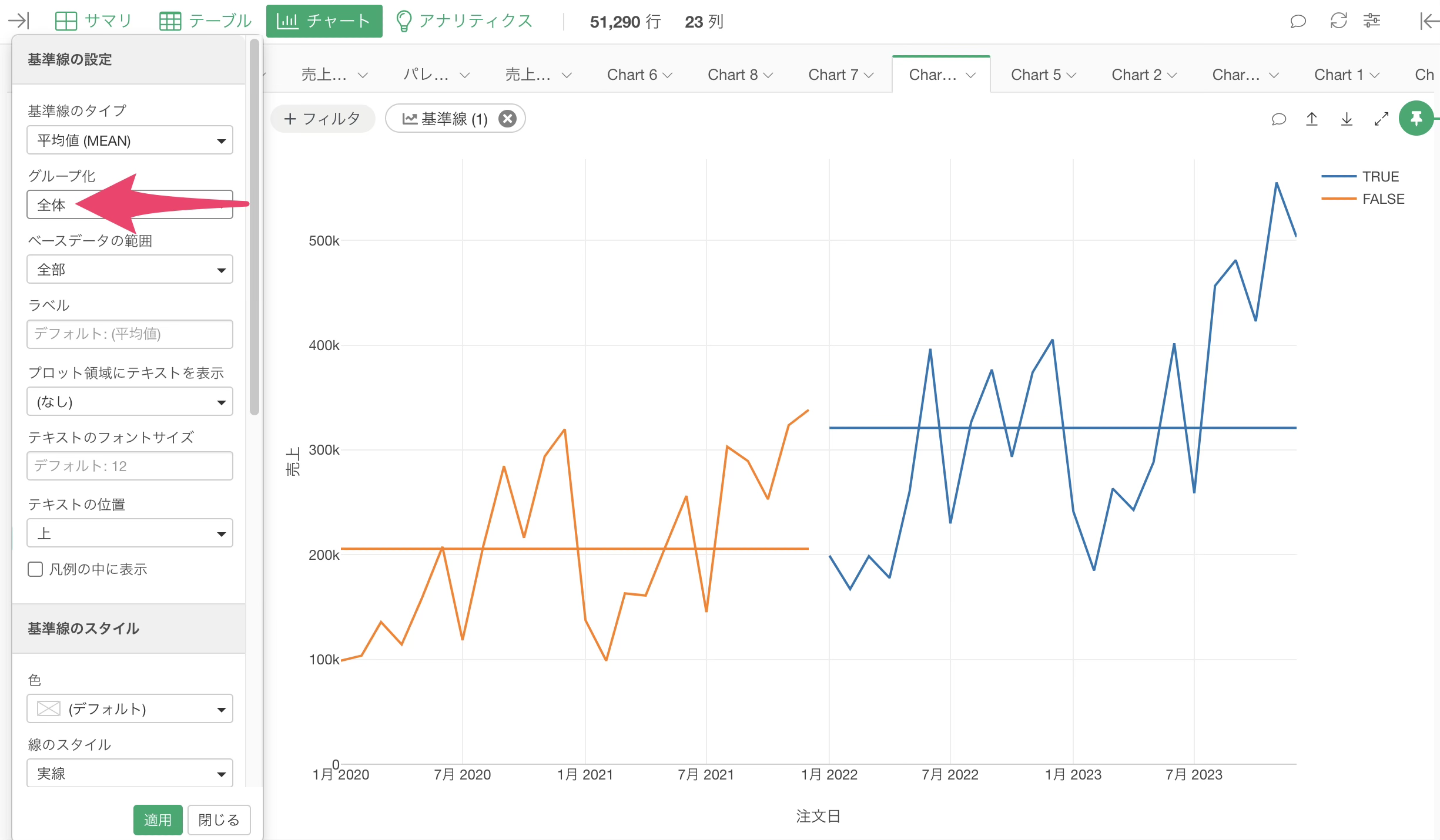 前述した平均のような集計値ではなく、「移動平均」のような表計算をもとにした基準線の設定も可能です。