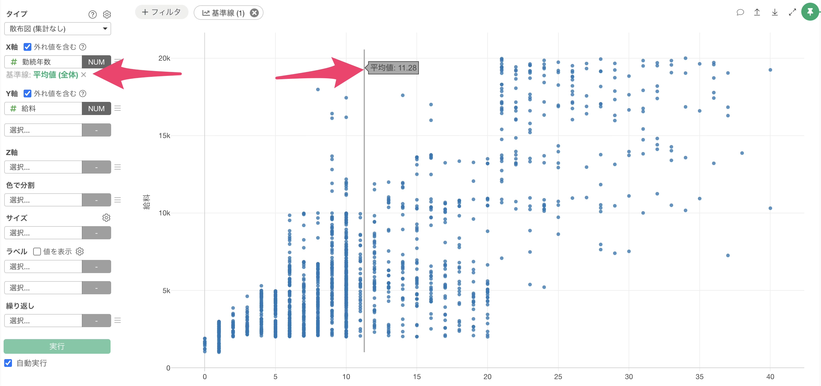 例えば、散布図では、X軸の基準線に平均値を設定して、散布図の中で、 X軸に設定した指標が平均値よりも多い観察対象を一目で確認できます。