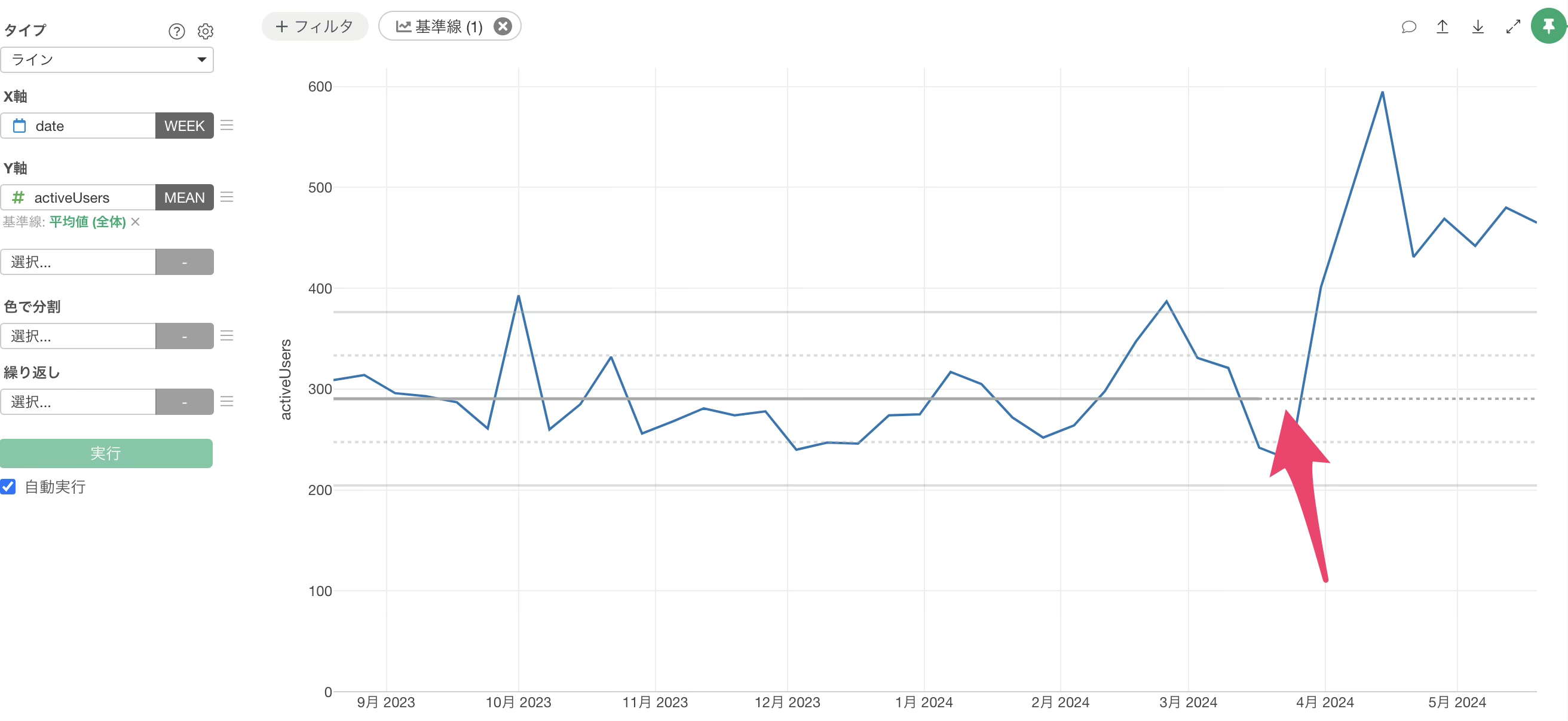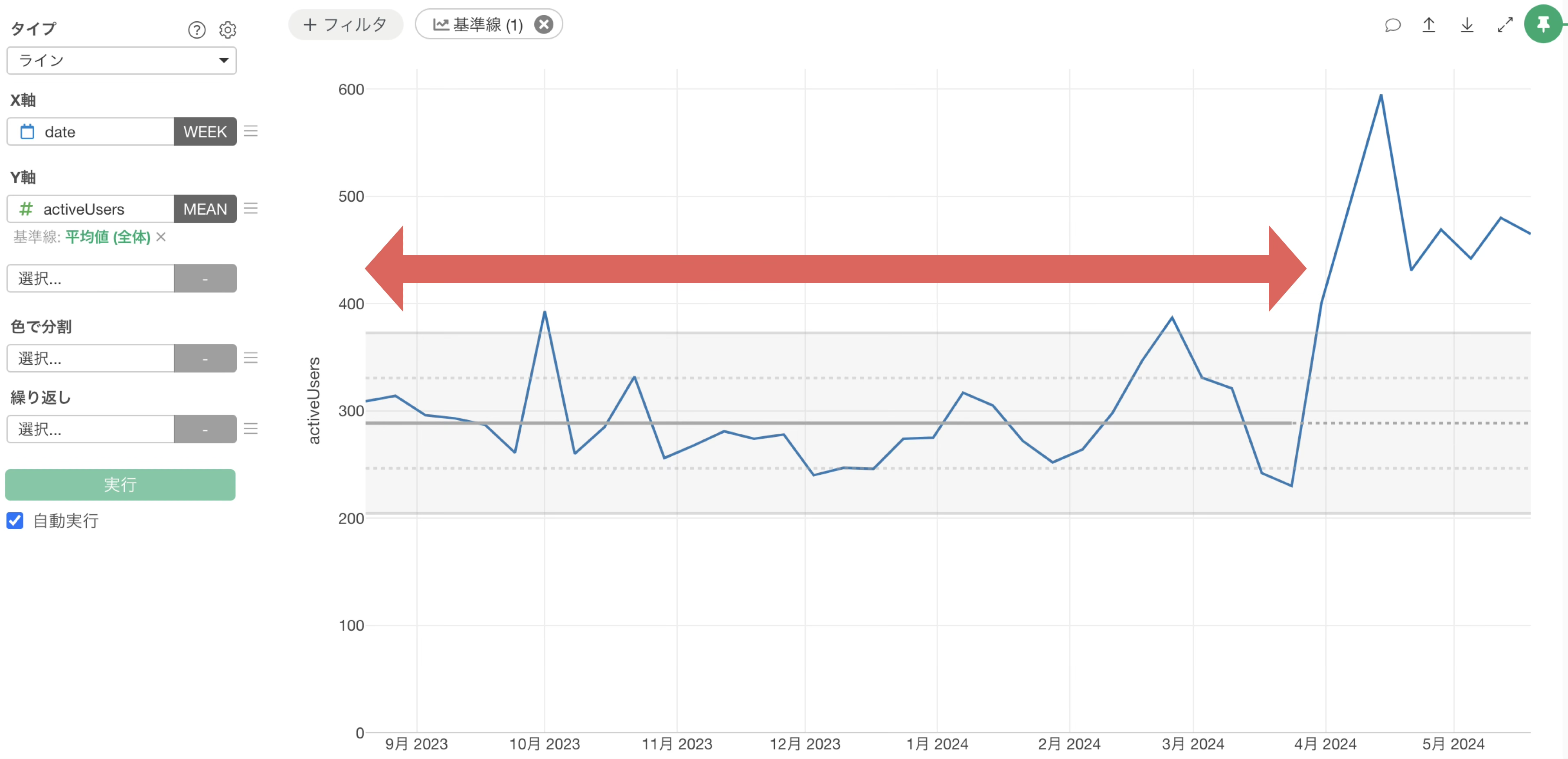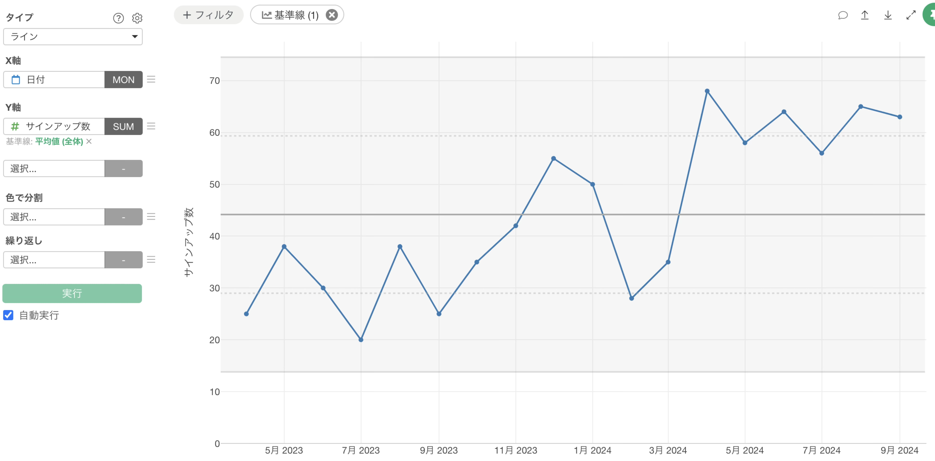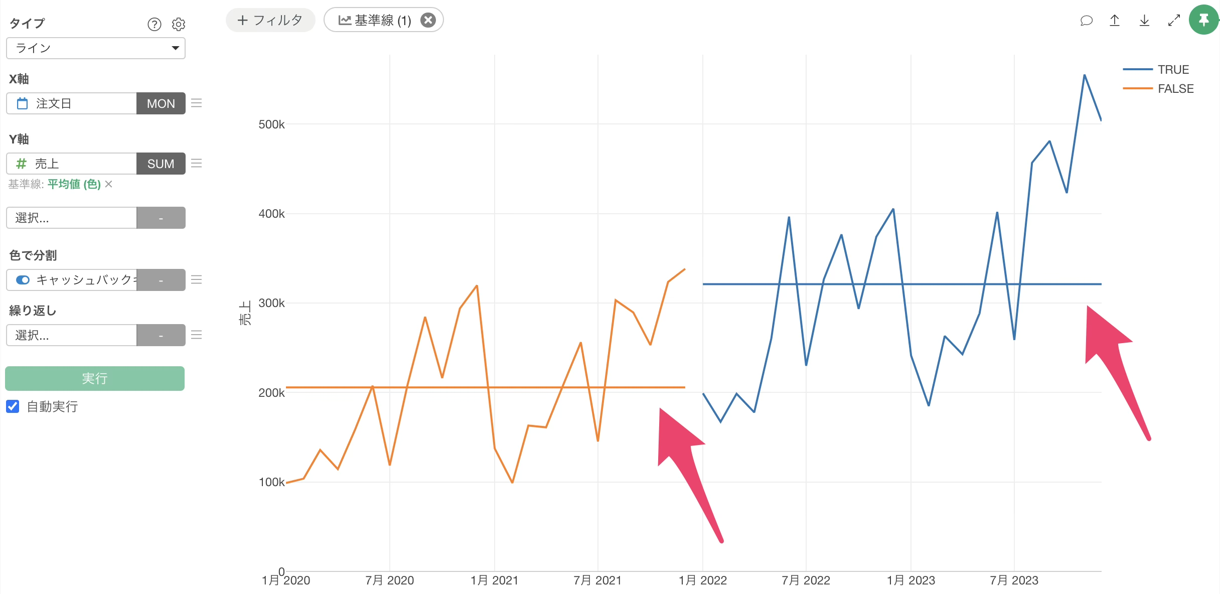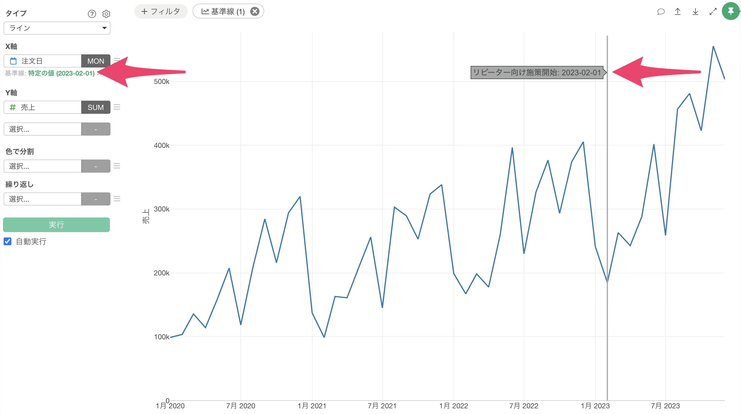 他にも、基準線に特定の値を指定して、任意の日付や数値に対して基準線を設定することも可能です。