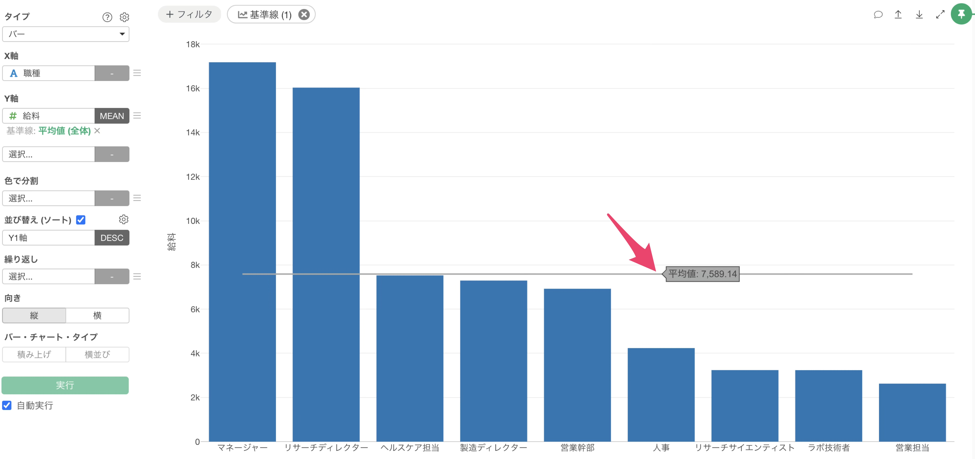 例えばバーチャートで グループごとの指標を可視化した際、全体の平均線を引くことが可能です。