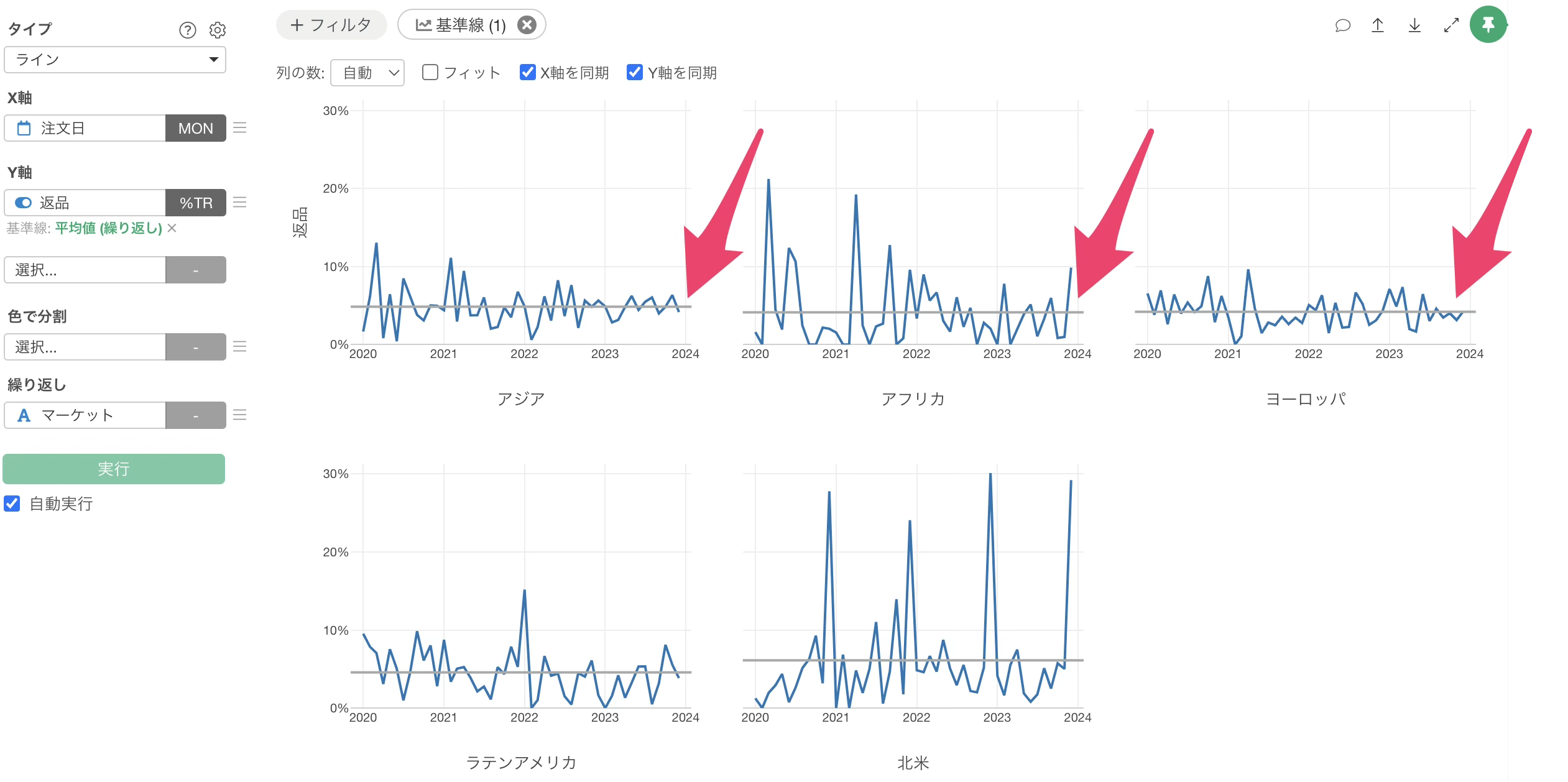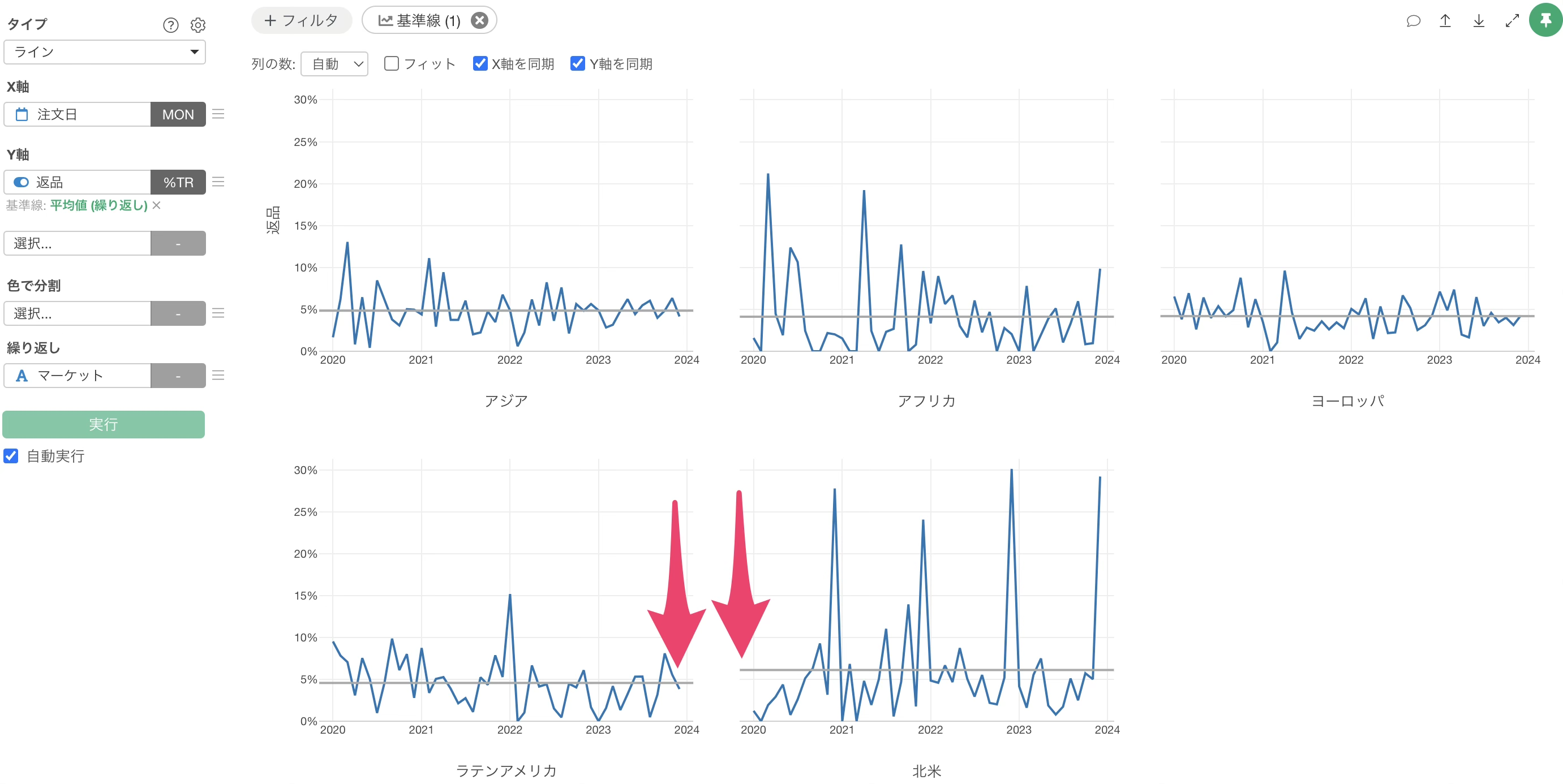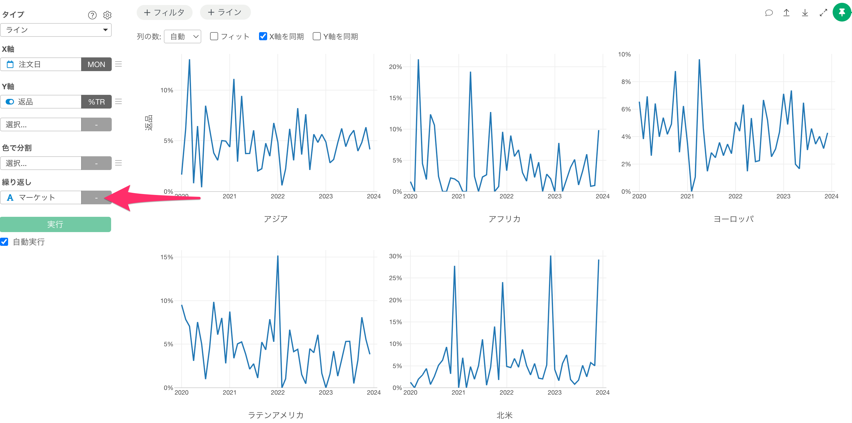 Exploratoryでは、色で分割の機能や繰り返しの機能を使って、チャートをグループに分けた可視化が可能です。