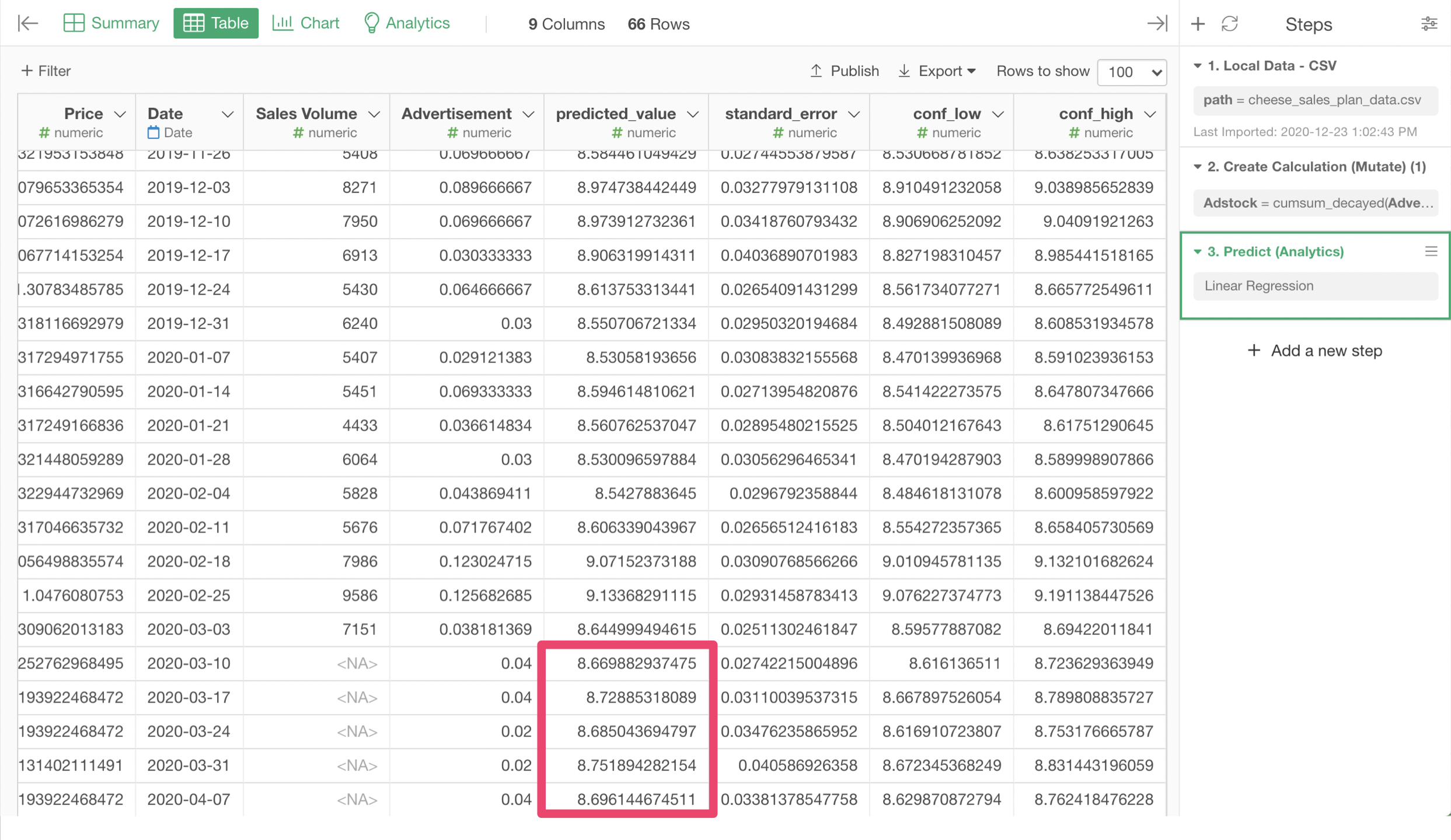 Let's say we planned the advertisement and pricing for the next 5 weeks as in this new data, which is the original data plus those 5 rows for the future planning. Since this is for the future, the Sales Volume values are NAs. We are to predict those values based on the planned advertisement and pricing with the model we previously built.