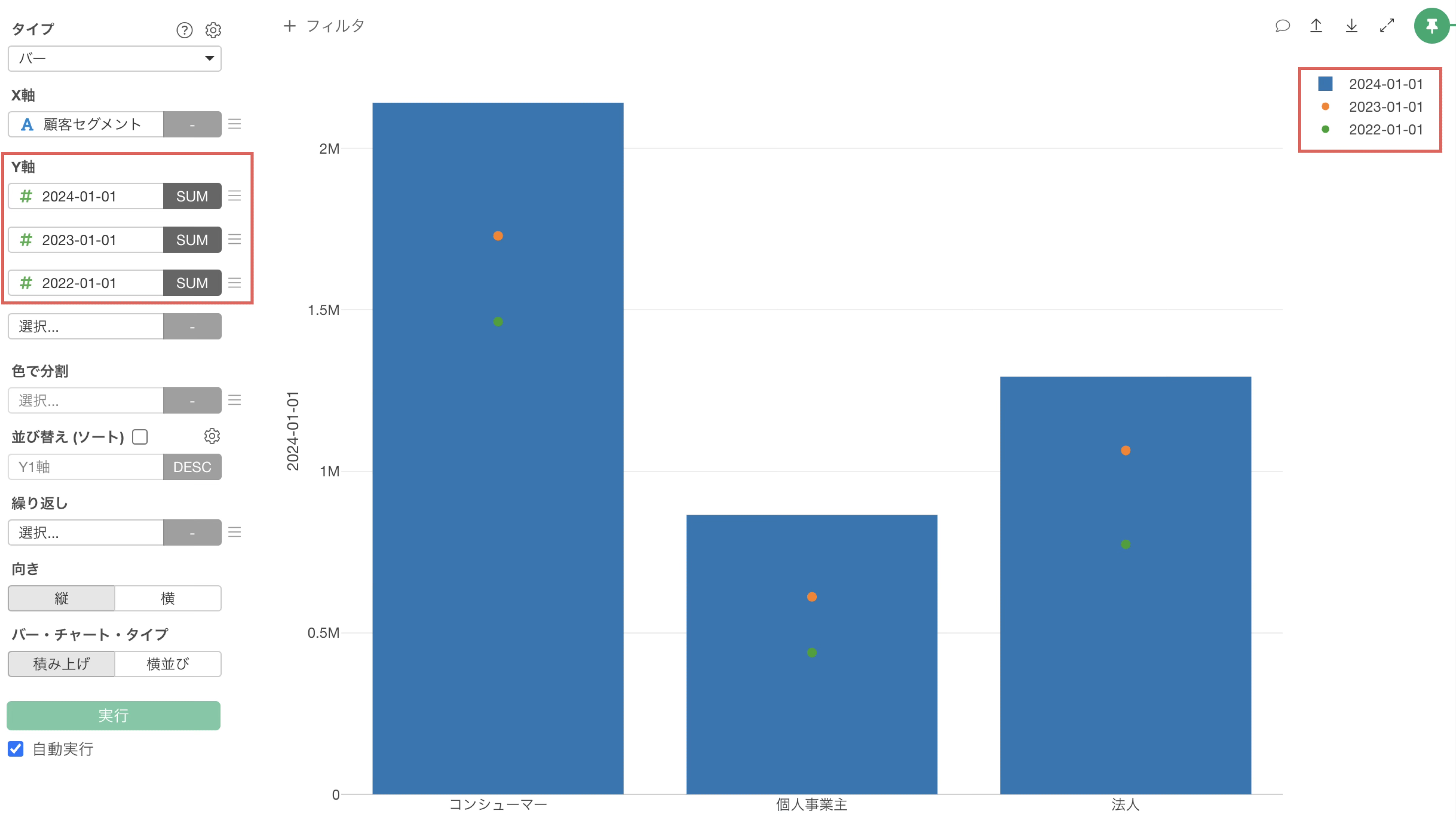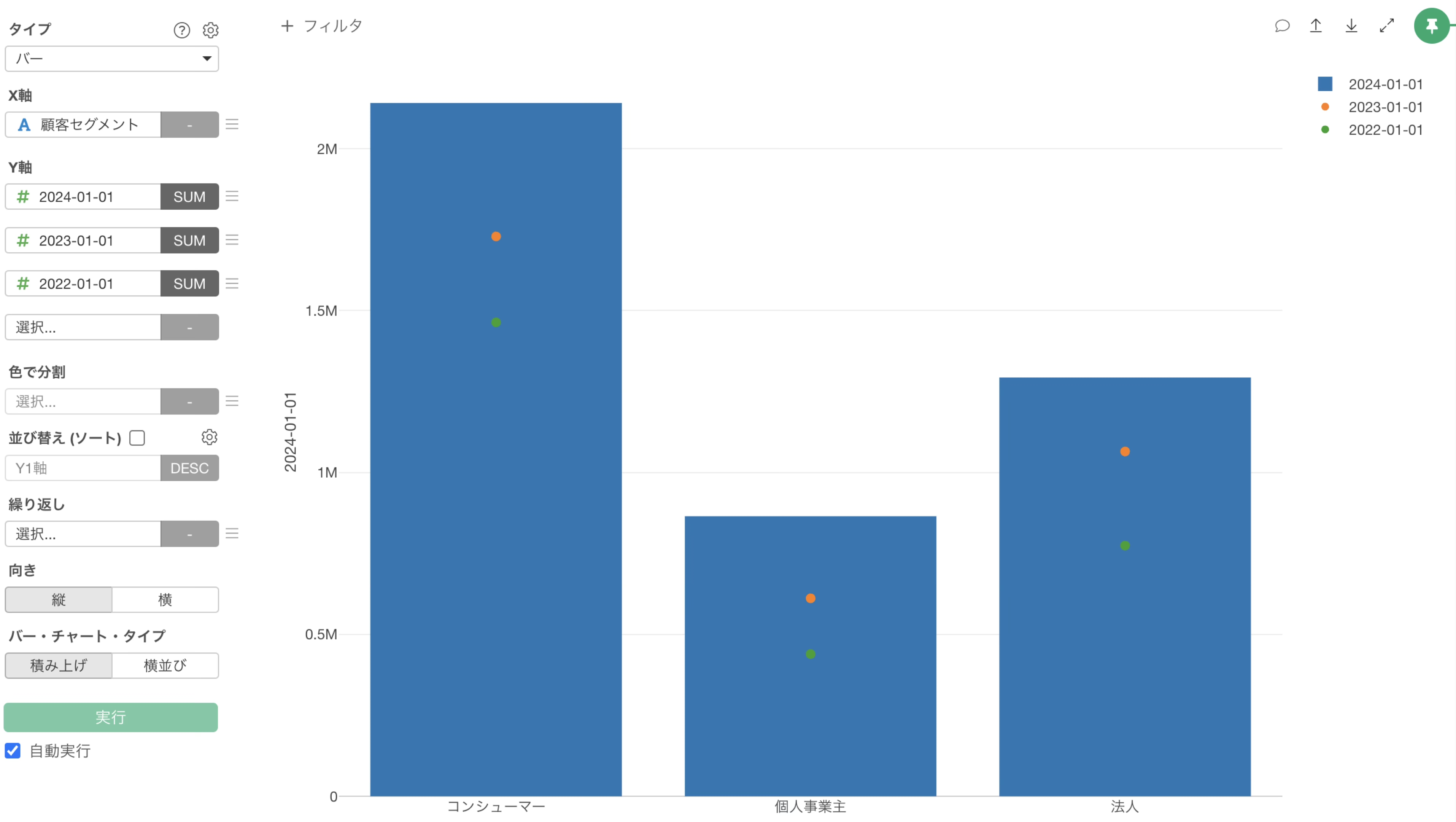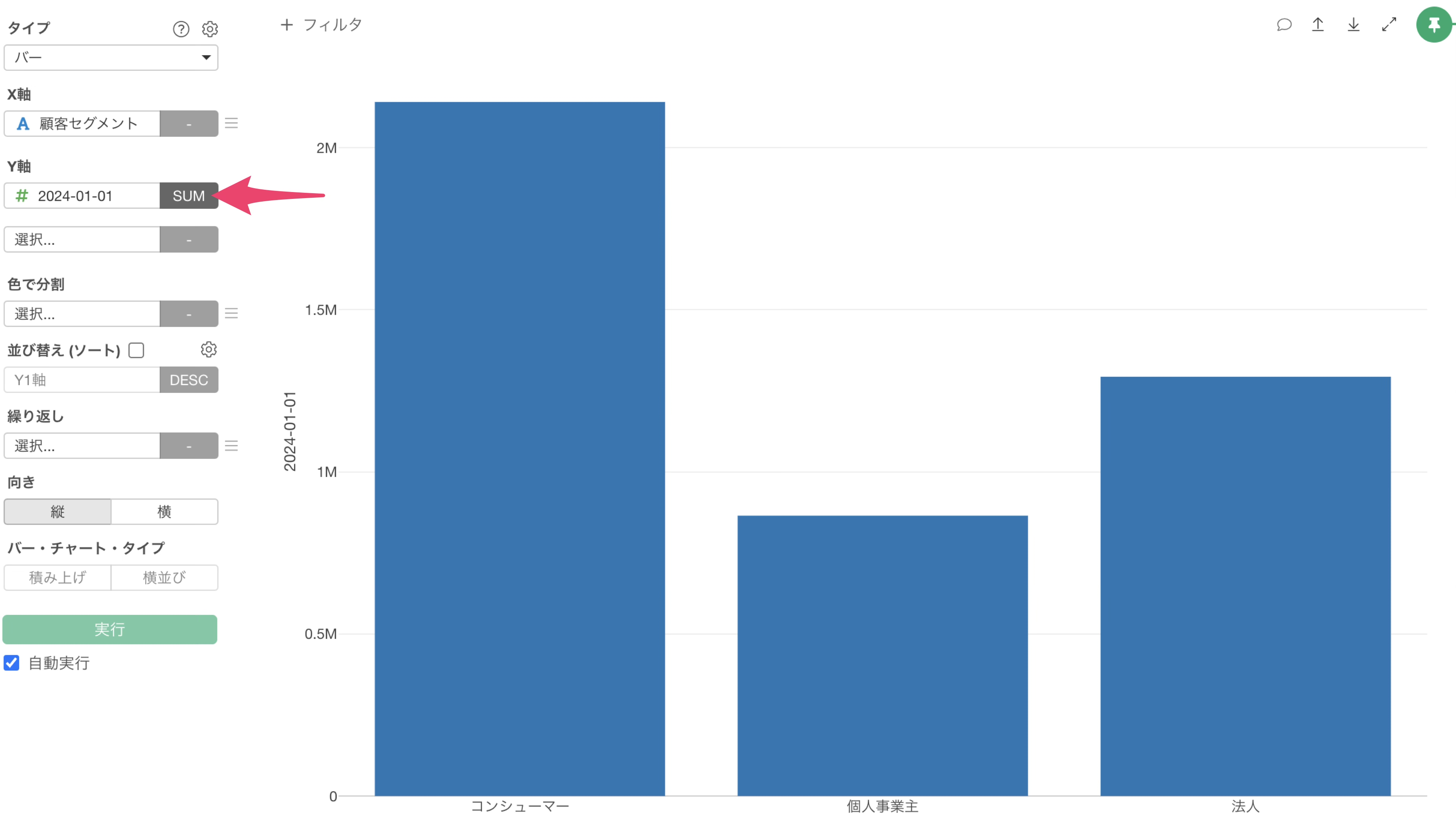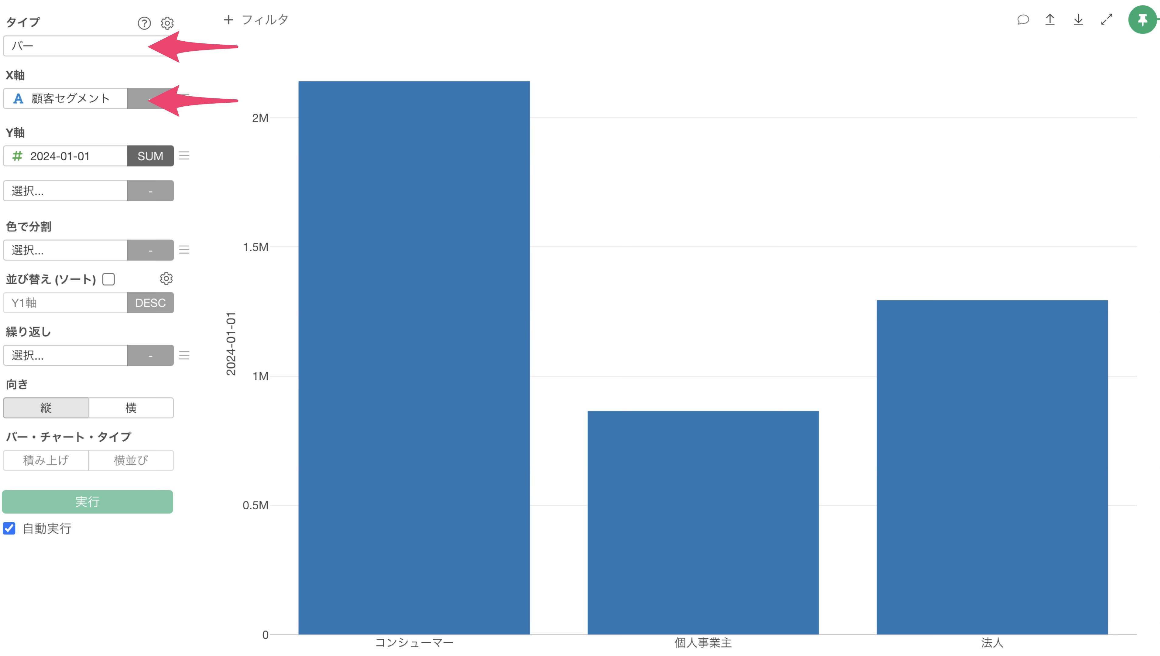 チャートタイプにバーを選択し、X軸には顧客セグメントを選択します。