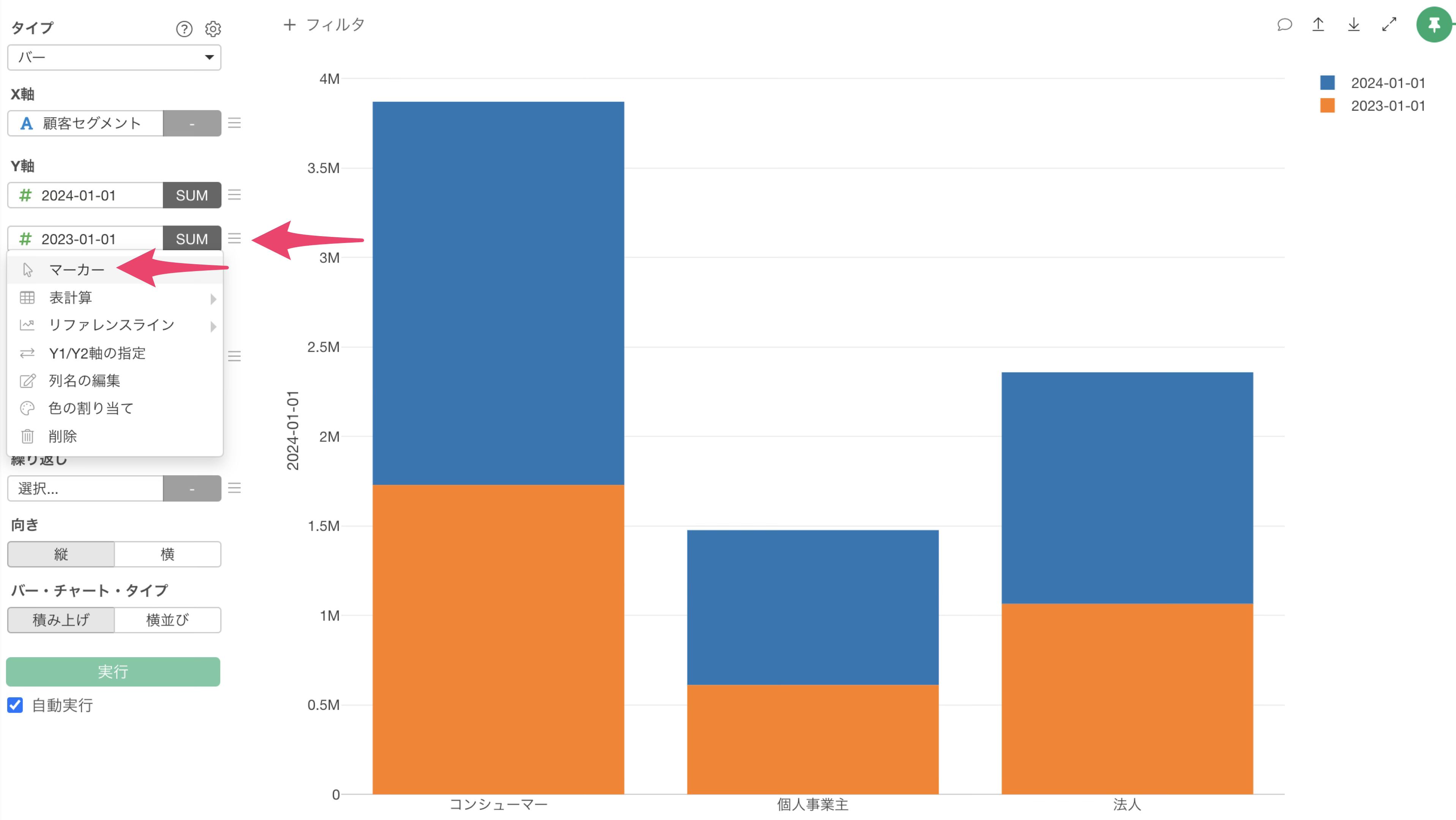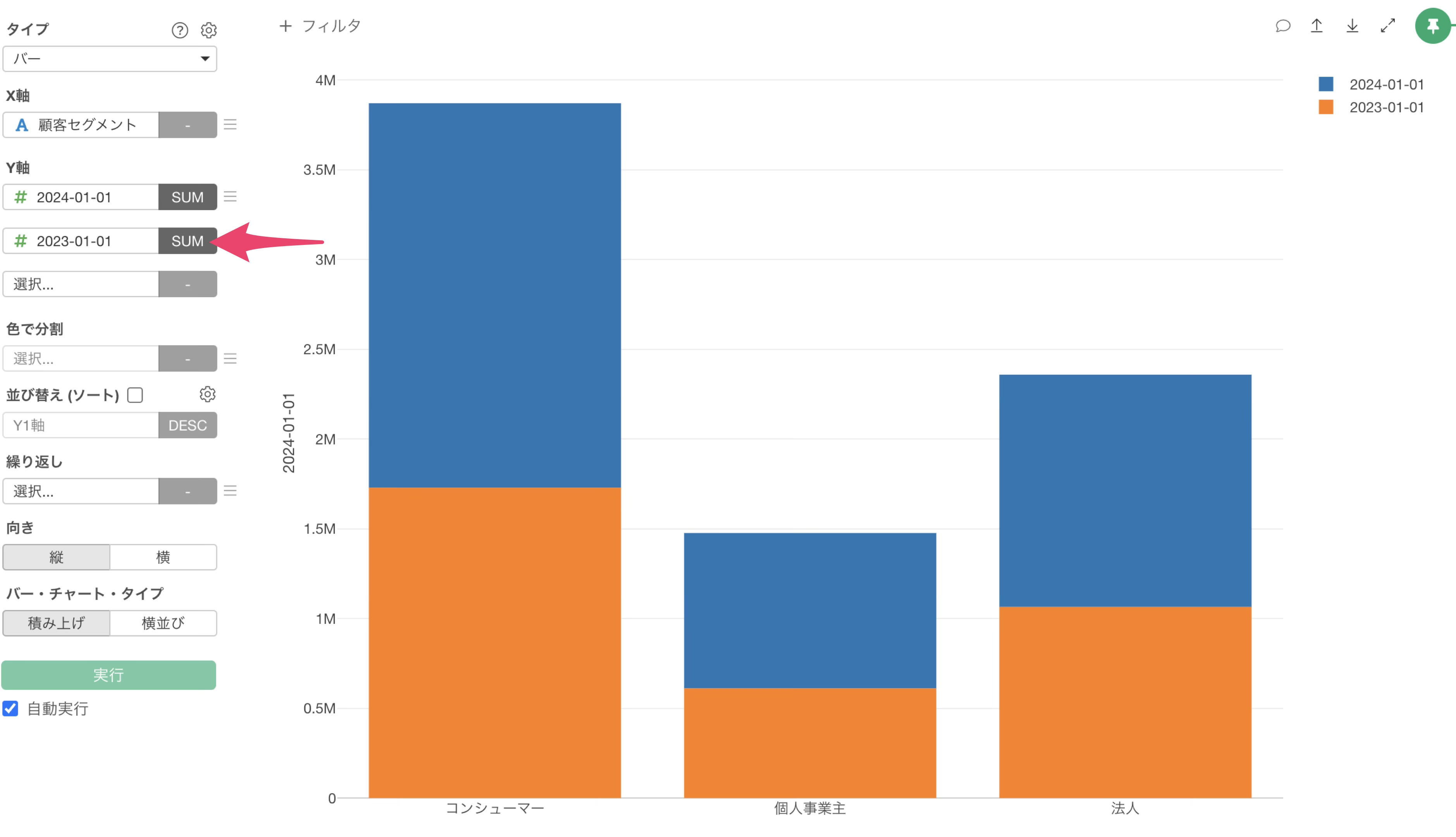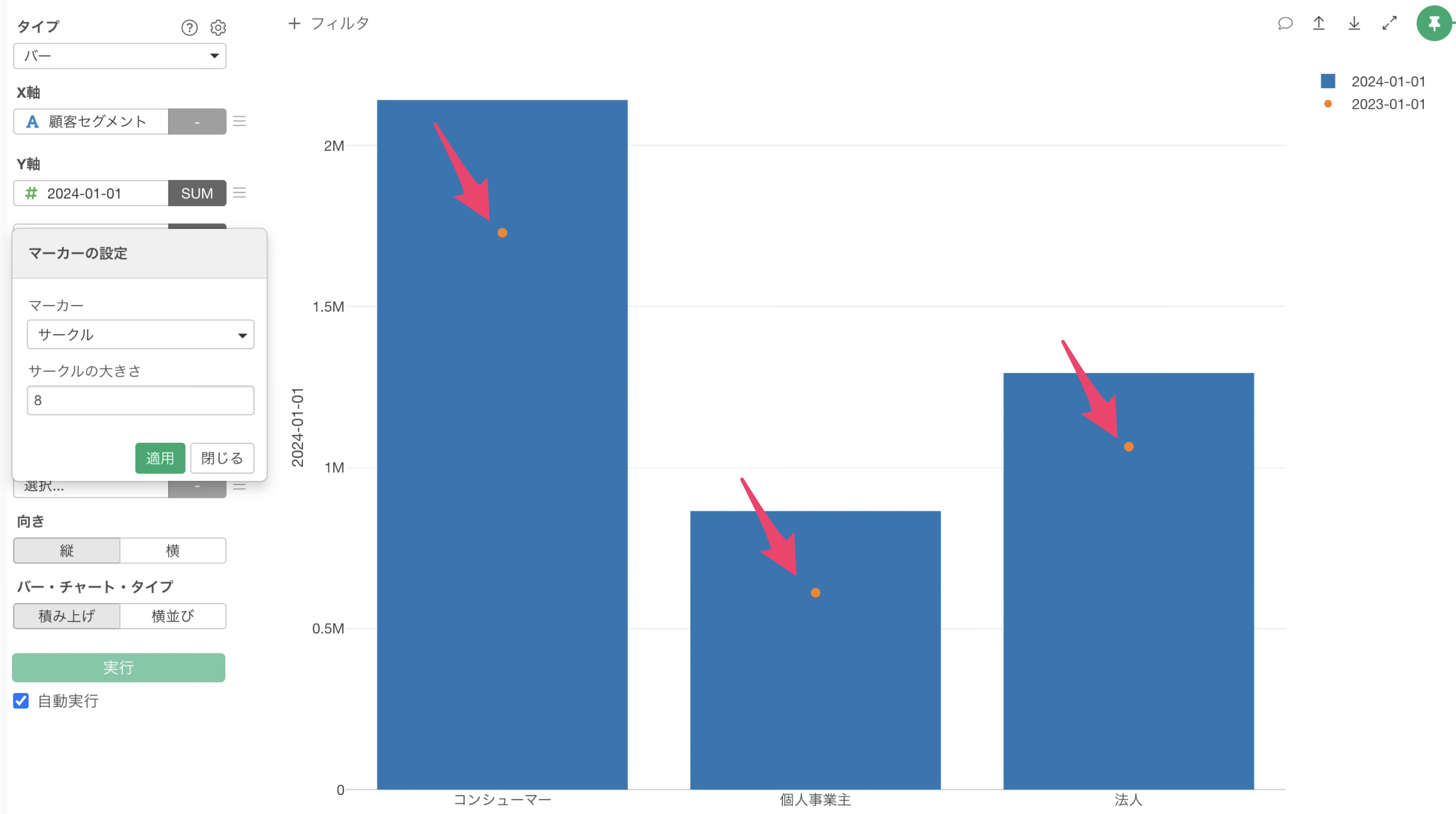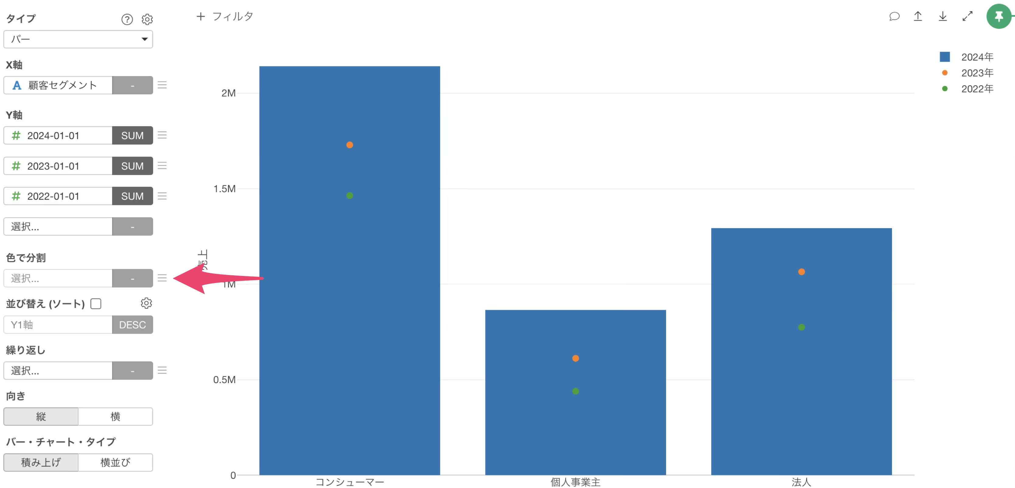 チャートタイプにバーを選択し、X軸には顧客セグメントを選択します。