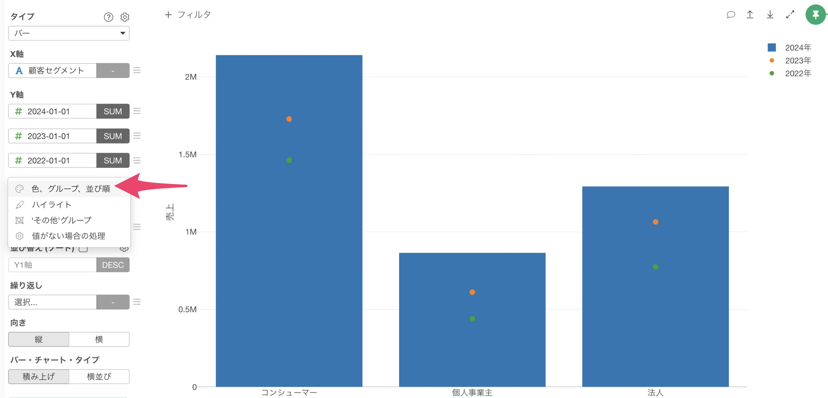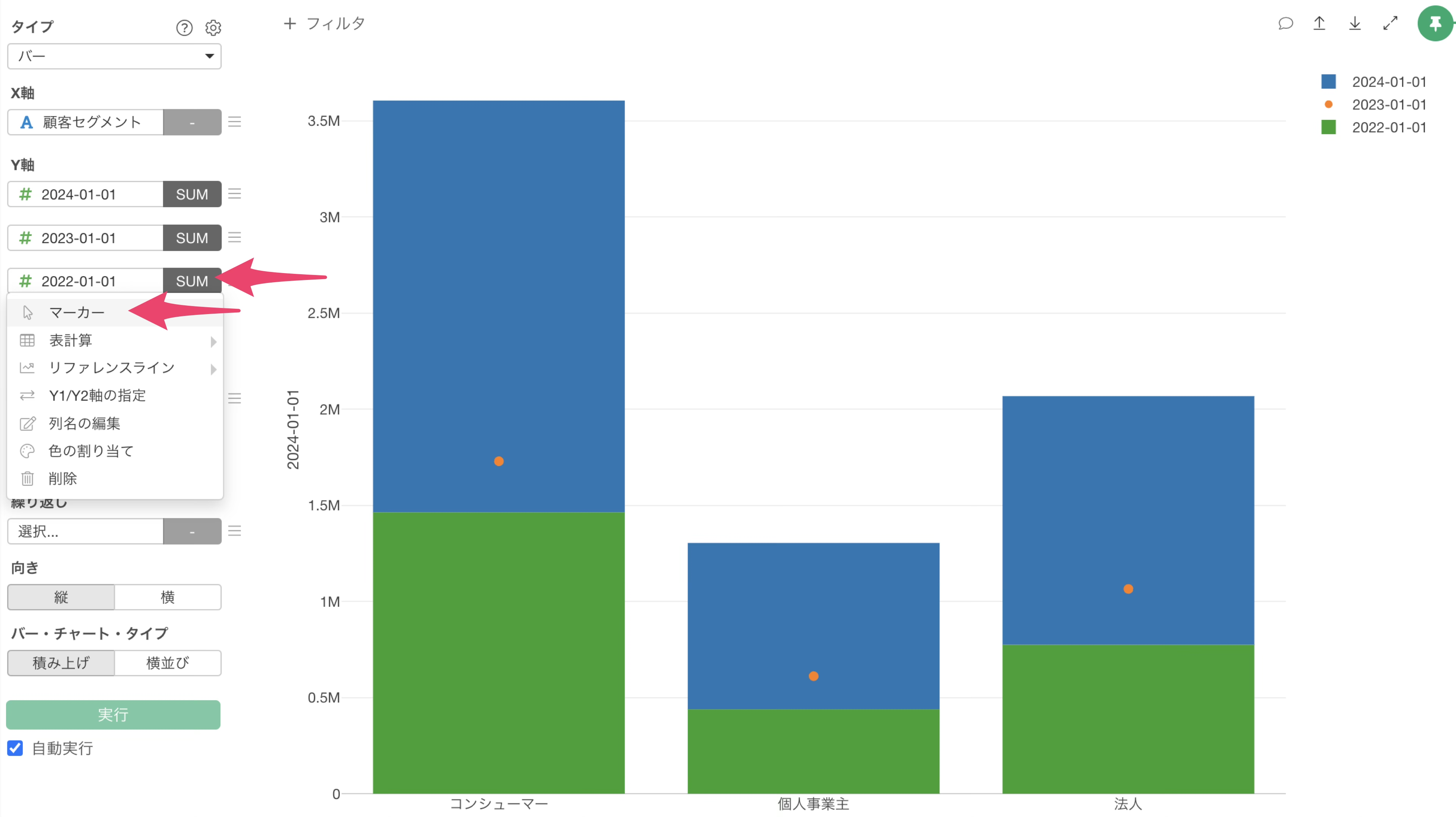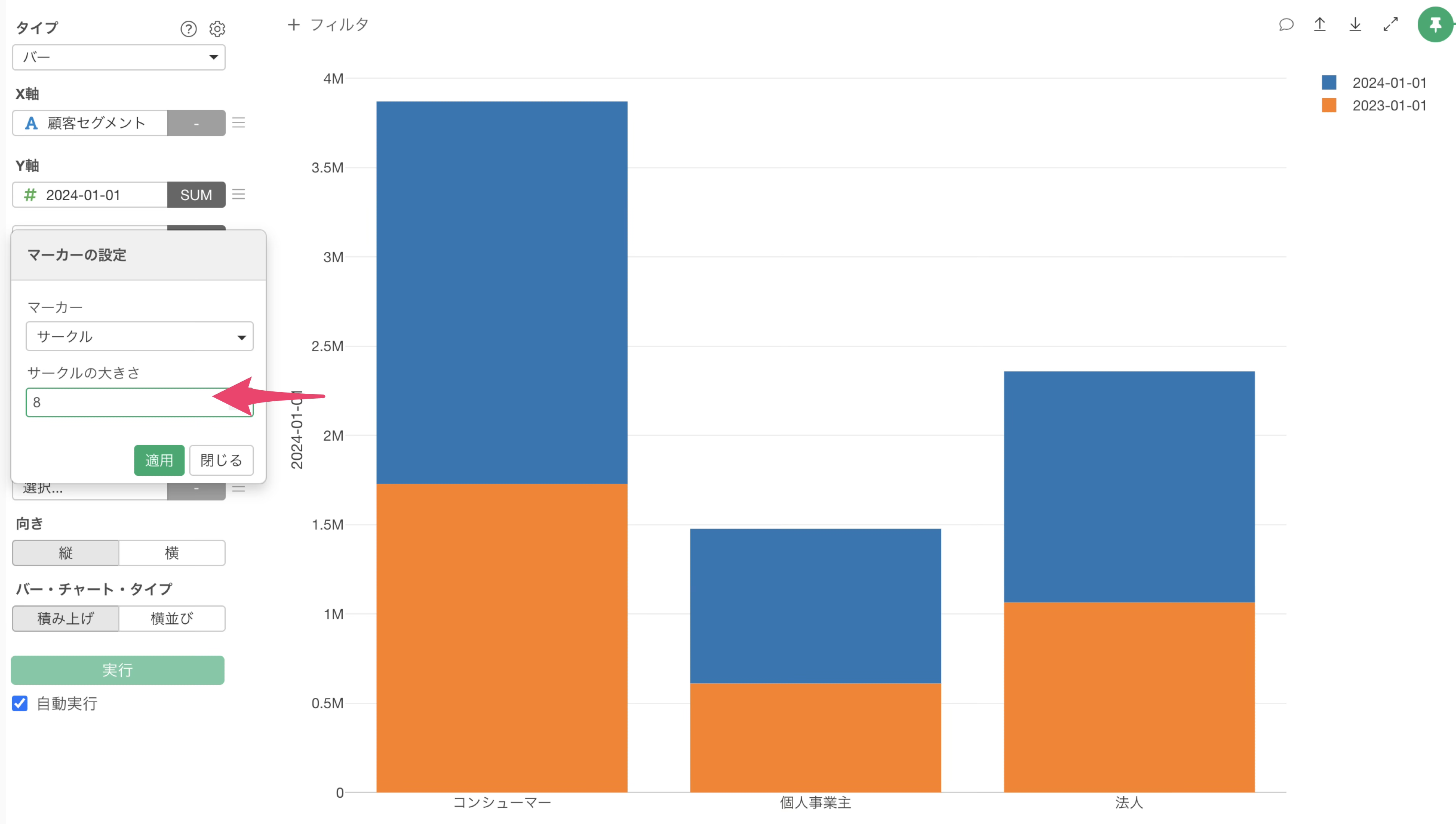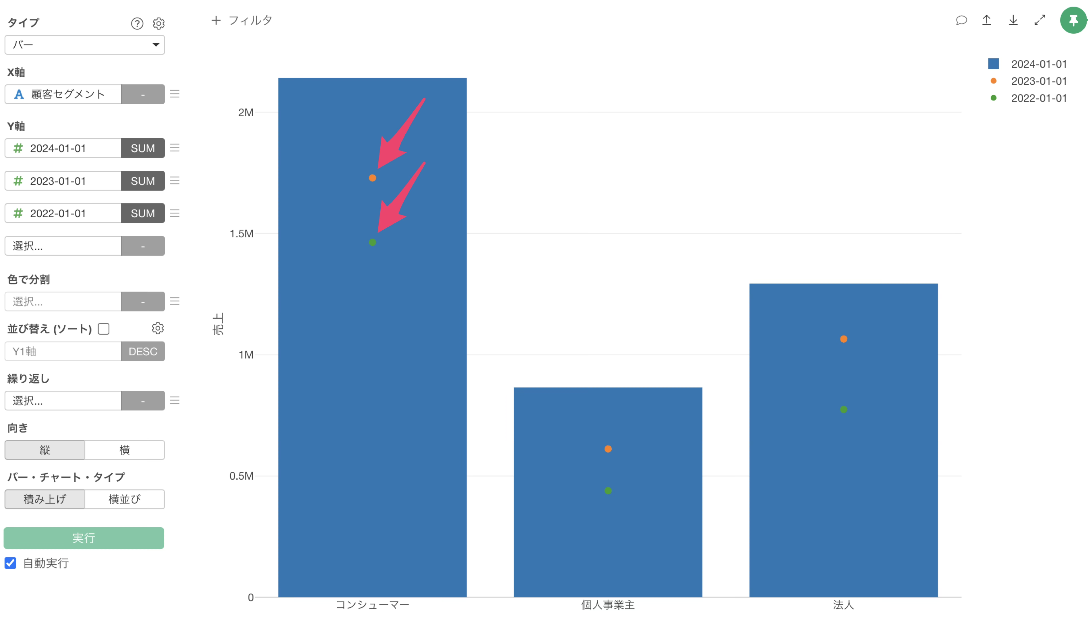 チャートタイプにバーを選択し、X軸には顧客セグメントを選択します。
