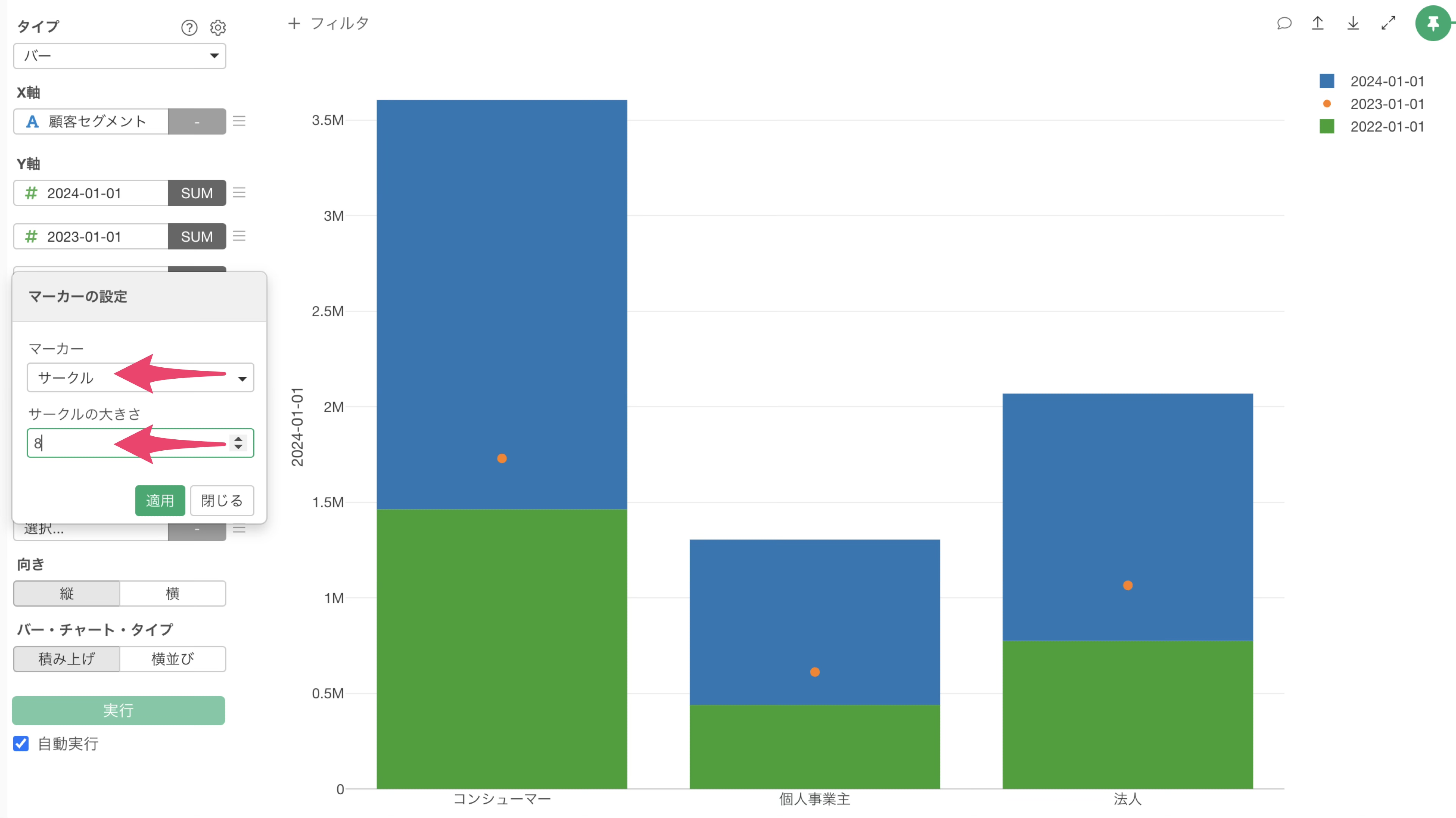 マーカーの設定ダイアログが開いたら、マーカーにサークルを選択し、サークルの大きさを任意のものに設定して、適用ボタンをクリックします。