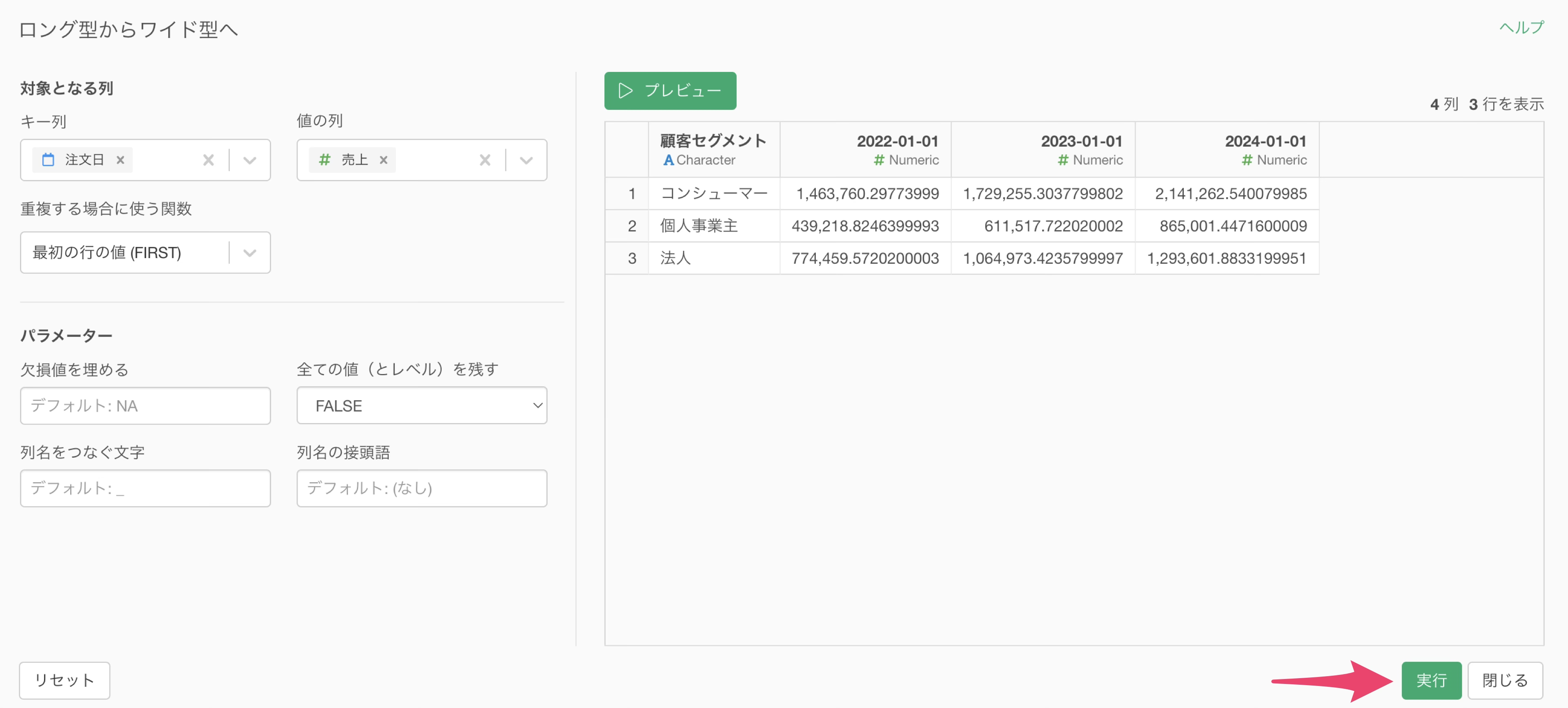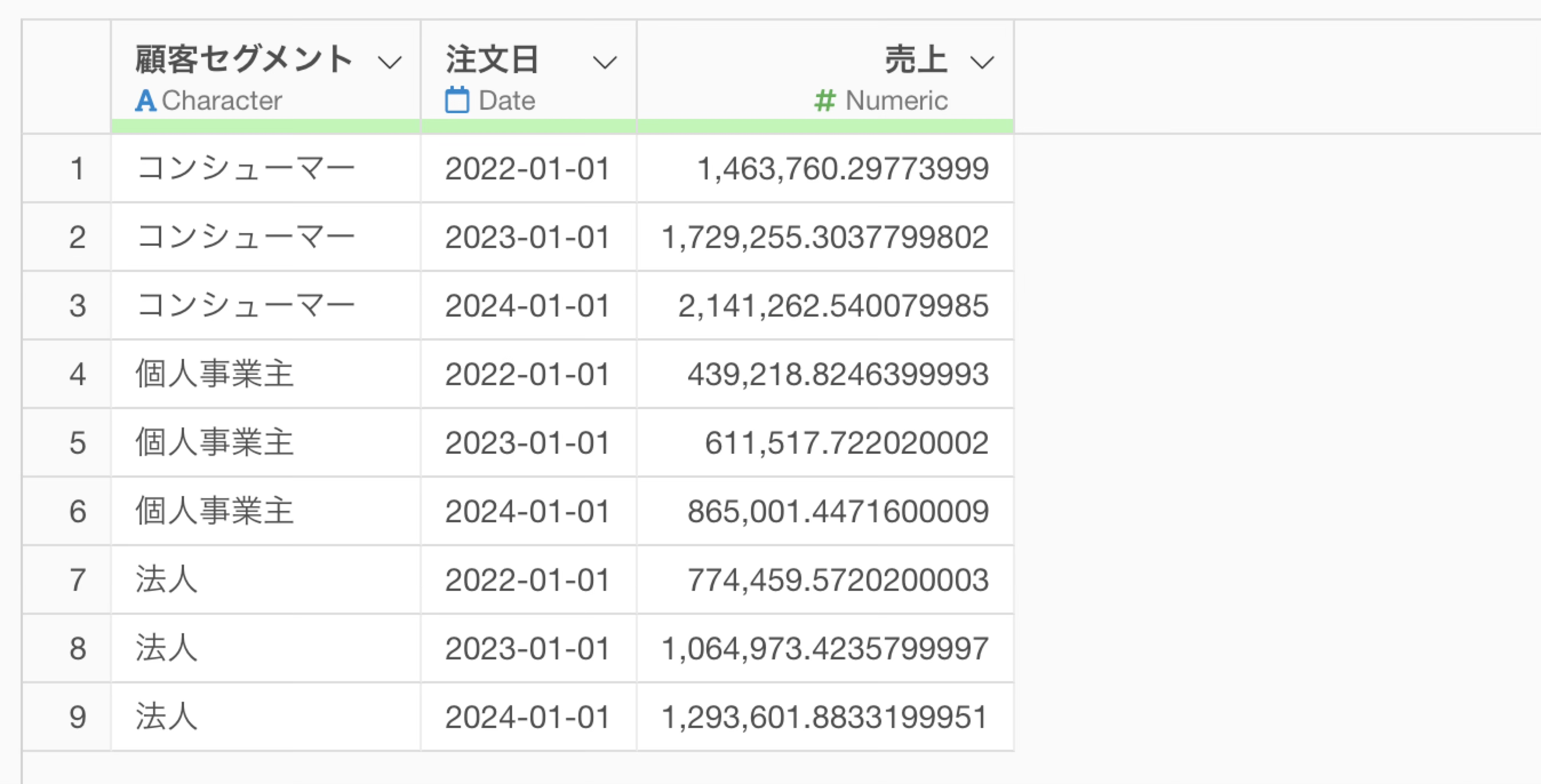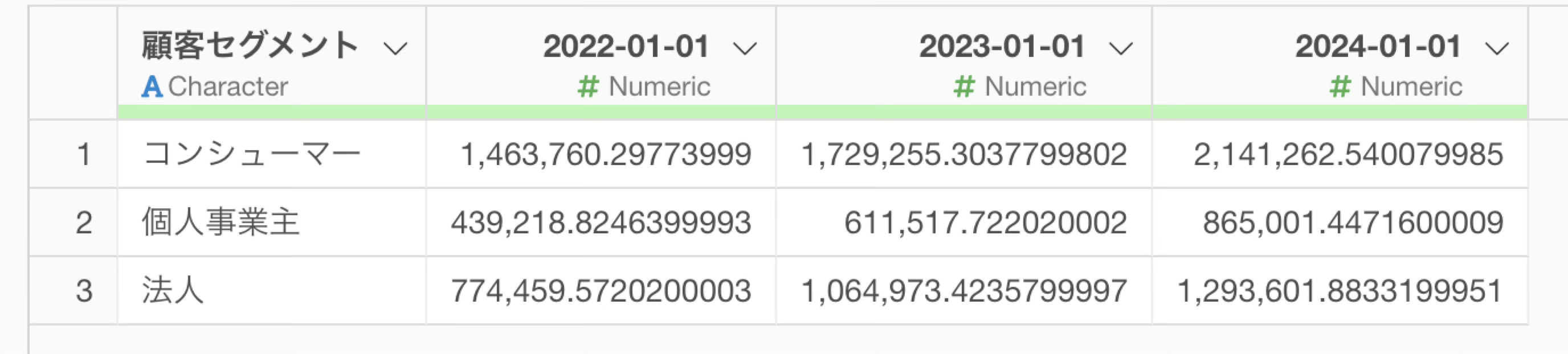 1行が1つのカテゴリー(顧客セグメント)を表し、列には各年の売上の情報を持つワイド型のデータに変換できました。