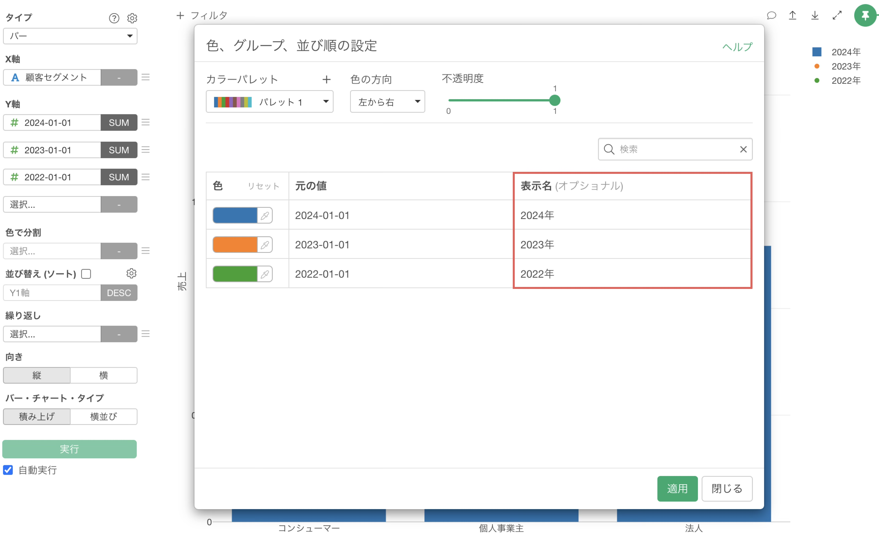 タイトルはデフォルトでは列名になっているため、任意の値に変更して、適用ボタンをクリックします。