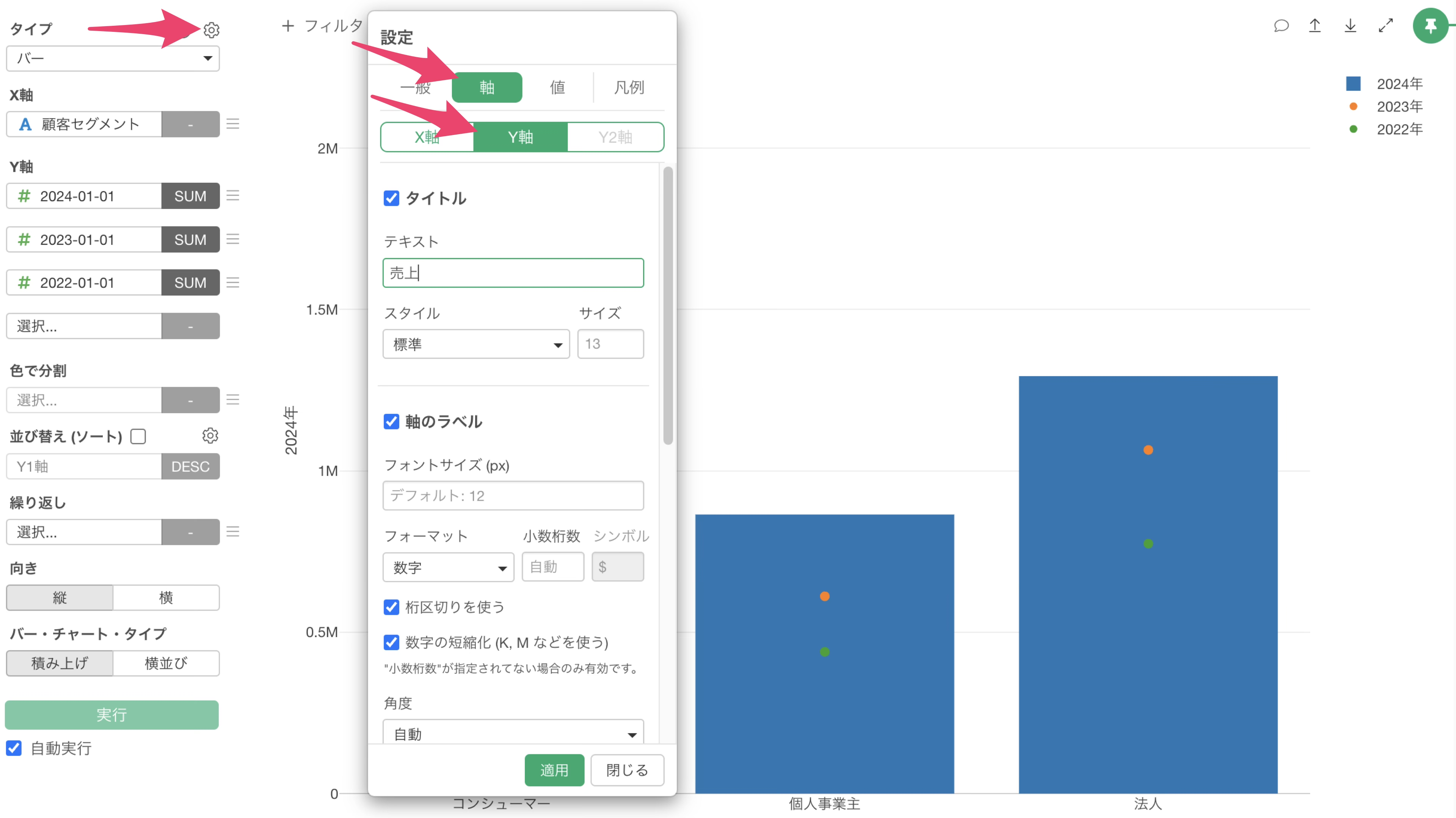 今回は一番最新の2024年の売上を基準に設定していきたいので、Y軸には2024年のデータを選択します。