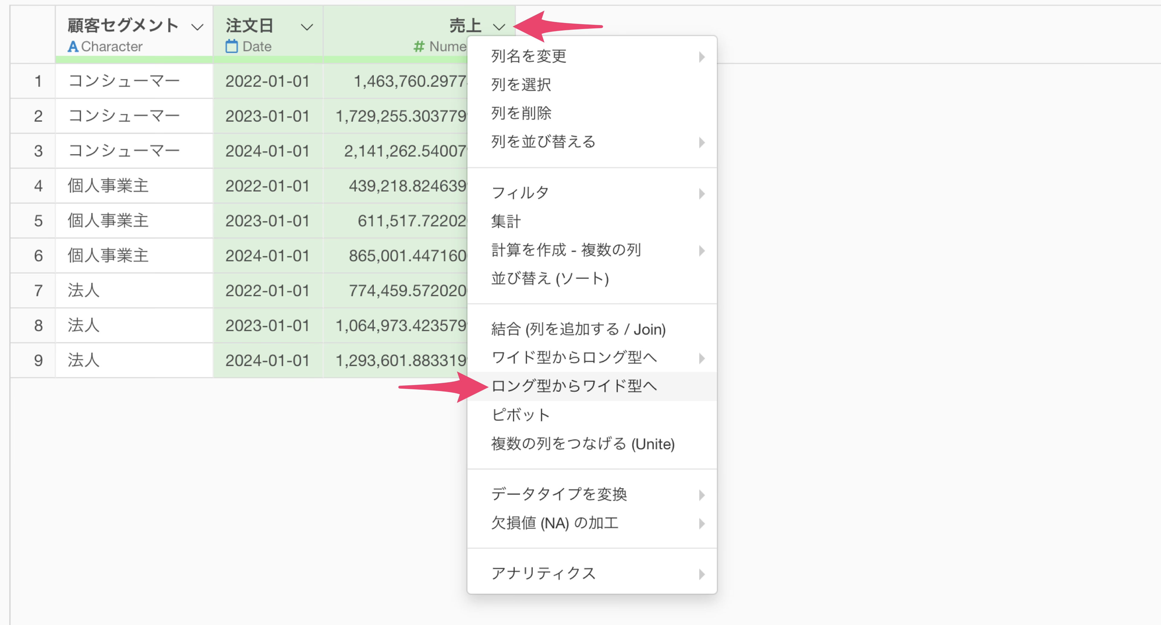 注文日と売上の列を複数選択した状態で、列ヘッダーメニューから「ロング型からワイド型へ変換」を選択します。