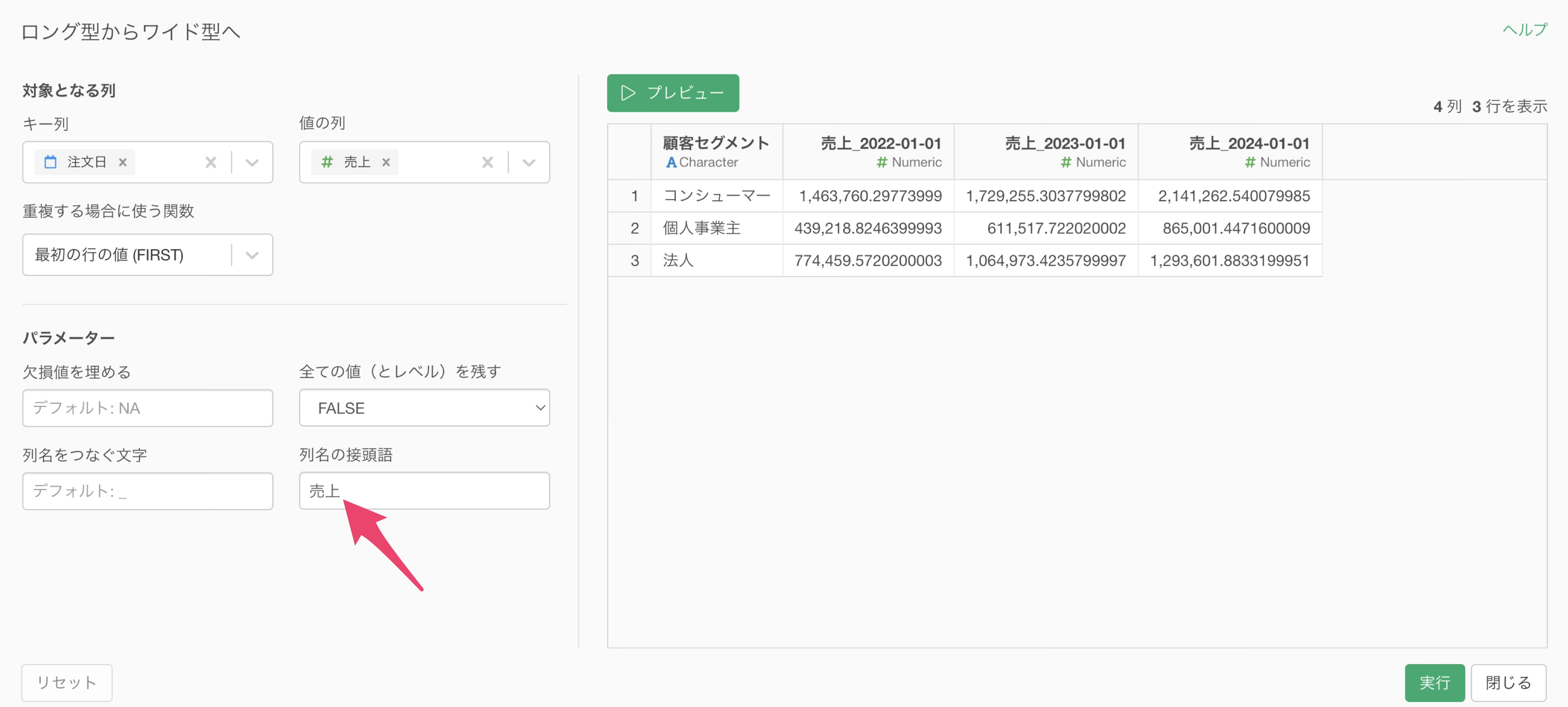 なお、列名に接頭語を追加したい場合、列名の接頭後に任意のテキストを入力することが可能です。