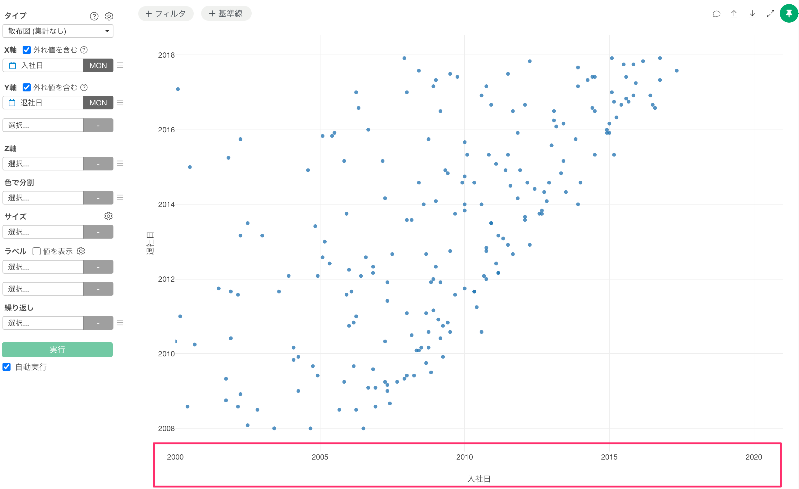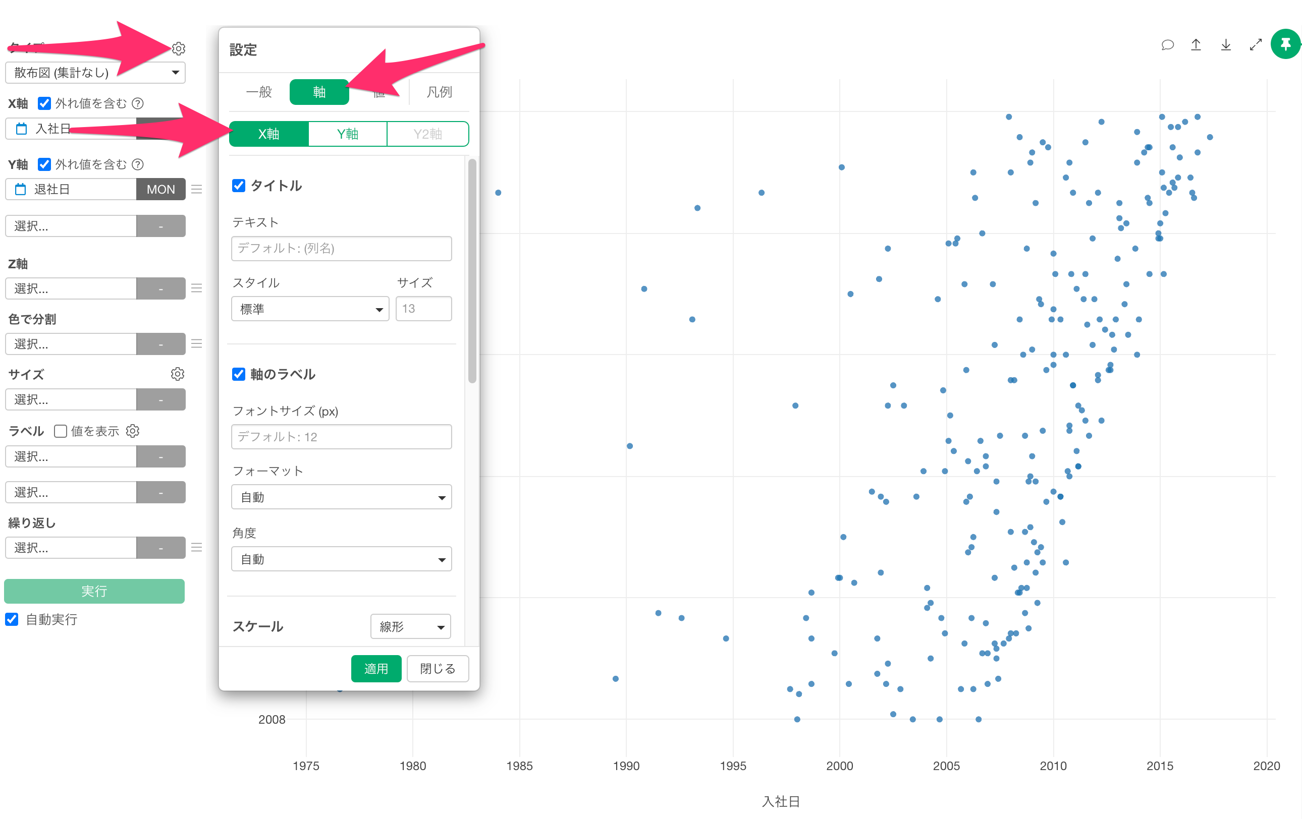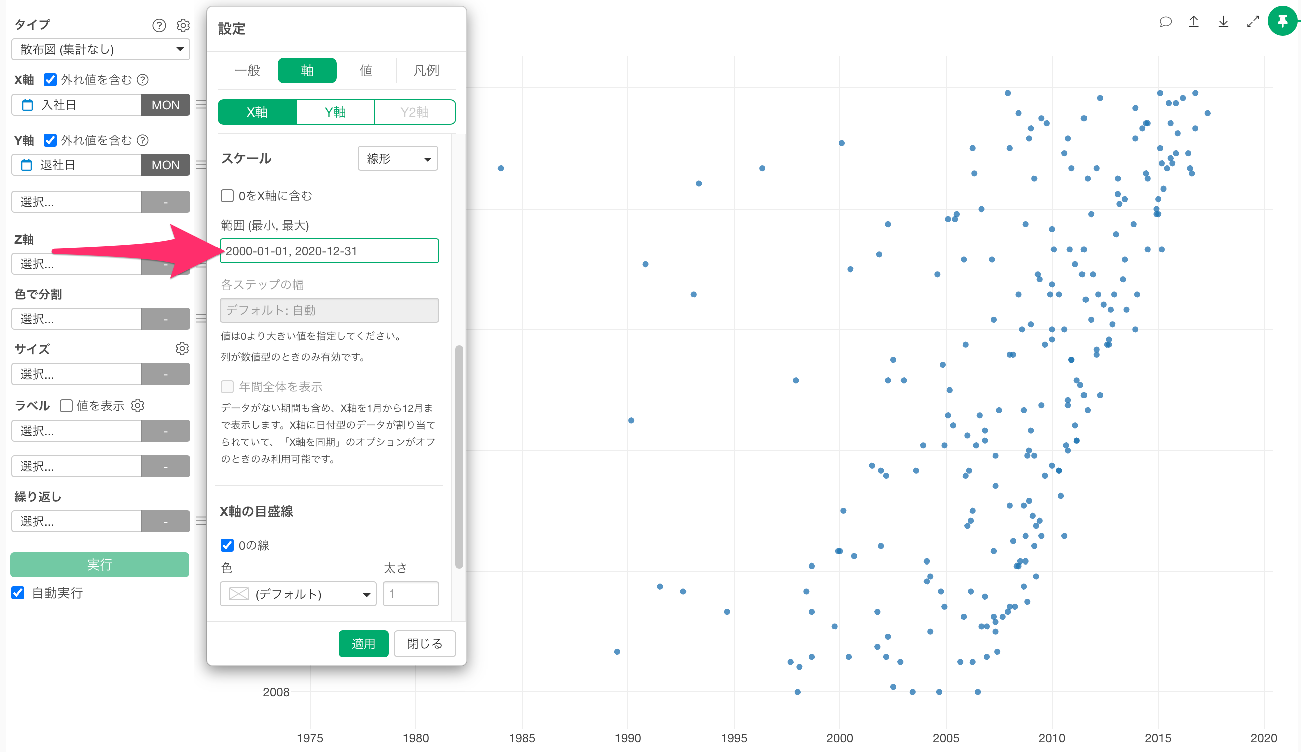 Exploratory デスクトップのv14.5から、散布図のX軸またはY軸に、Date(日付)型やPoSIXct(日付時間)型の列を選択したときに、チャート設定で軸の表示範囲(期間)を指定できるようになりました。