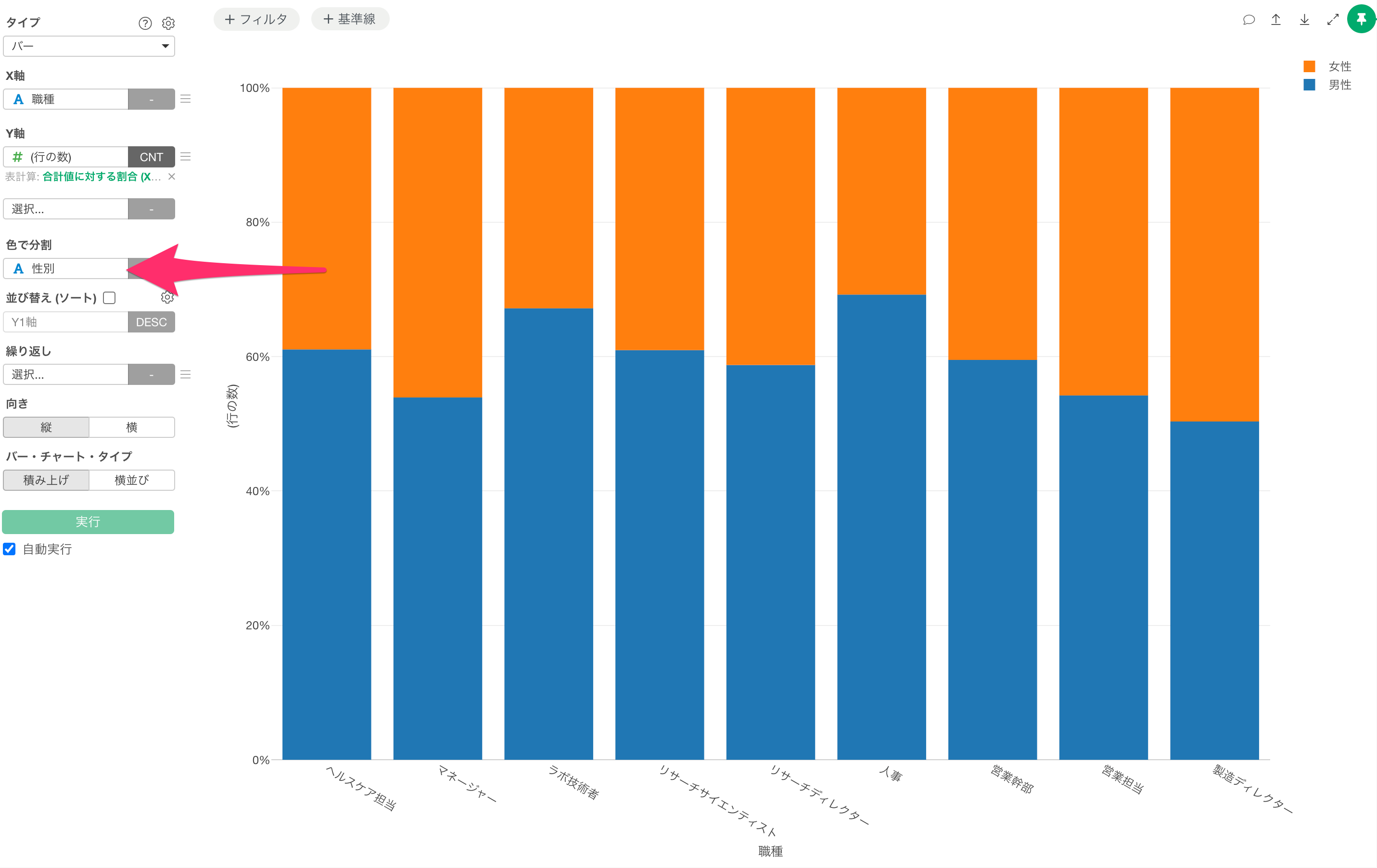 Exploratoryでは、チャート作成時に「色で分割」の機能を使って、選択した列のカテゴリーごとにチャートを可視化することが可能です。