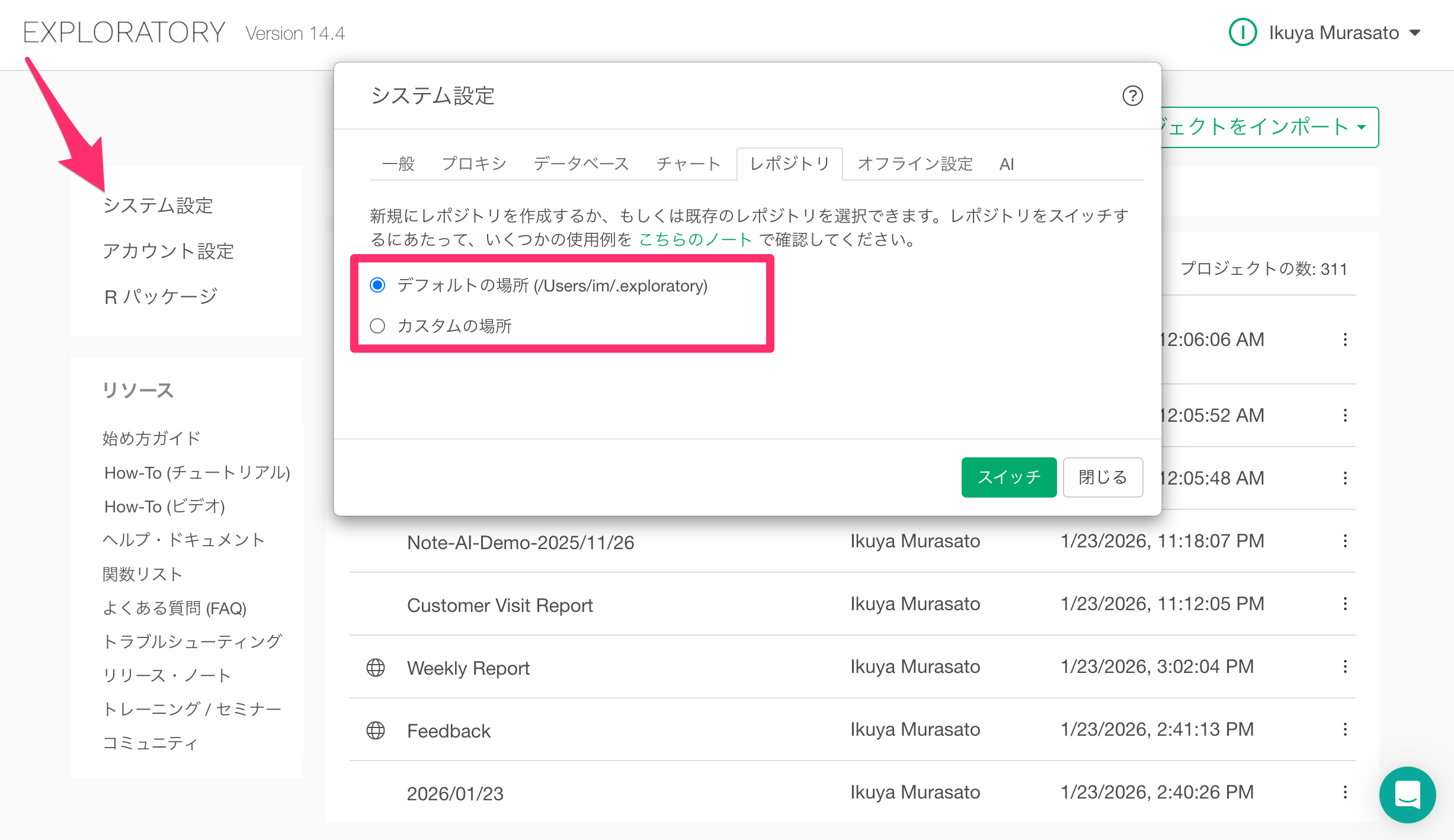 現在、利用しているレポジトリの場所がわからない場合は、Exploratoryデスクトップの「アカウント設定」のレポジトリのタブから、現在利用されているレポジトリの場所を確認いただけます。