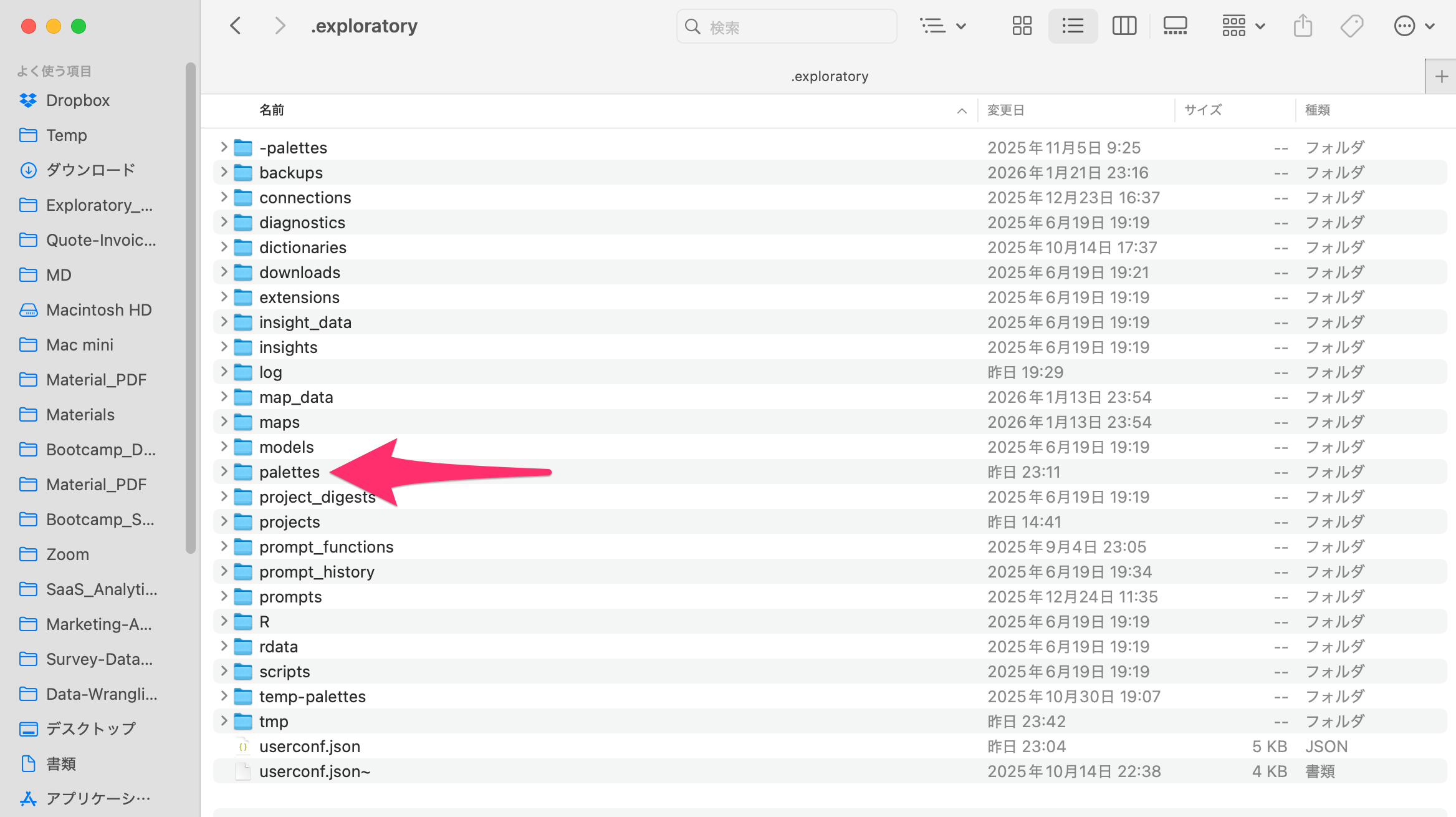 Exploratoryは1つ1つのカスタムカラーパレットをJSONの1つのファイルとして管理しているため、自身で管理しているパレットの情報があれば、UIを利用せずにJSONファイルを使って、複数のカスタムカラーパレットを一気に追加することができます。