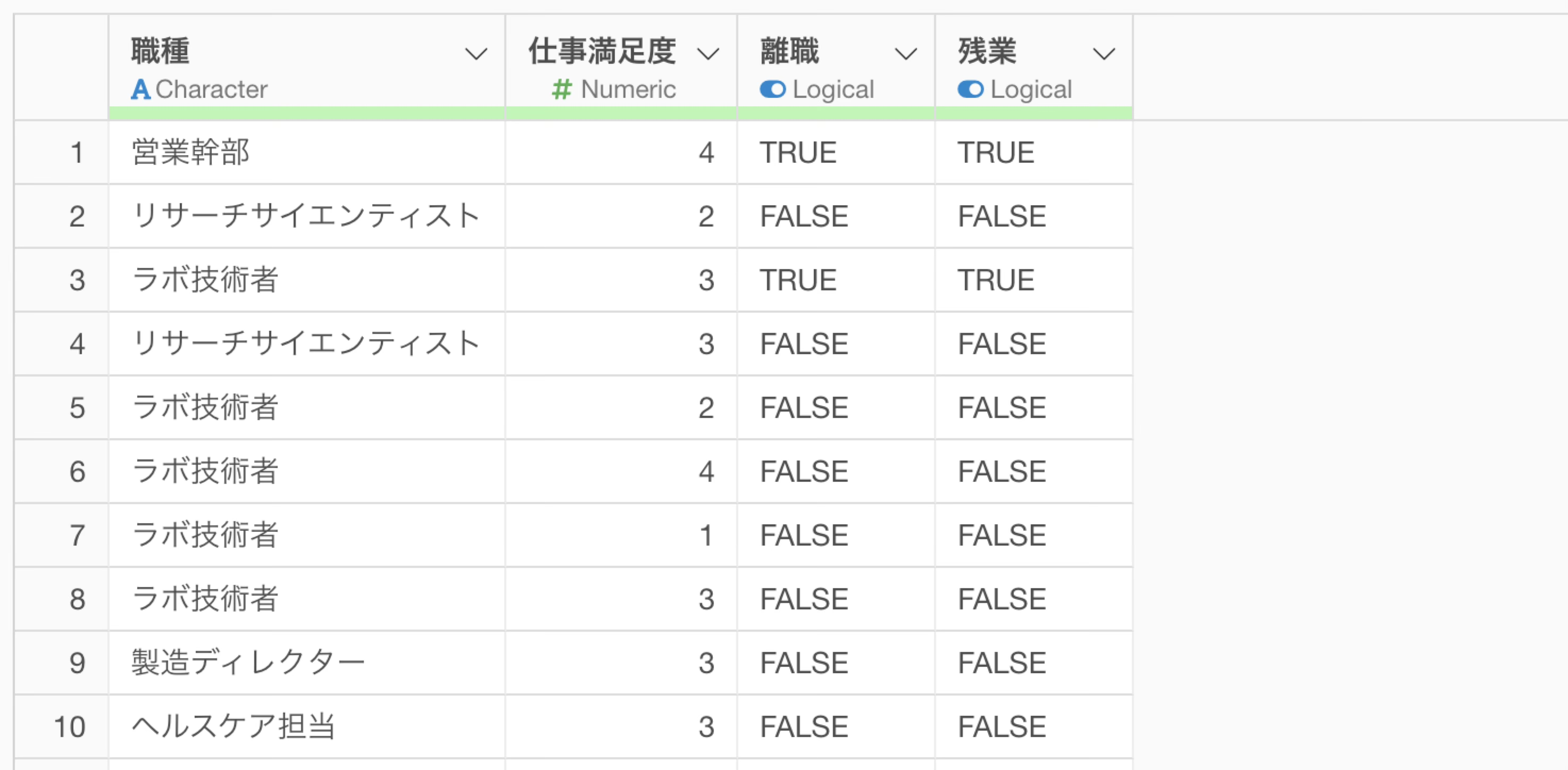 今回は以下のように1行が従業員を表すようなデータを使って、列には各従業員の属性情報を持つデータを使い従業員のデータを使って説明をしていきます。