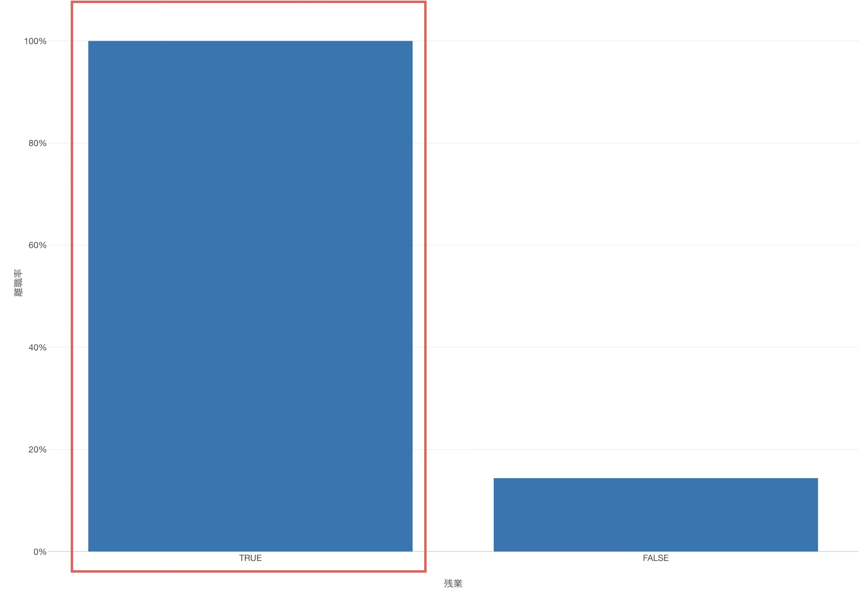 このようなときに、よく起こっていることは、説明変数がTRUEの人(今回の例で言うと残業する人)は、全員が目的変数もTRUE(離職する)である一方で、説明変数がFALSEの人は目的変数がTRUEだったりFALSEだったりする、というような構造です。