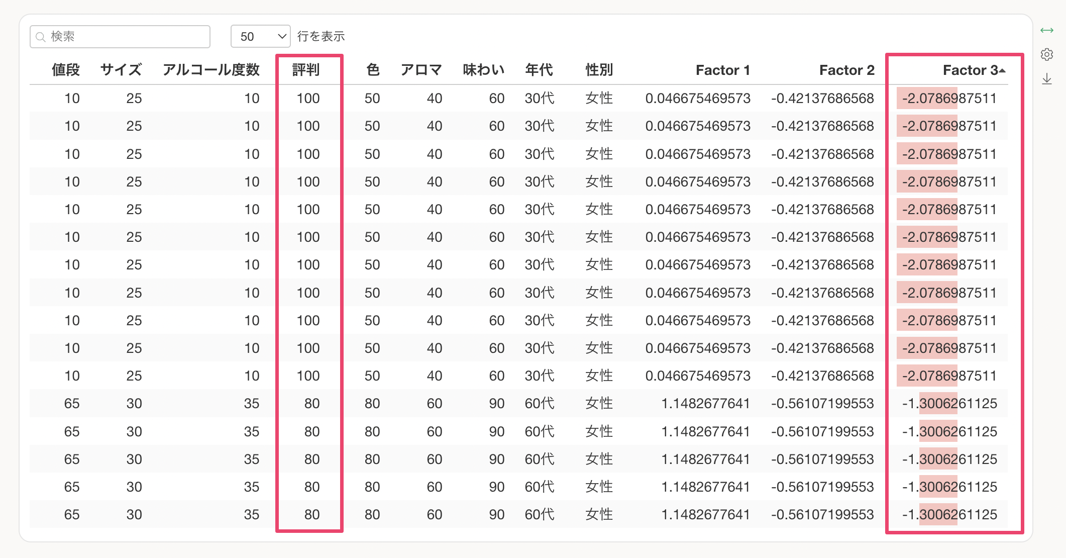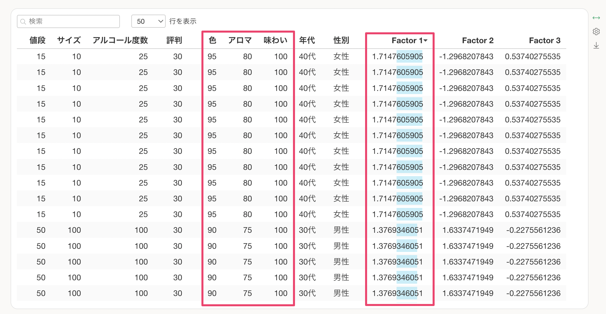 因子分析のデータのセクションにある「Factor 1 ~ Factor 3」はそれぞれのデータに対する因子得点の値となっています。