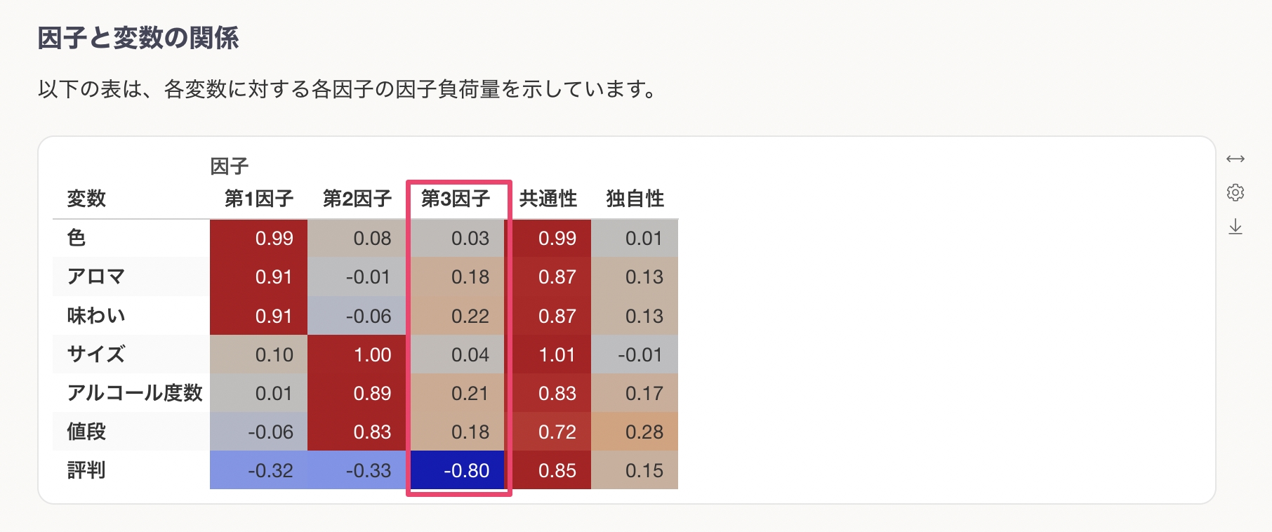 因子と変数の関係のセクションの下には、因子ごとの各変数の因子負荷量(因子が変数に与える影響の強さ)のテーブルが表示されます。なお、因子負荷量は−1から1の間の値をとり、−1または1に近づくほど、各因子がそれぞれの変数に与える影響が強いと言えます。