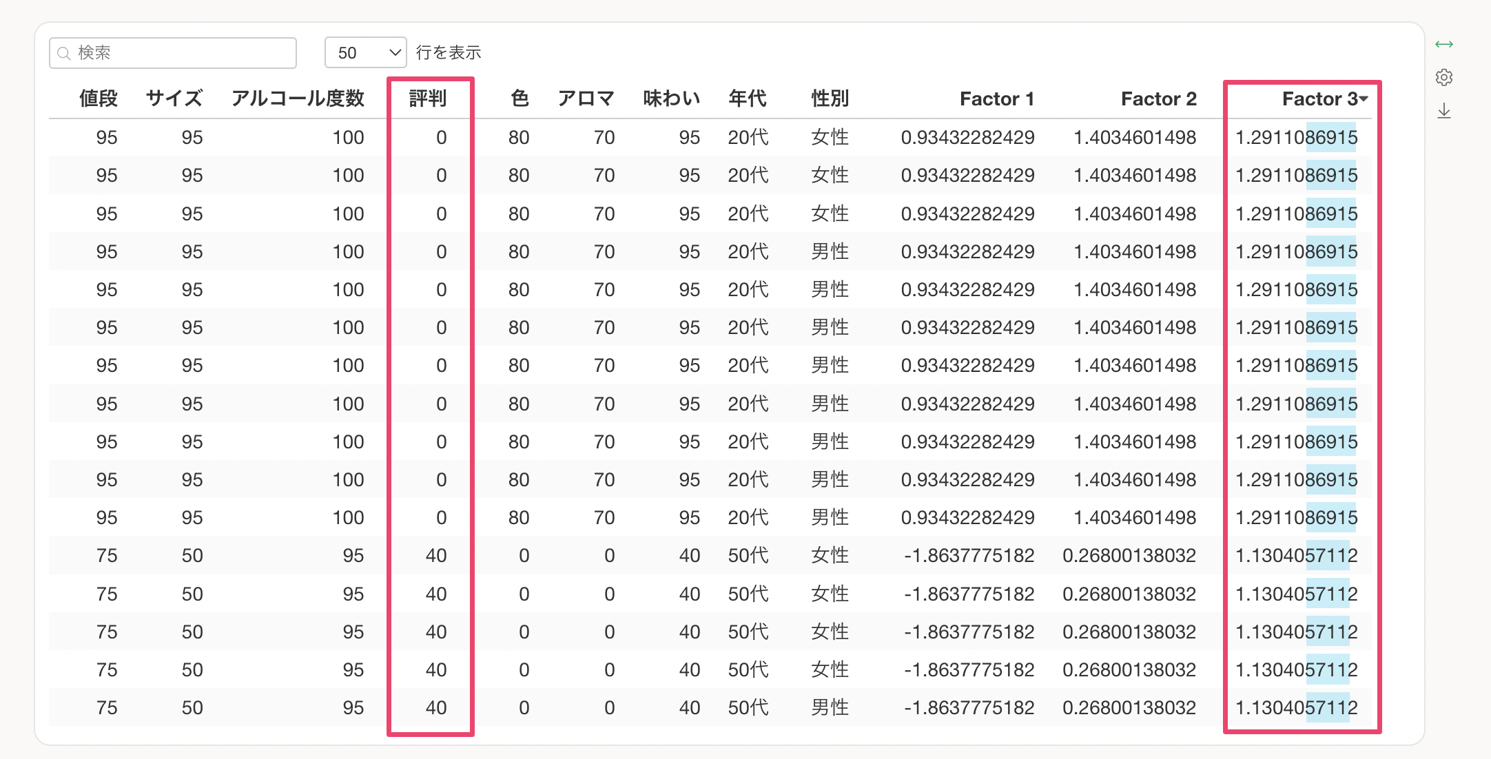 データのセクションでは、元のデータとそれぞれの行(観察対象)に対する因子得点(Factor 1 ~ Factor 3)を確認できます。特定の因子得点が高い場合、その因子の影響が強いと言えます。