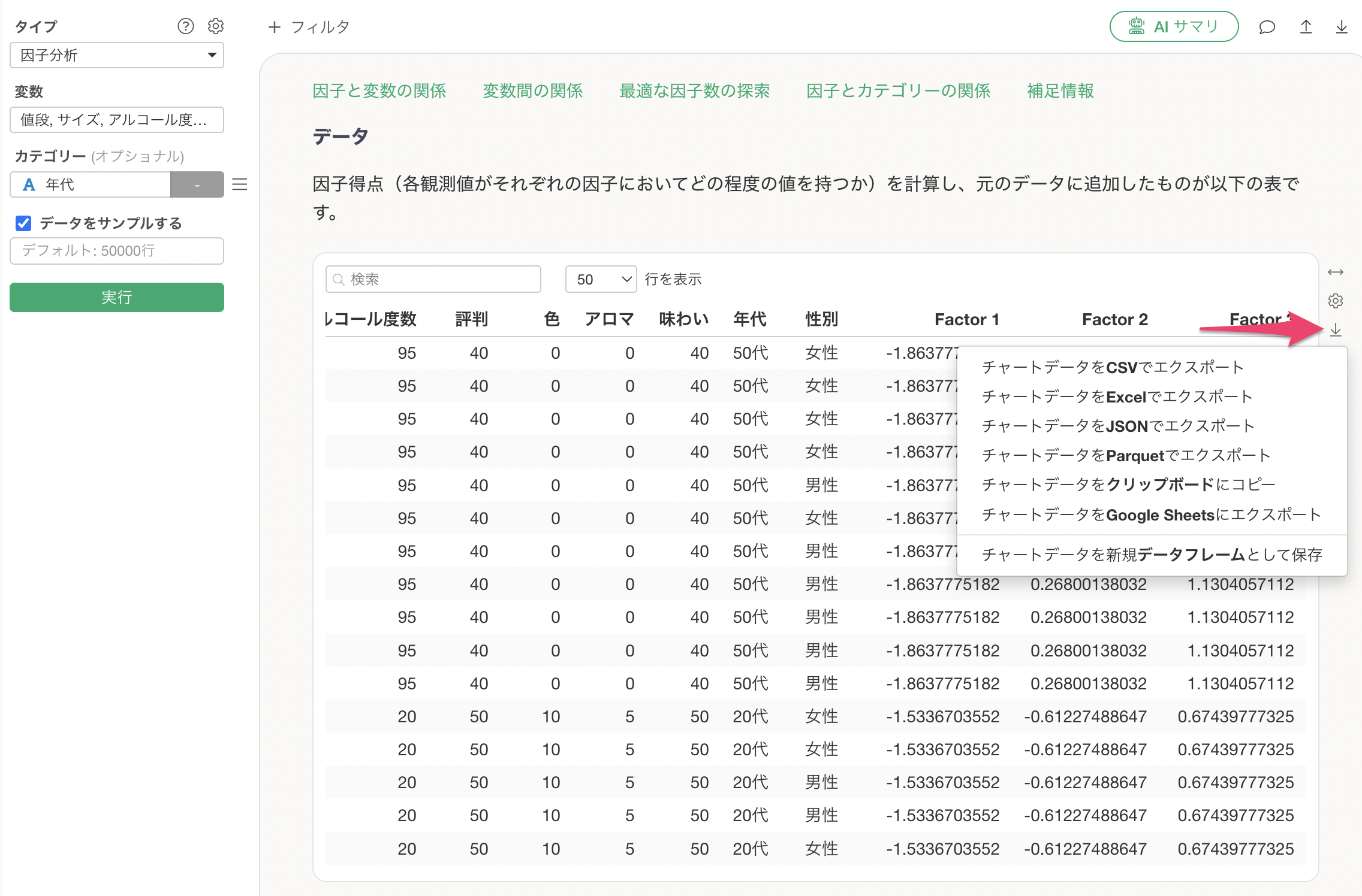 観察対象(行)ごとの因子得点についてですが、以下のようにデータのセクションのテーブルからデータをエクスポートしていただくことで、因子得点を含めたデータをダウンロードすることが可能となっています。