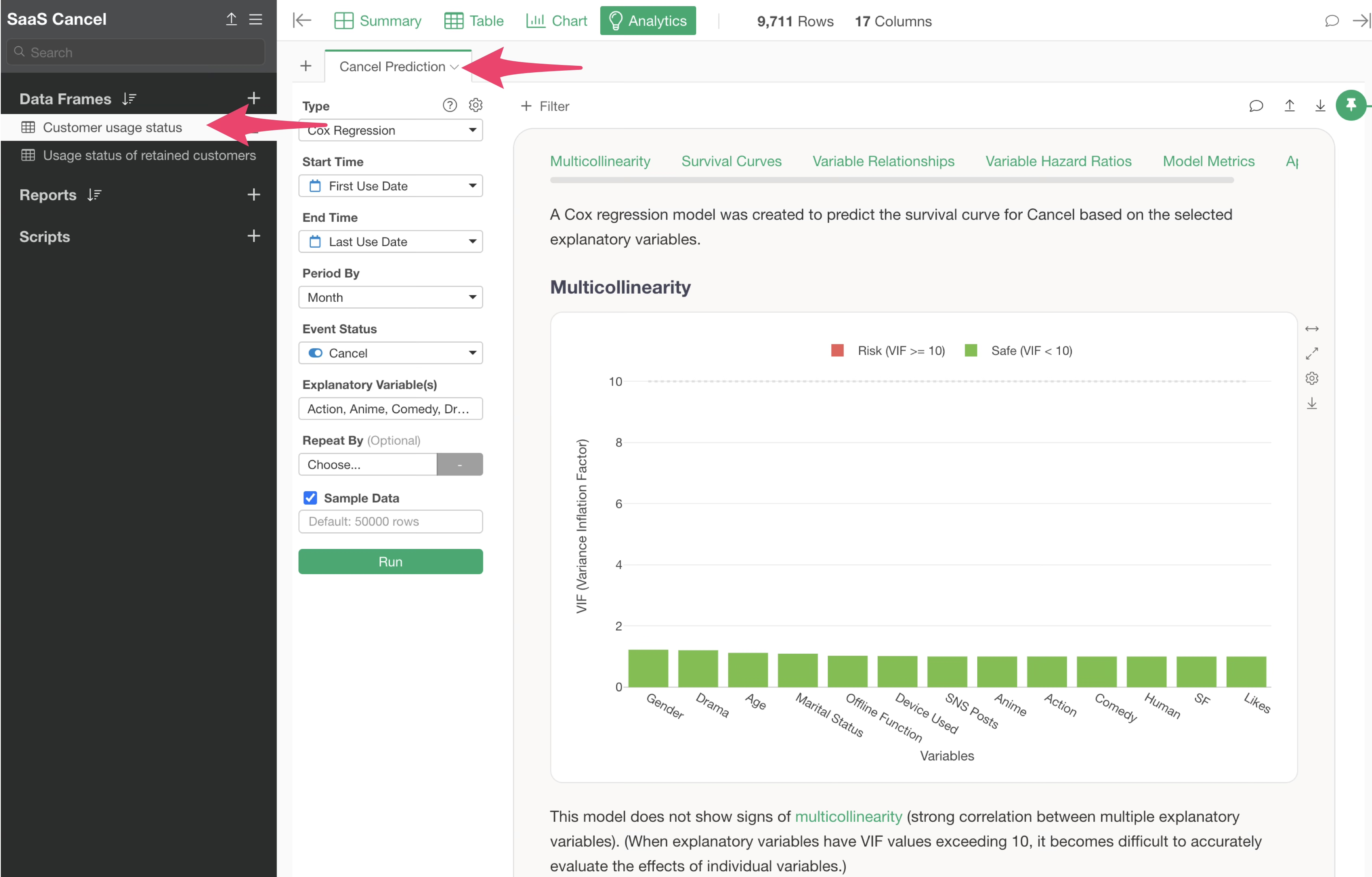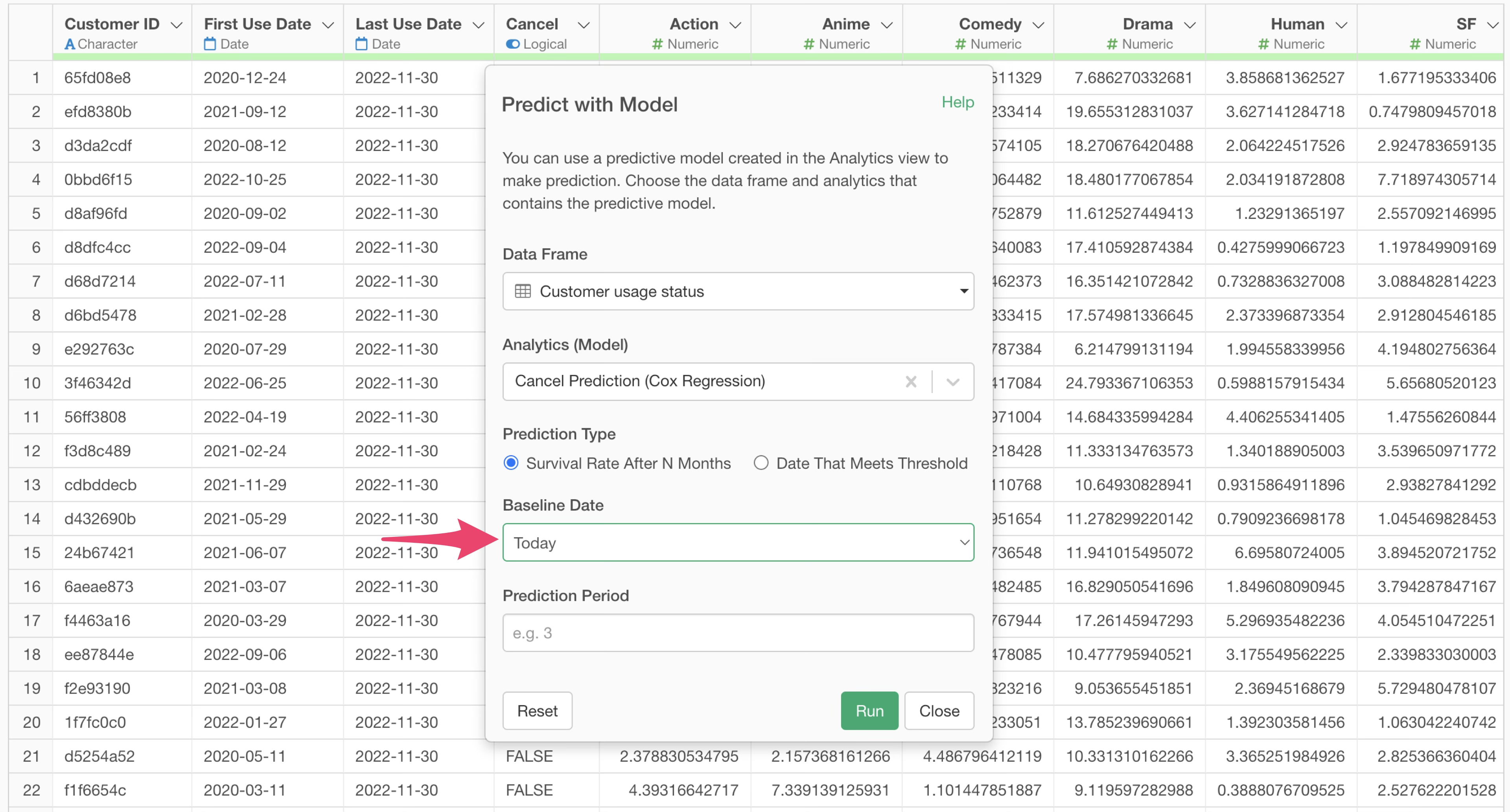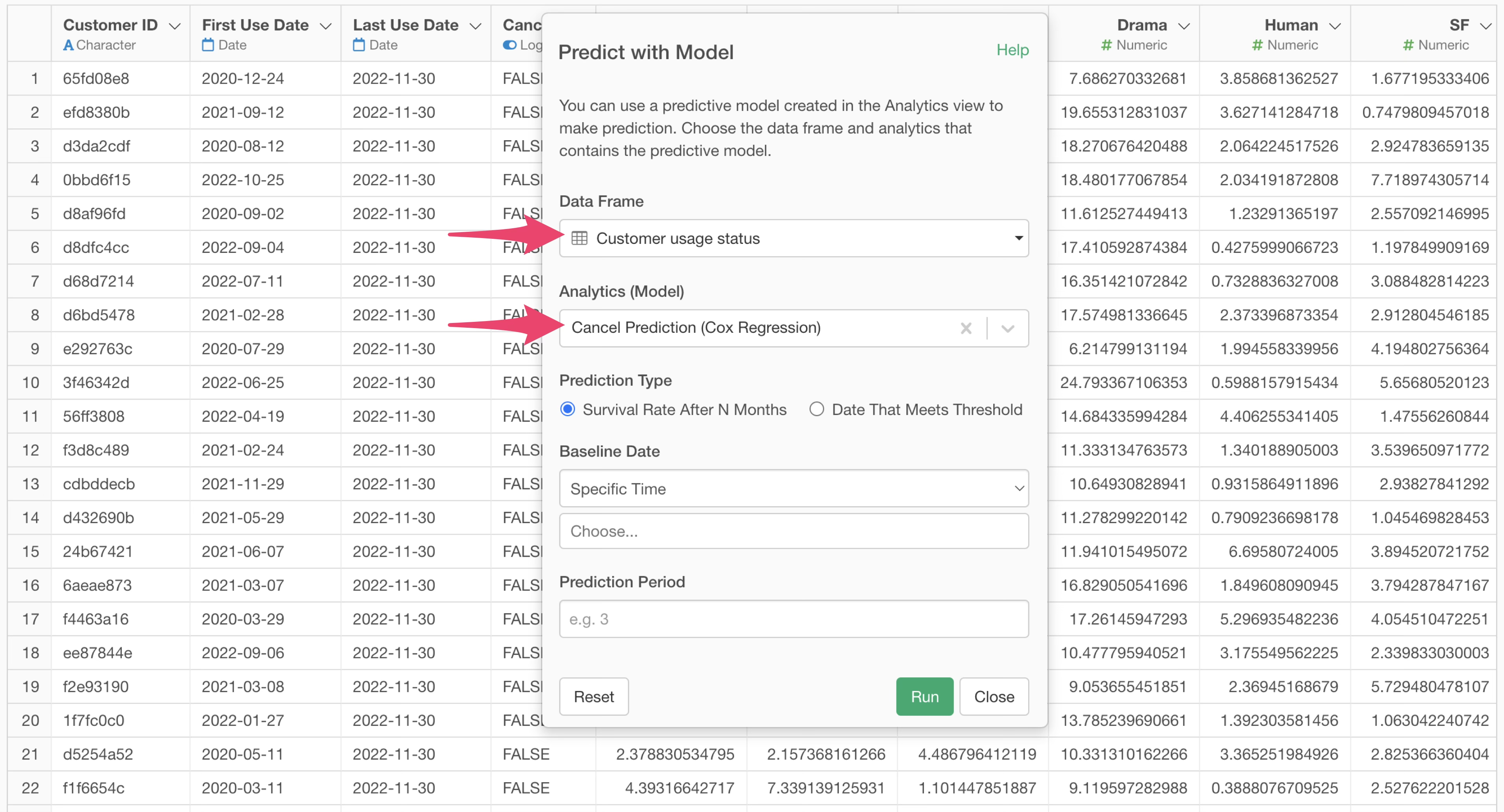 In the model selection dialog, specify the data frame where your model was created. Here, we select the “Customer usage status” data frame and then choose the pre-built survival analysis model from the Analytics Model list.