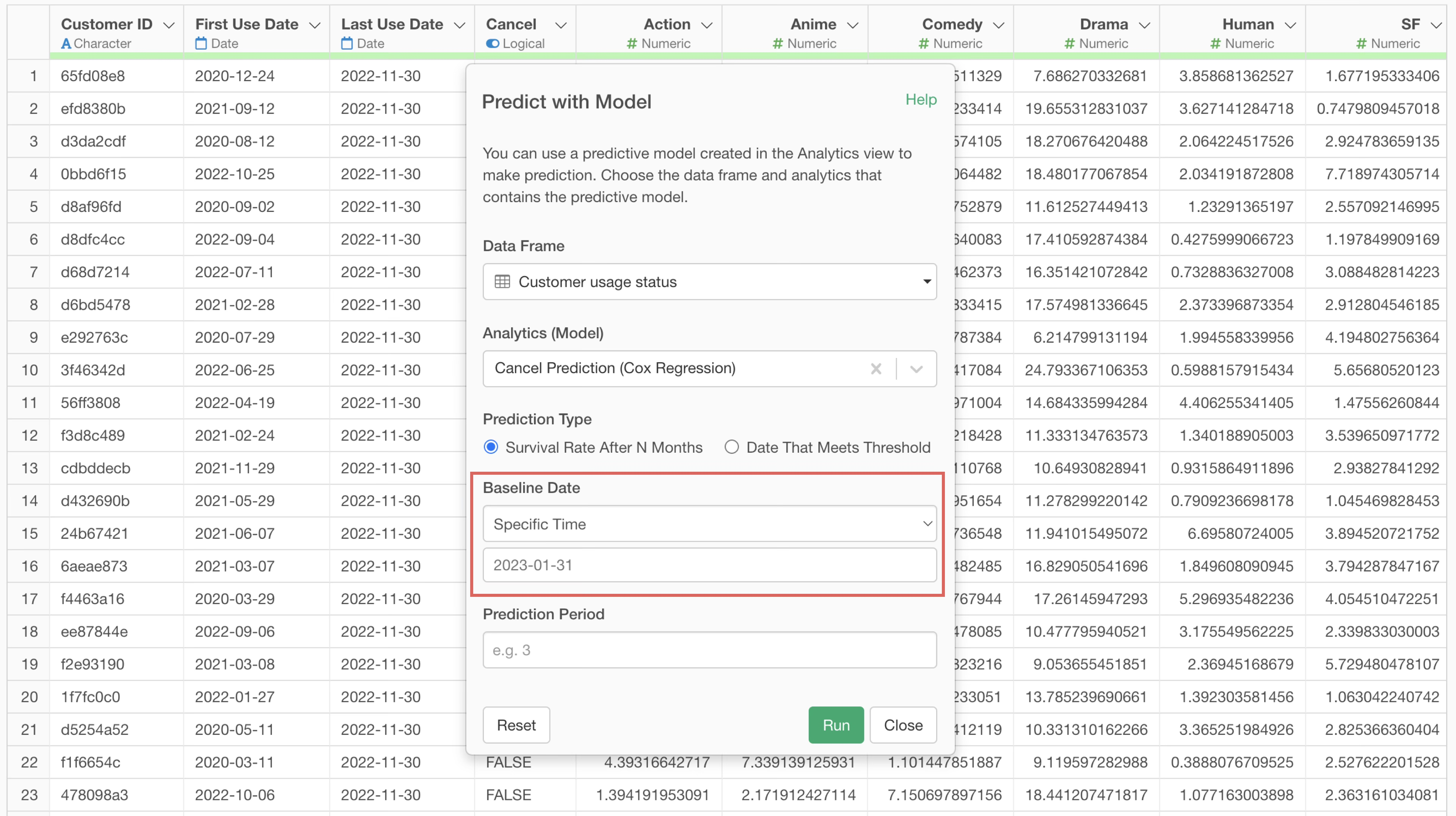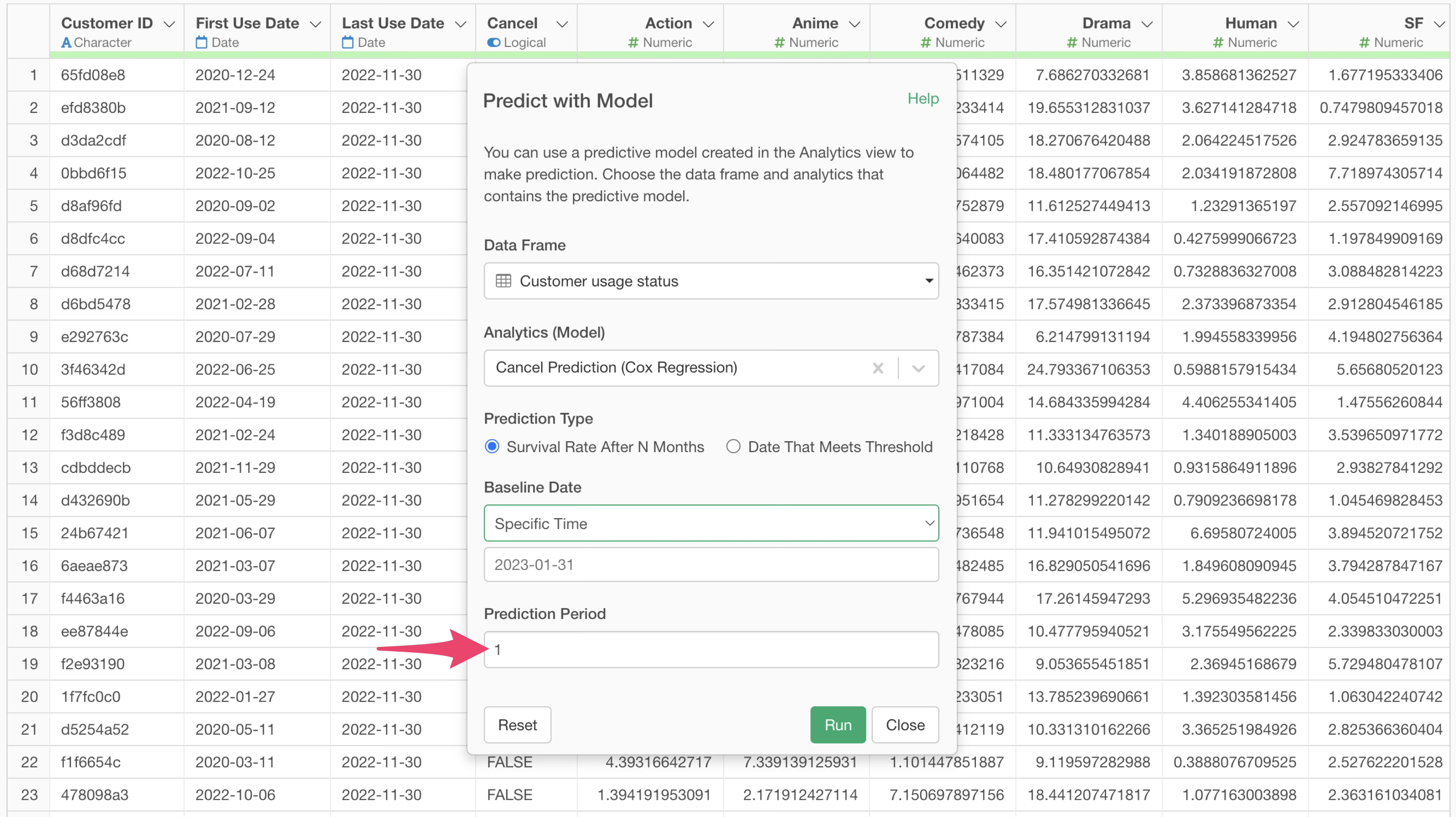 Since we want to calculate the survival probability one month from the baseline date, enter “1” in the prediction period and click the “Run” button.