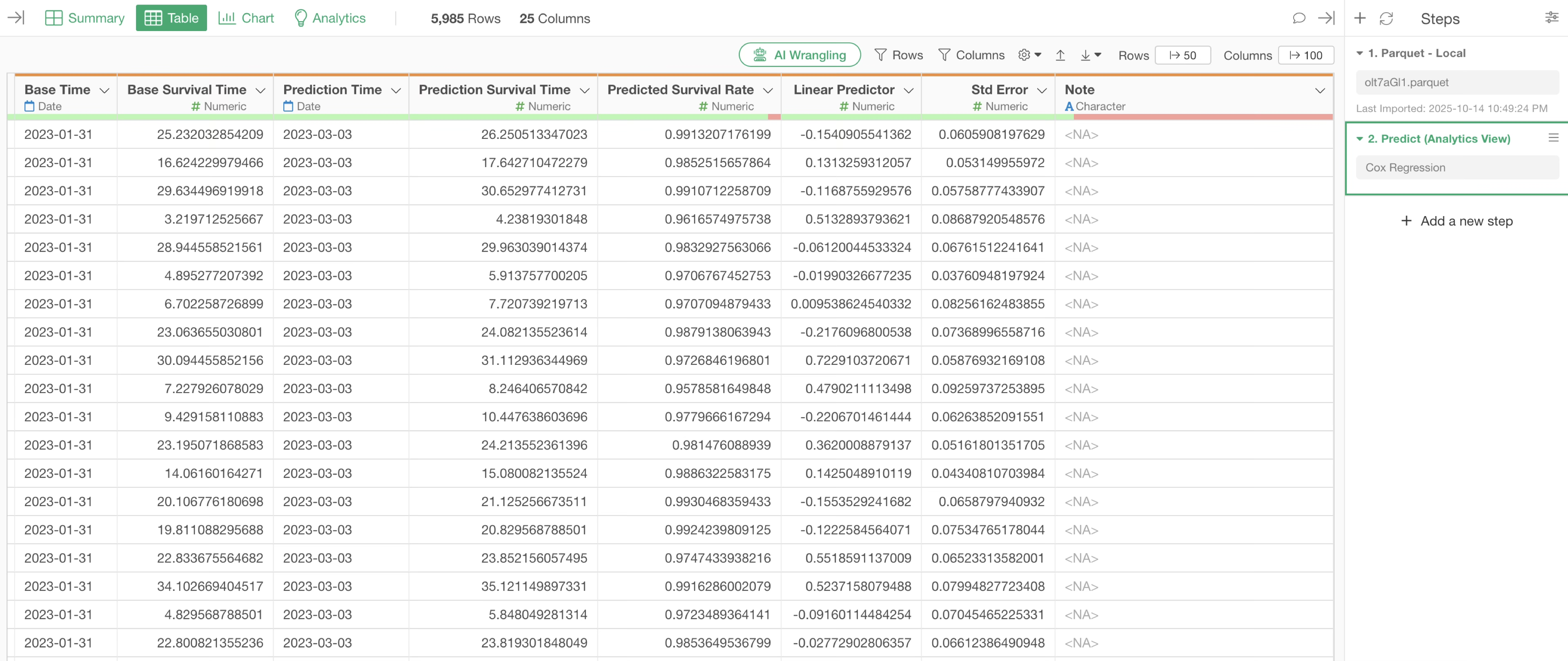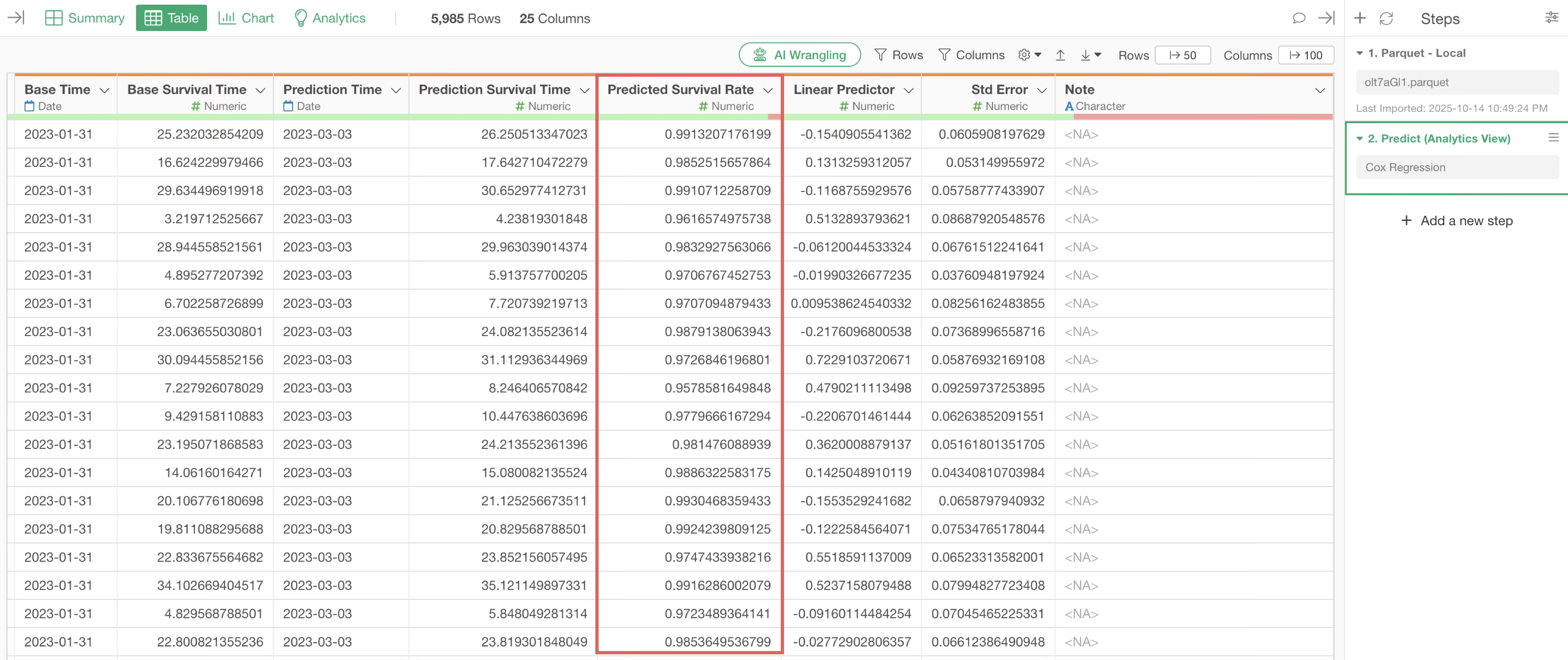 After the prediction is complete, a new prediction step is added, along with several orange-highlighted columns.