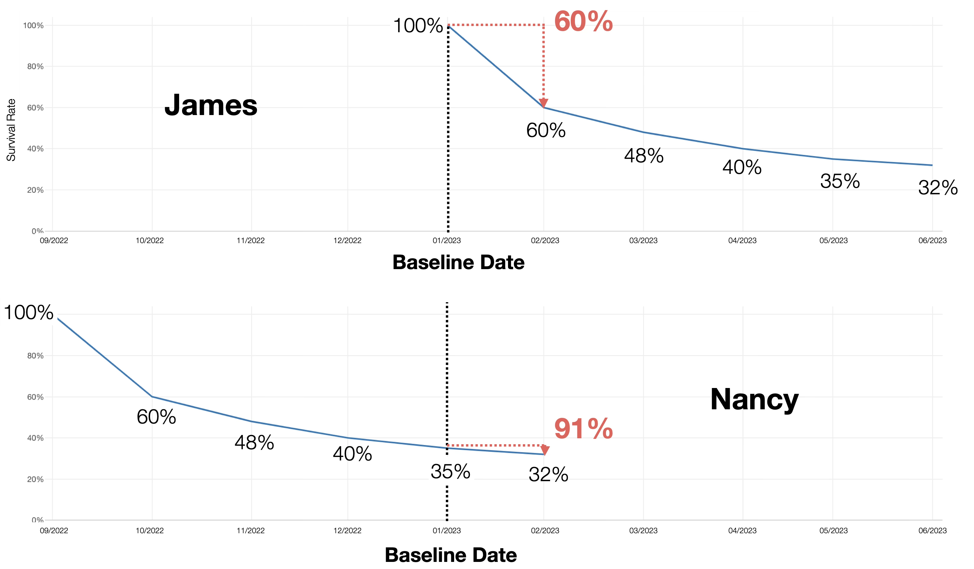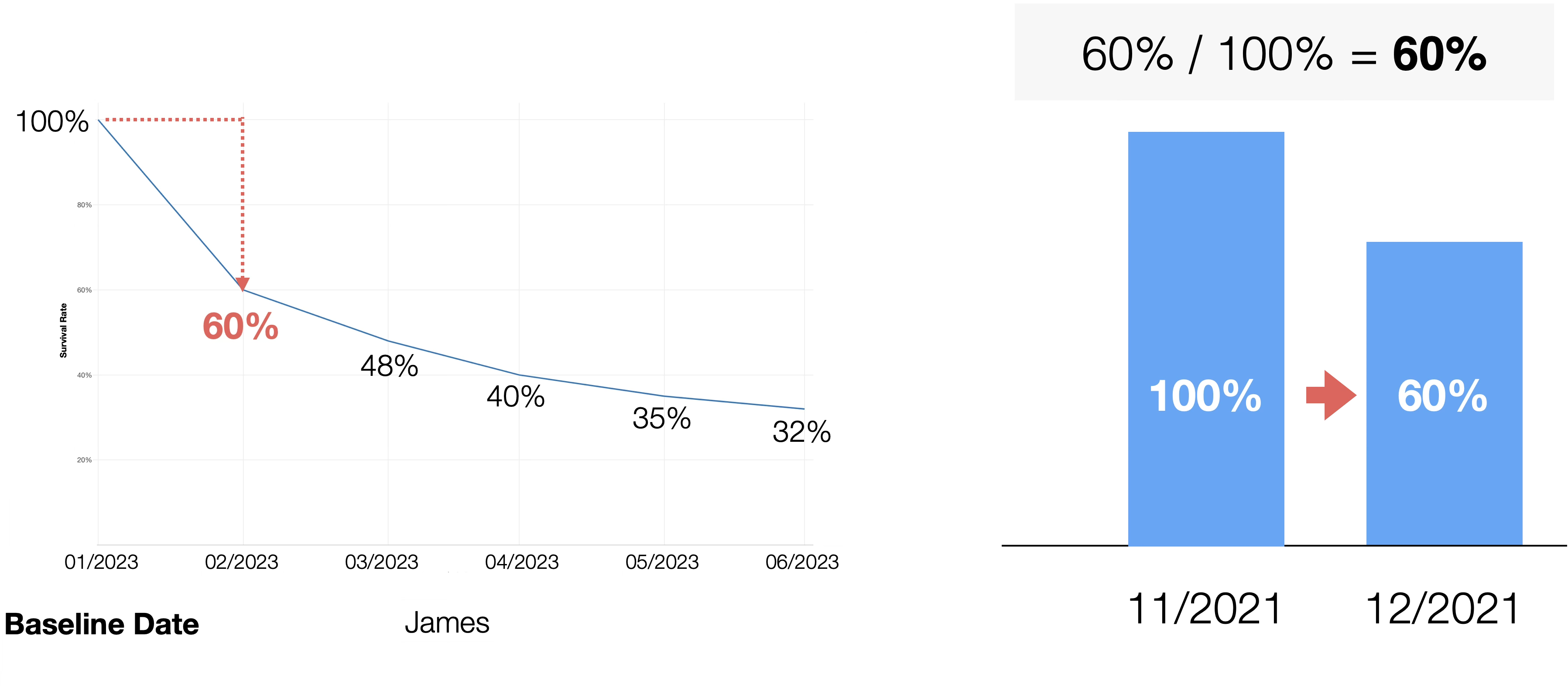 For example, if James started using the service in January 2023, and his survival rate one month after the baseline date (January 31, 2023) is predicted to be 60%, this means an absolute survival rate of 60% one month after service start (a change from 100% to 60%).