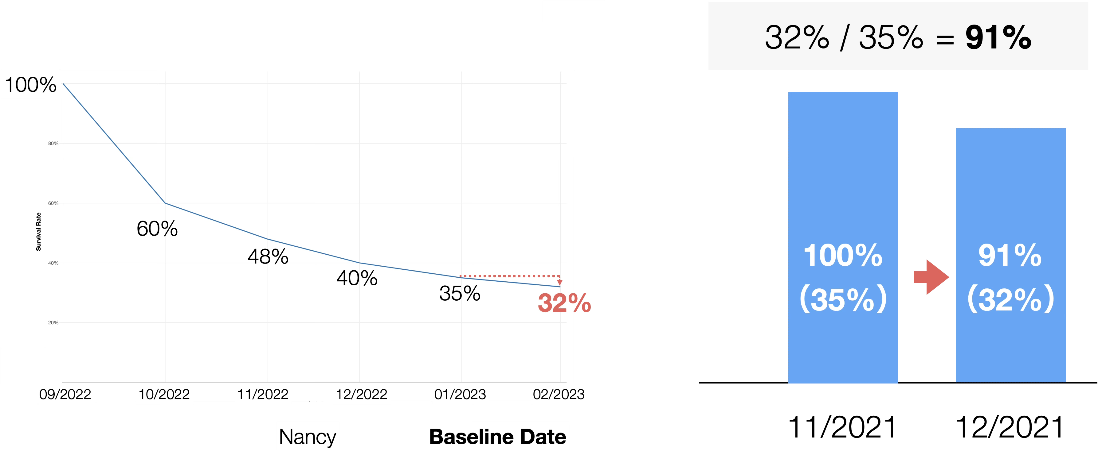 On the other hand, if Nancy started in September 2022 and has already been a customer for four months by the baseline date, his survival rate one month later is predicted to be 91%, assuming 100% survival at the baseline. This represents a change from 35% to 32% on the survival curve (32% / 35% = 91%).