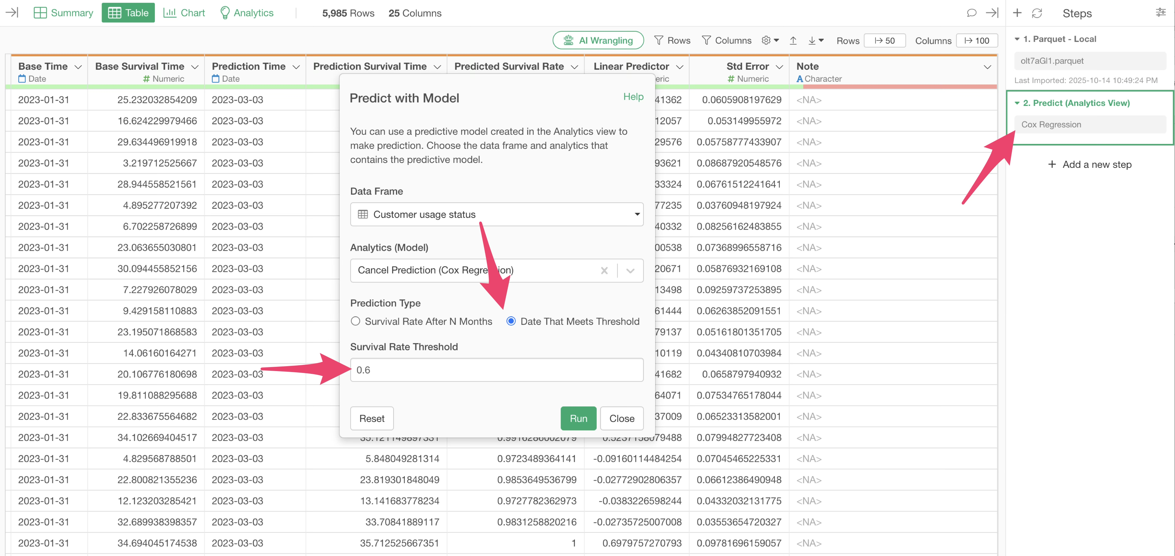 Reopen the prediction step, check “Date for Specific Survival Rate” as the prediction type, and enter “0.6” (60%) as the survival rate threshold.