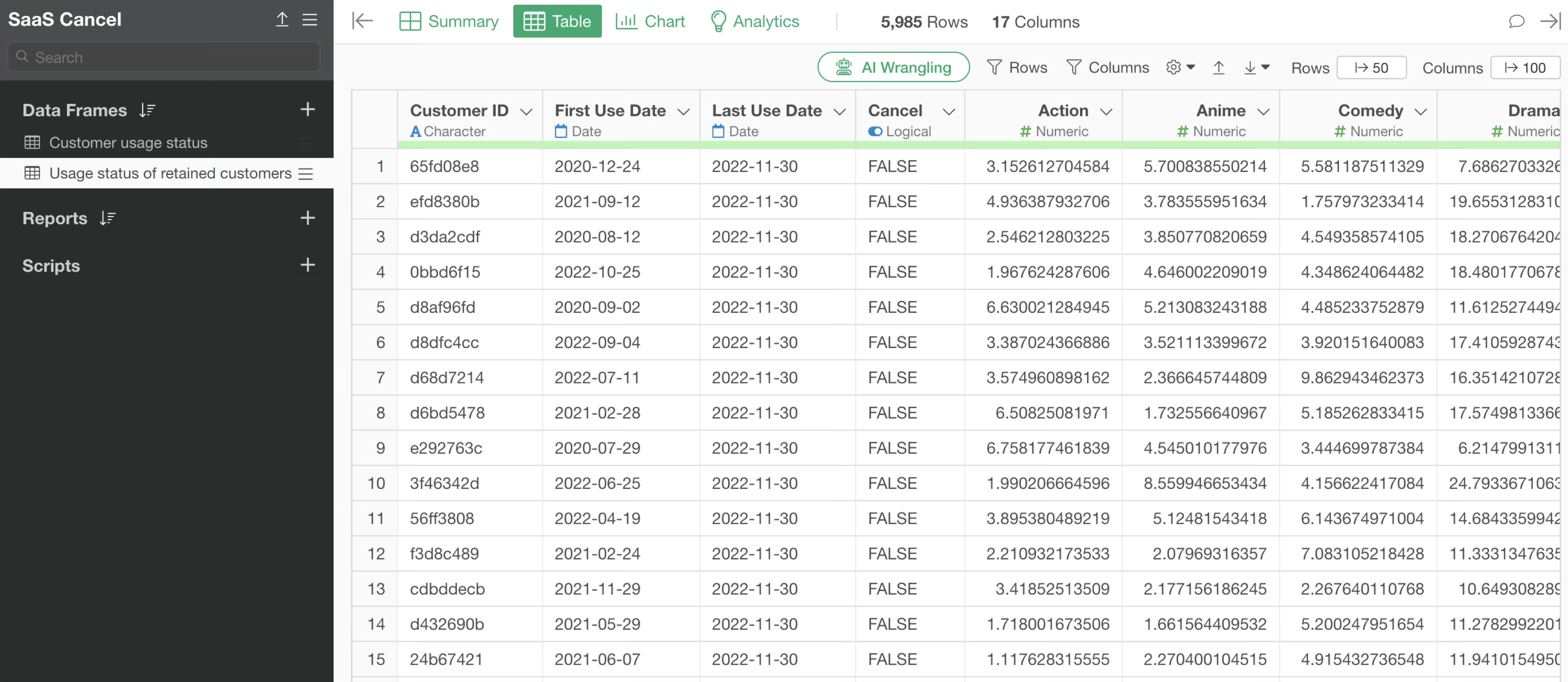 This dataset includes customer ID, First use date, Last use date, content viewing status, and customer cancelations. Since the data is for active subscribers, the Cancel flag is “FALSE” for all customers.