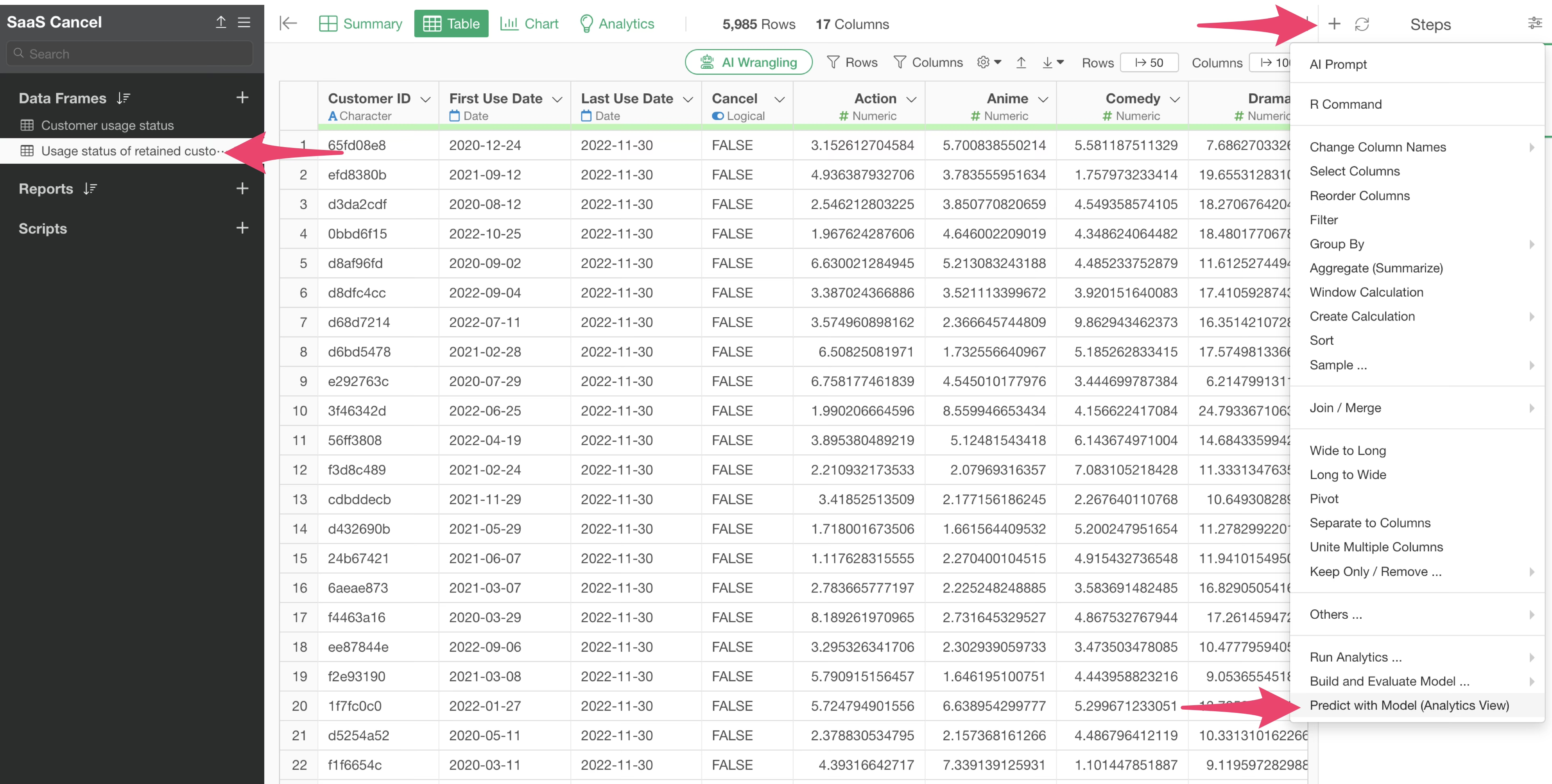 Click the step menu of your target data frame and select “Predict with Model (Analytics View).”