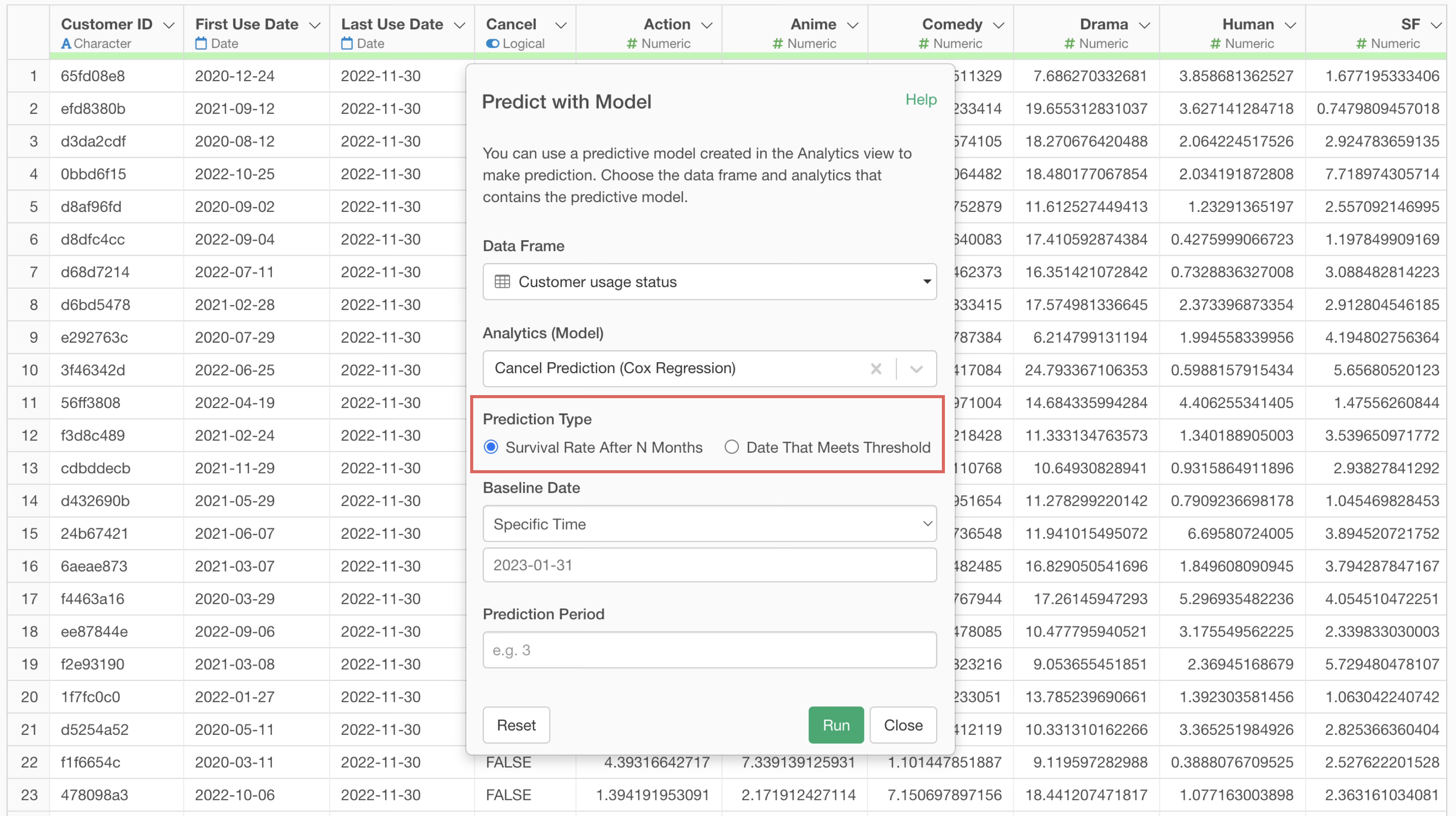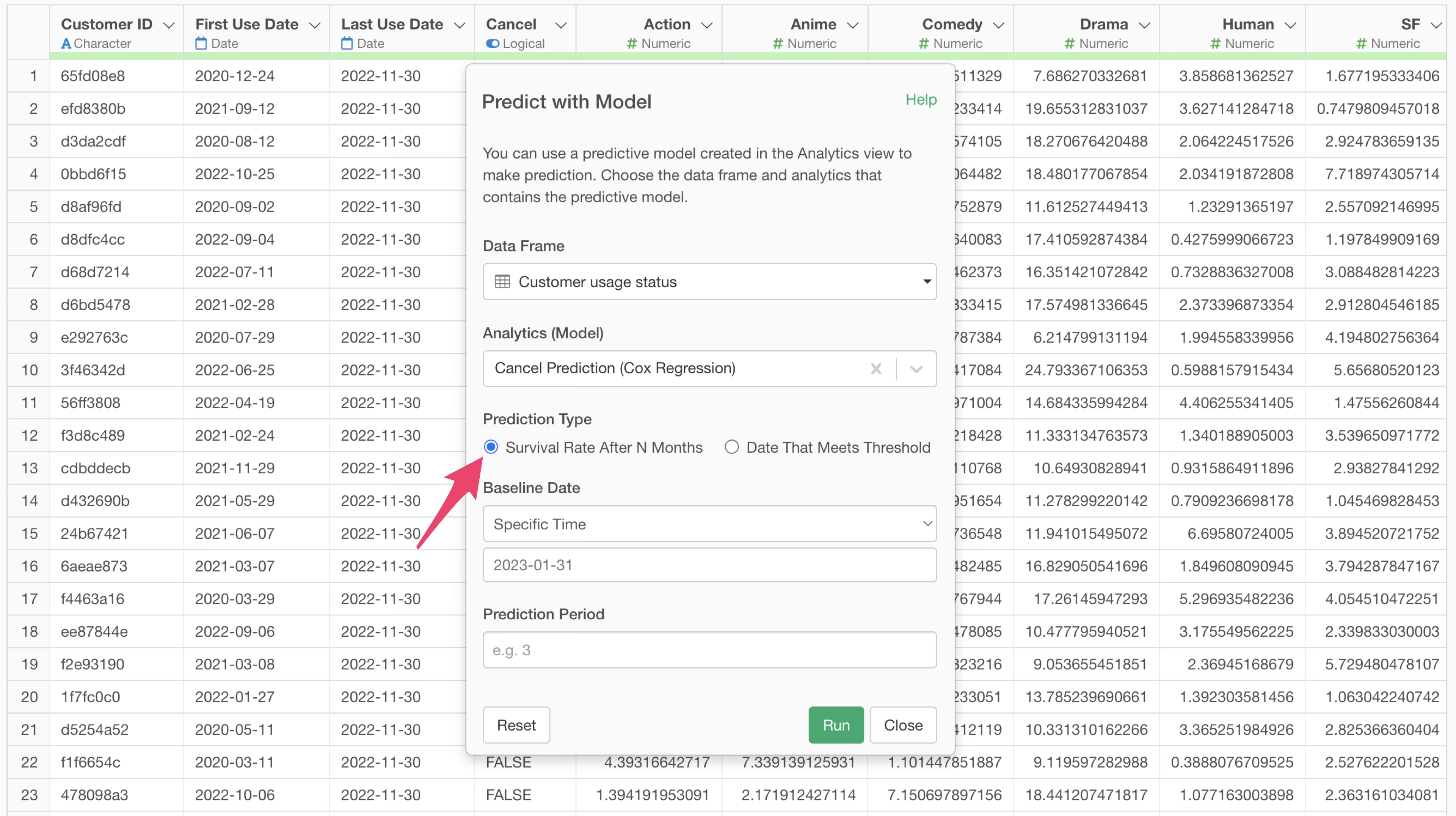 When you select a survival analysis model in “Analytics (Model),” two prediction type options appear.