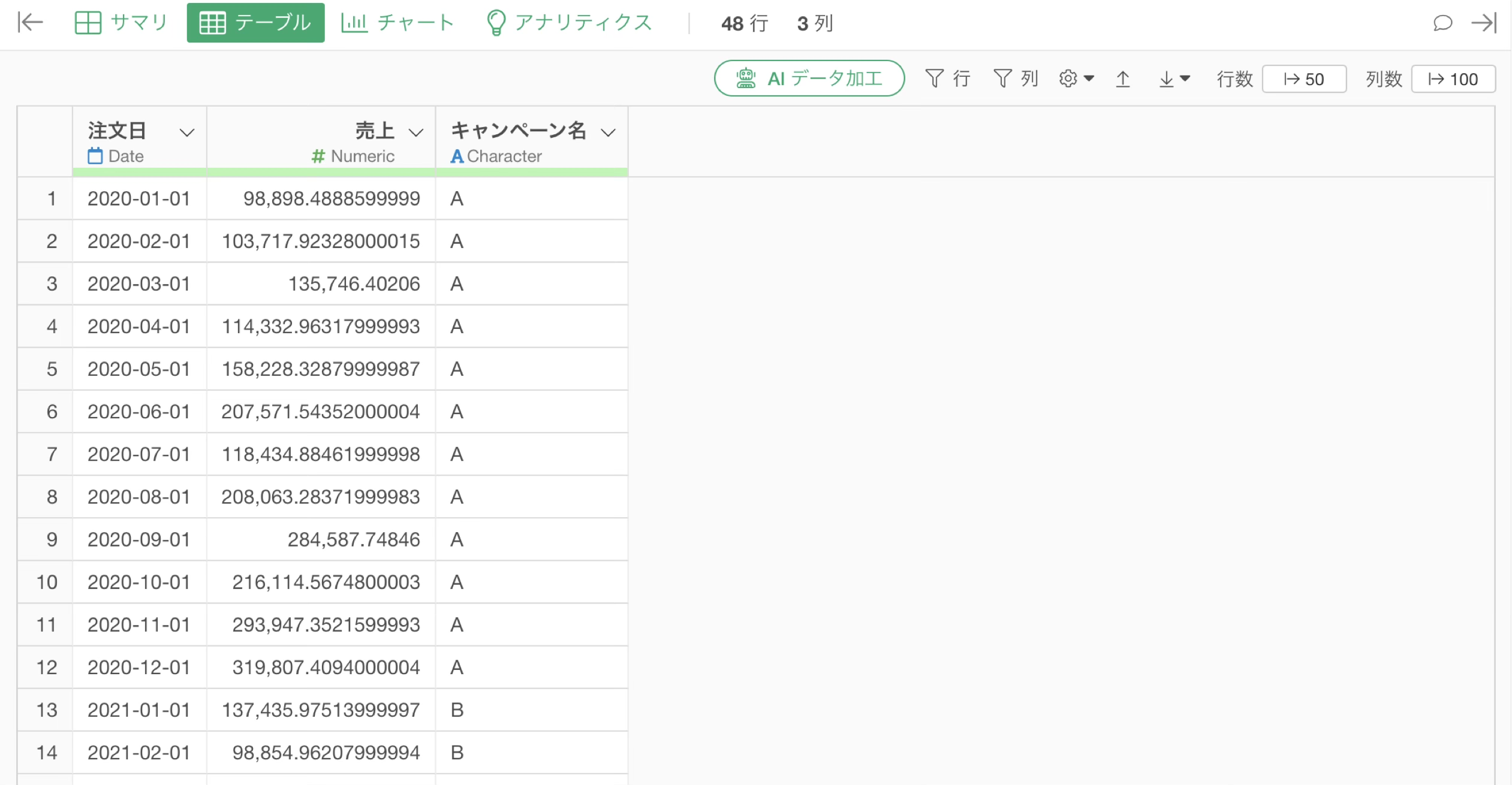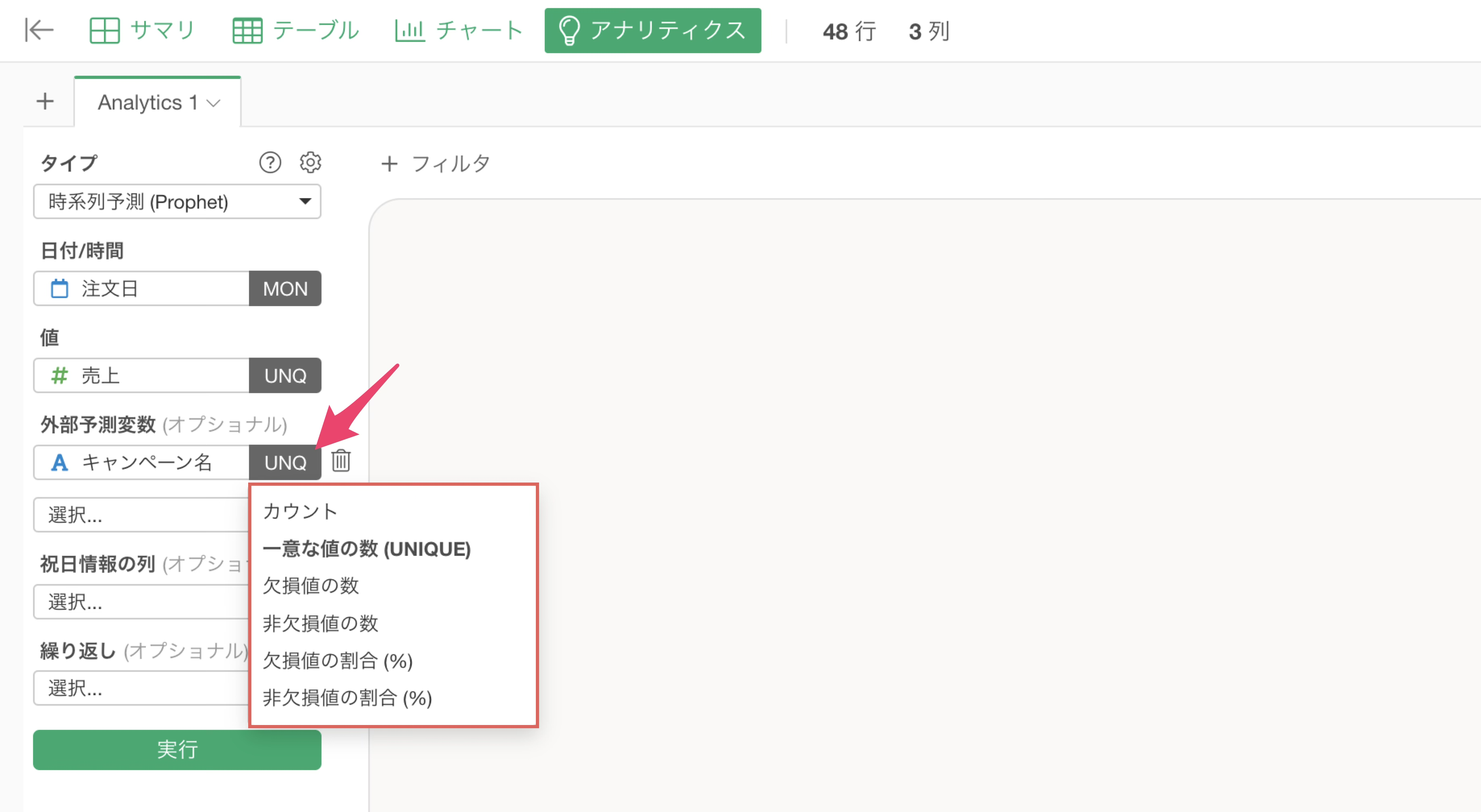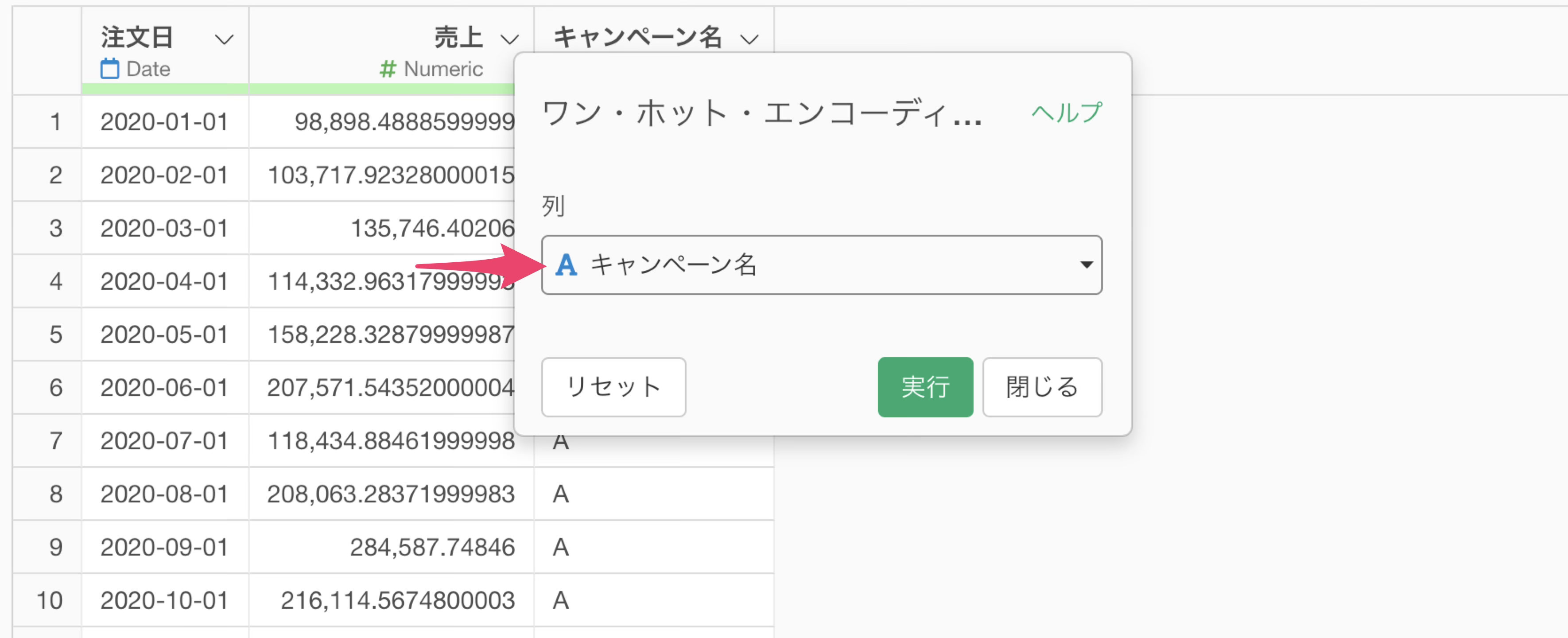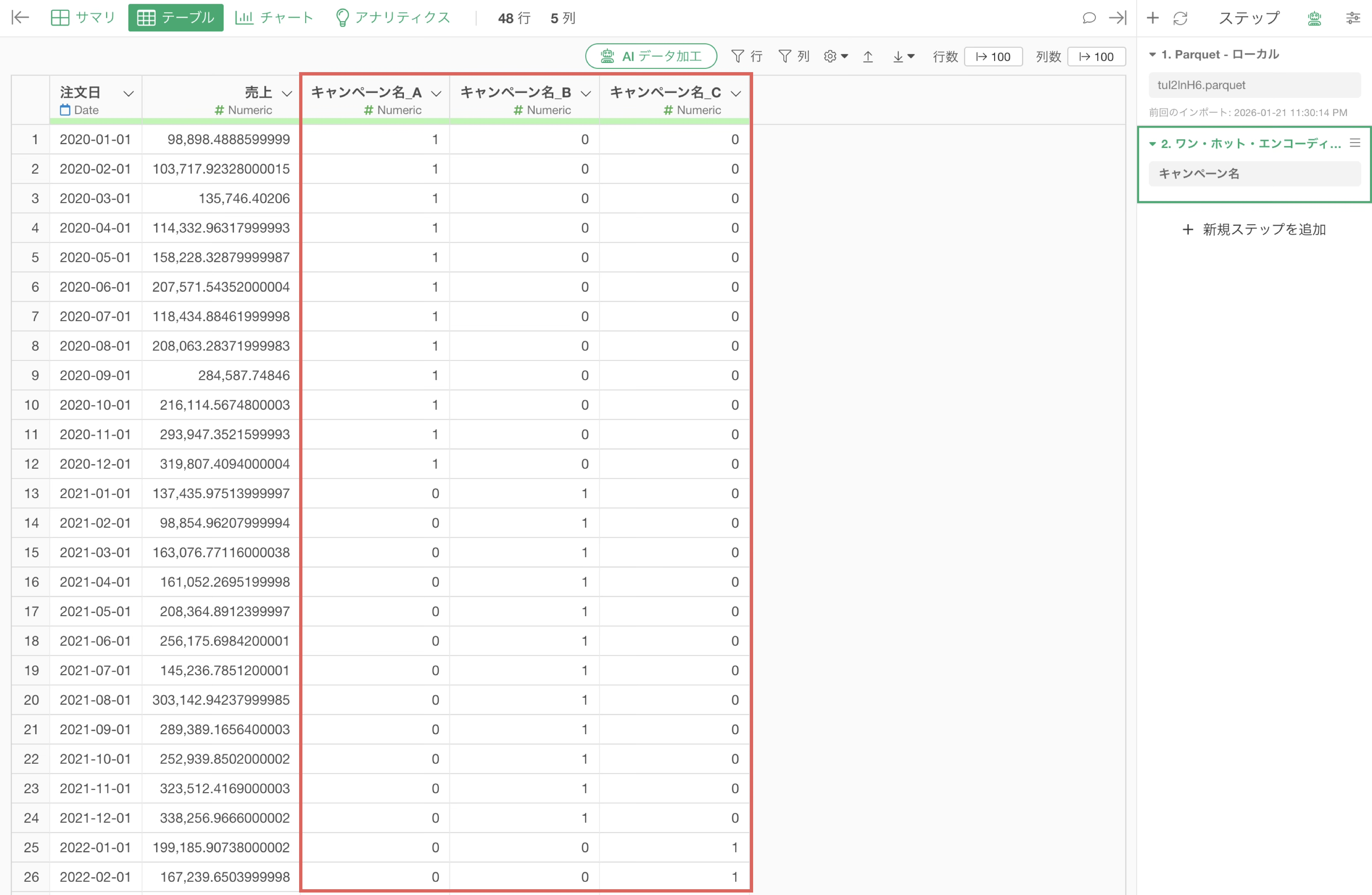 今回はキャンペーン名の値を列に展開して、キャンペーンを実施しているときには1、キャンペーンを実施してないときには0といった形のデータにしたいので、列には「キャンペーン名」を選択をして実行します。
