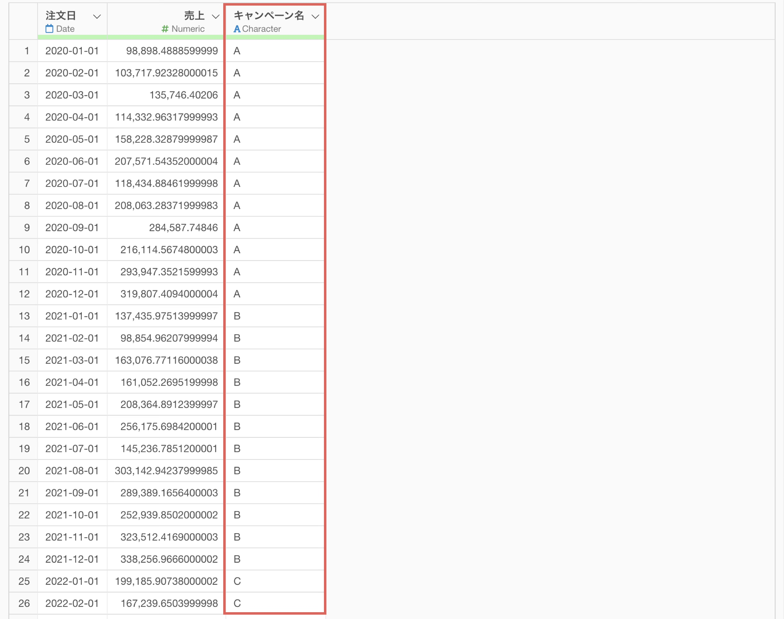 するとキャンペーンAを実行しているときには、キャンペーンAの実行タイミングで1の値が入り、キャンペーンBを実行している時にはキャンペーンBで1が付きます。また、キャンペーンCの時には同じようにキャンペーンCを実施しているときだけに1のフラグが立つようになります。