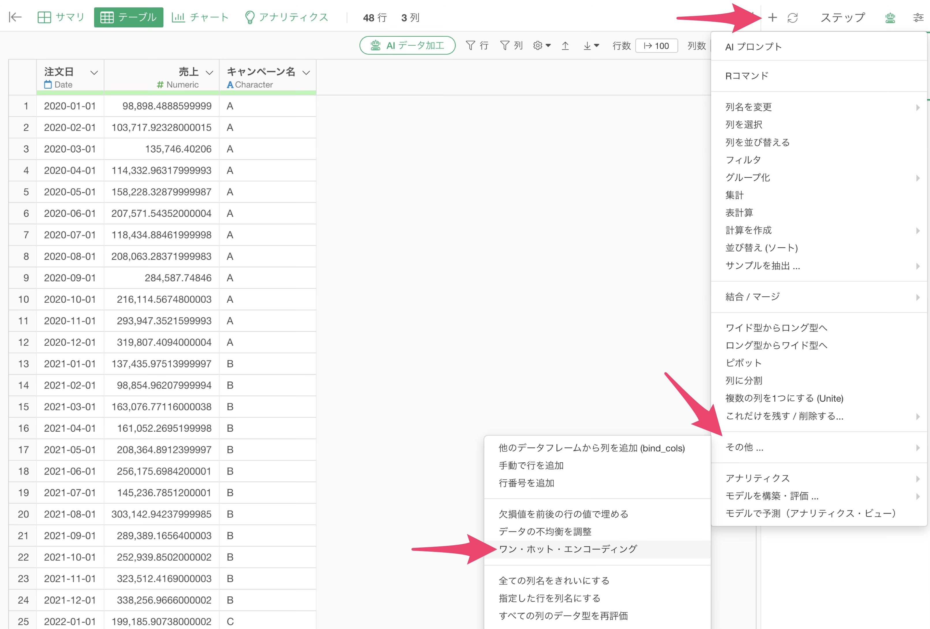 ワンホットエンコーディングを実施するときには、ステップのメニューから「ステップの追加」のメニューをクリックして、「その他」のメニューのサブメニューから「ワンホットエンコーディング」を選択します。