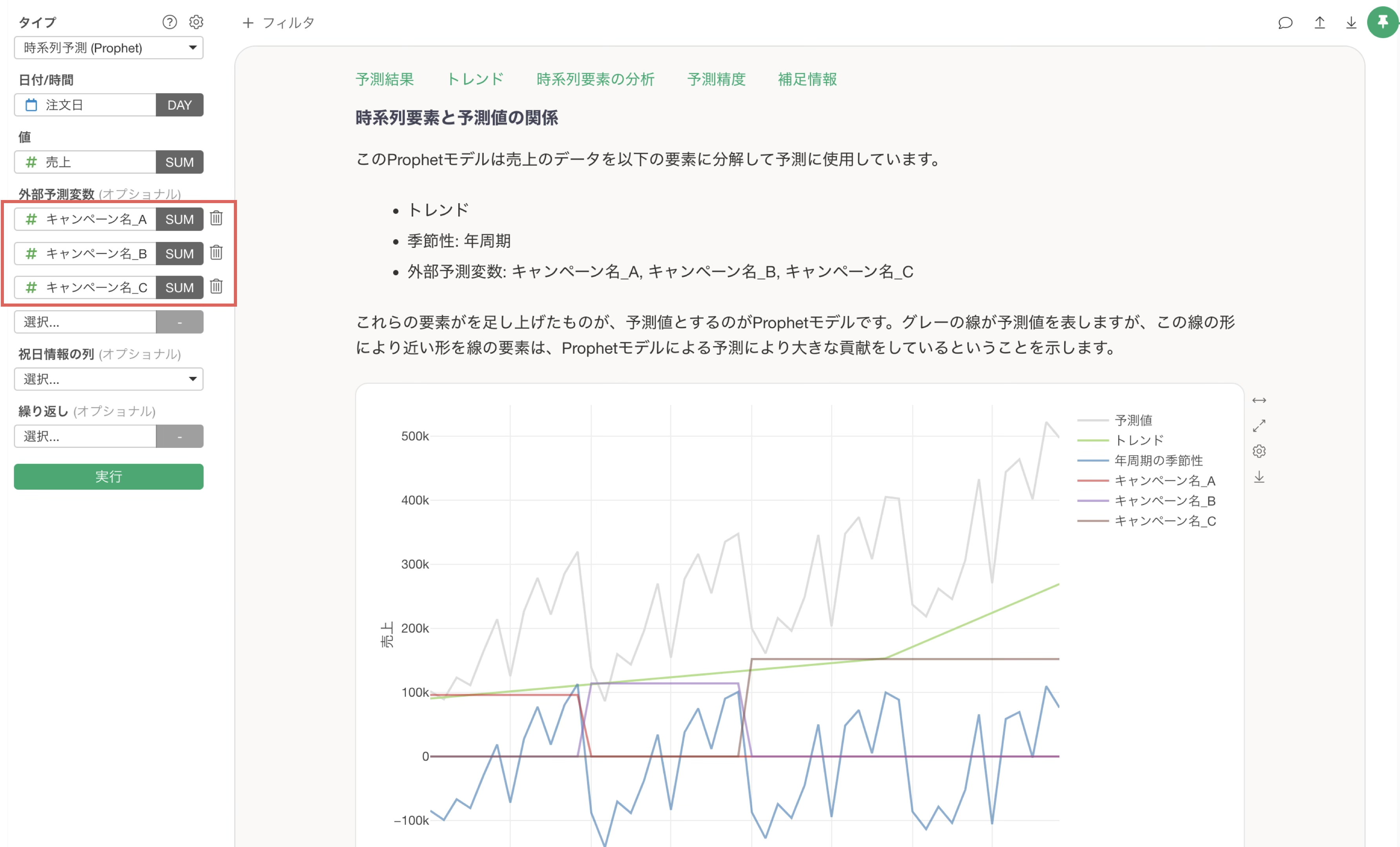 これらの列を使うと、アナリティクスのProphetを実行するときに、それぞれの列をProphetの外部予測変数として利用が可能となります。