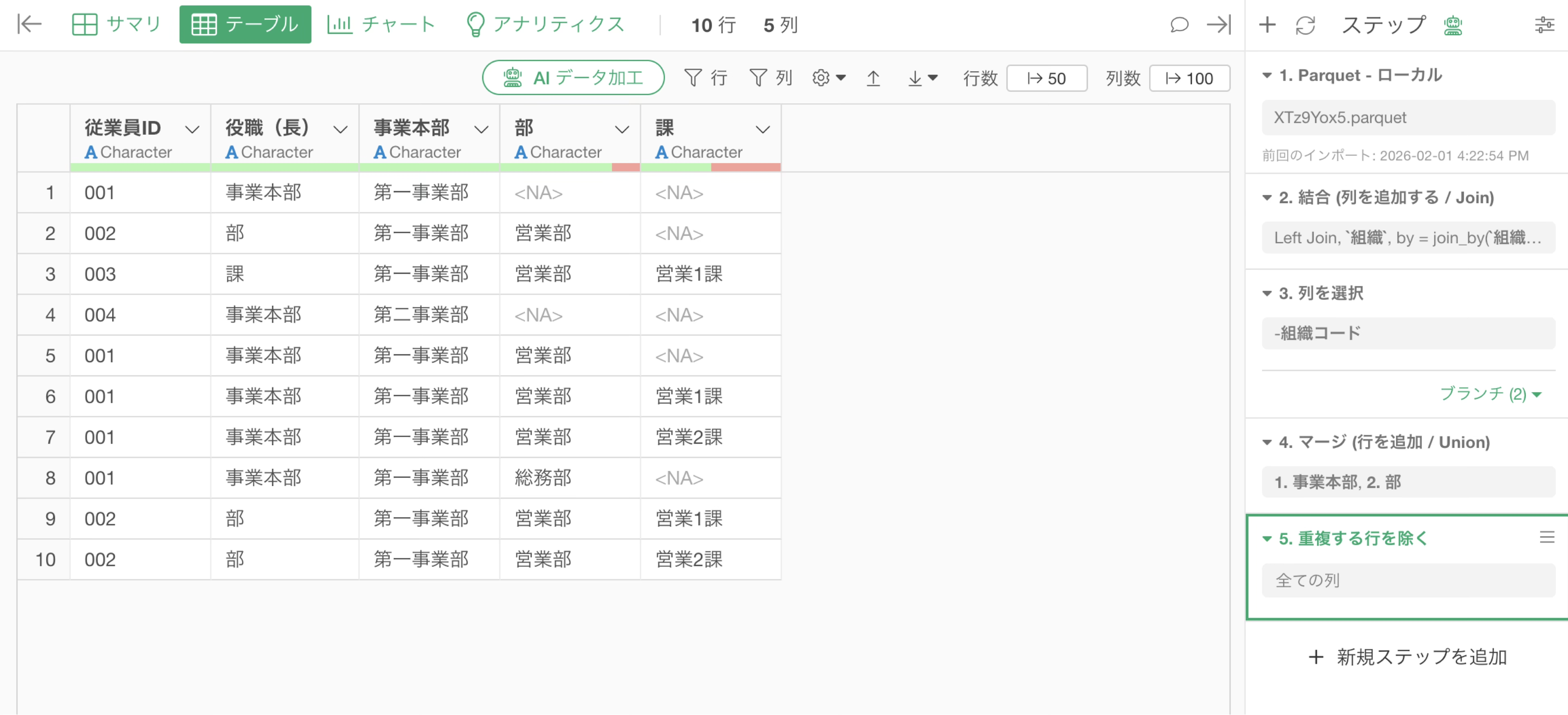従業員データに組織の情報を結合する:従業員のデータに組織のデータを結合し、各従業員が所属する組織を特定します。