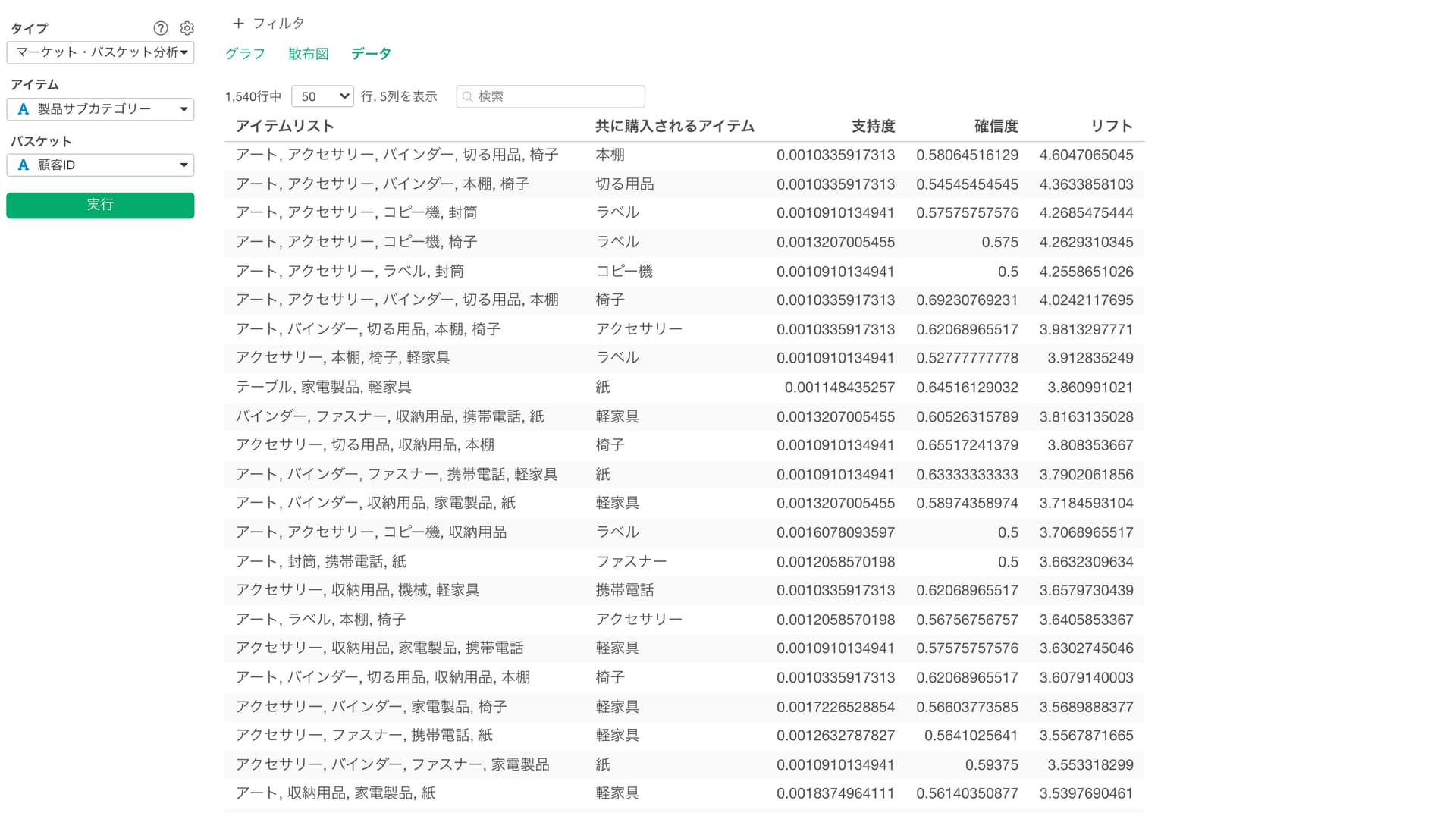 列を指定して実行すると、マーケット・バスケット分析の結果が表示されます。