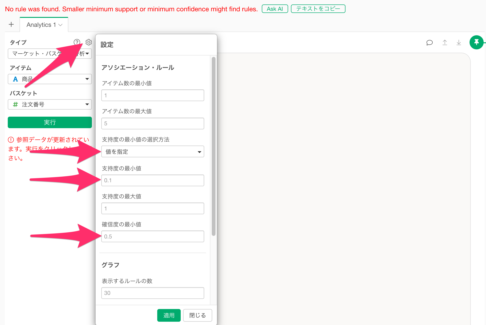 このエラーは、アナリティクスの設定から、支持度の最小値の選択方法 の設定を「値を指定」に変更のうえ、支持度(support)や確信度(confidence)の指標の最小値を小さくすることで現象を回避できることがあります。