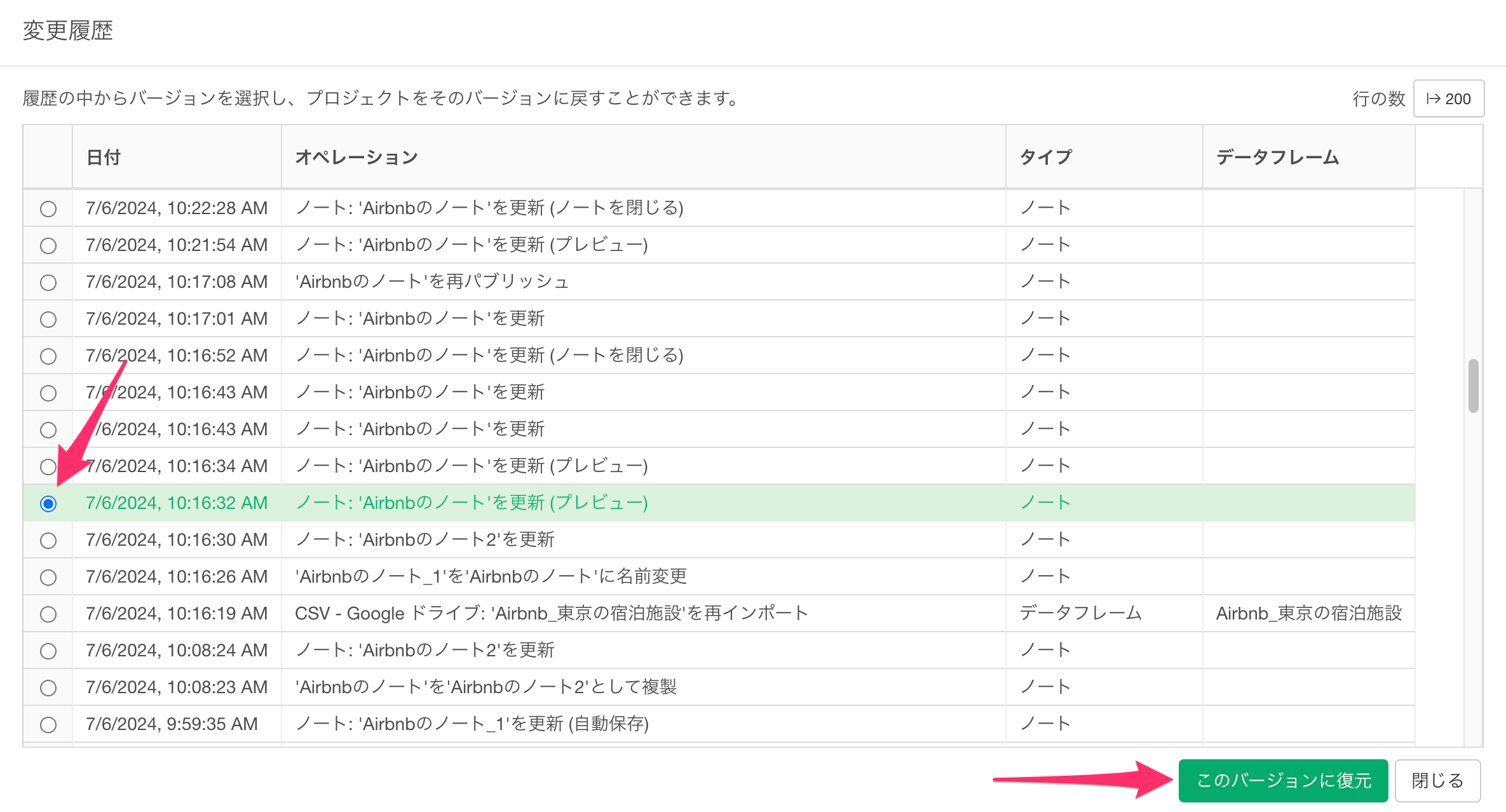 すると、現在いるプロジェクトにおける全ての変更履歴が確認できますので、任意のタイミングにノートを復元することが可能です。