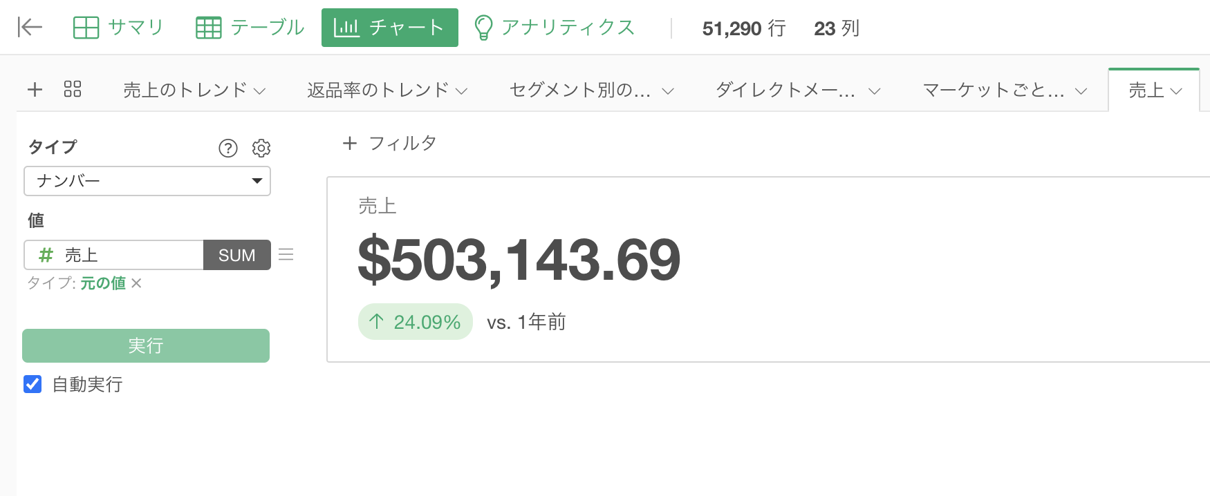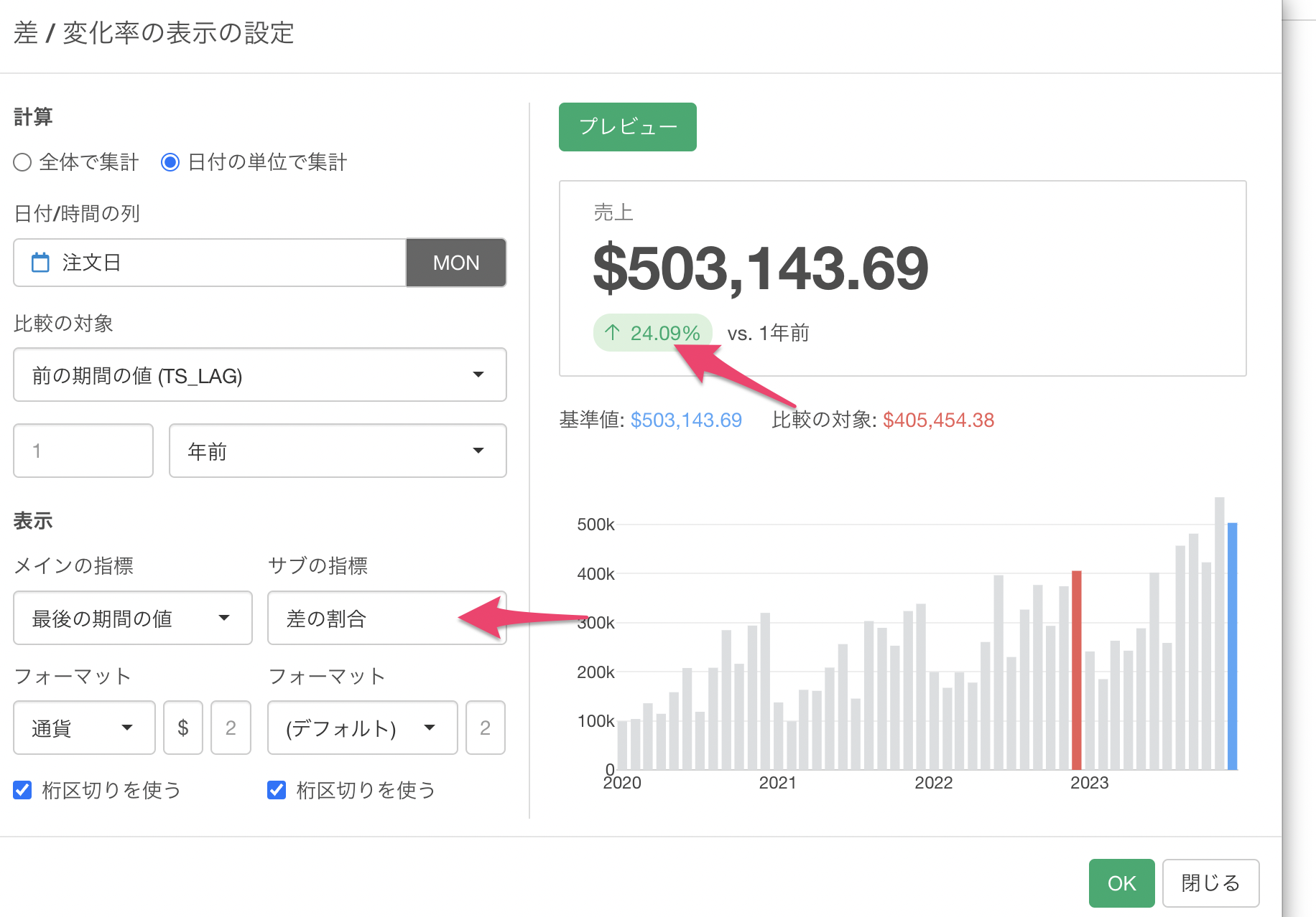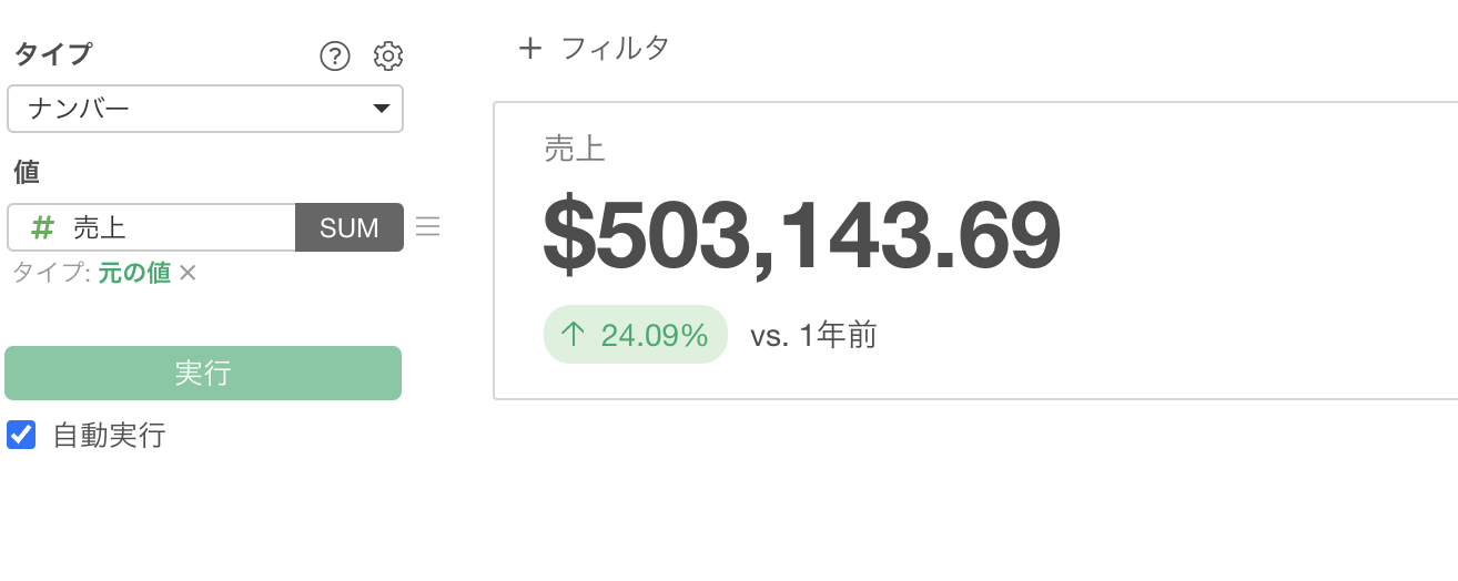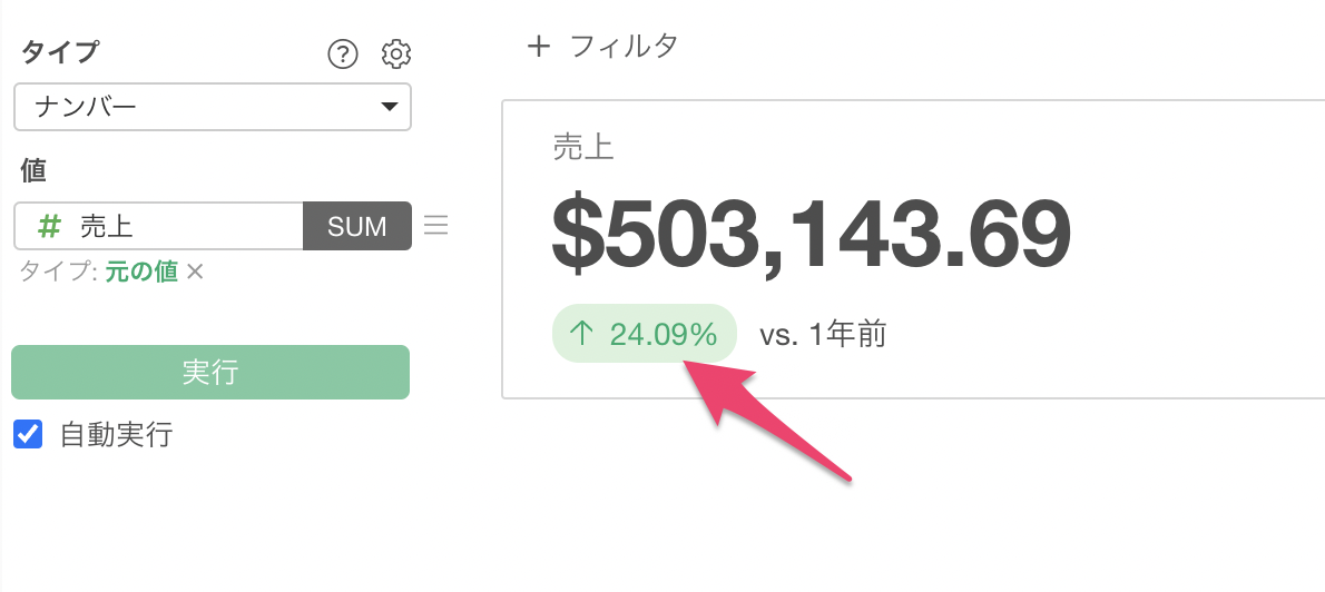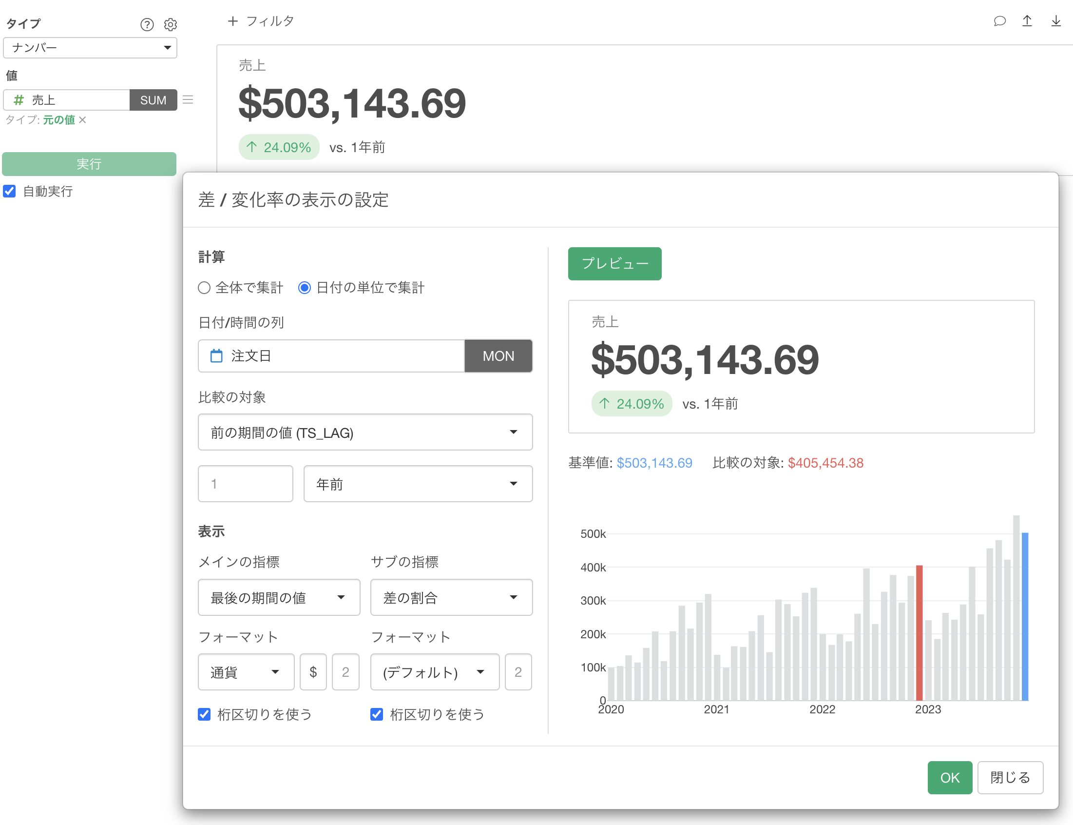 プレビューすることで、メインの指標としてはデータ上の最後の月の売上を、サブの指標として前年の同じ月と比べた売上の差を表示してくれています。