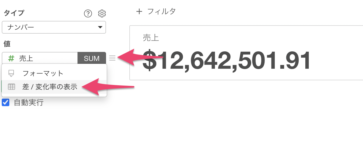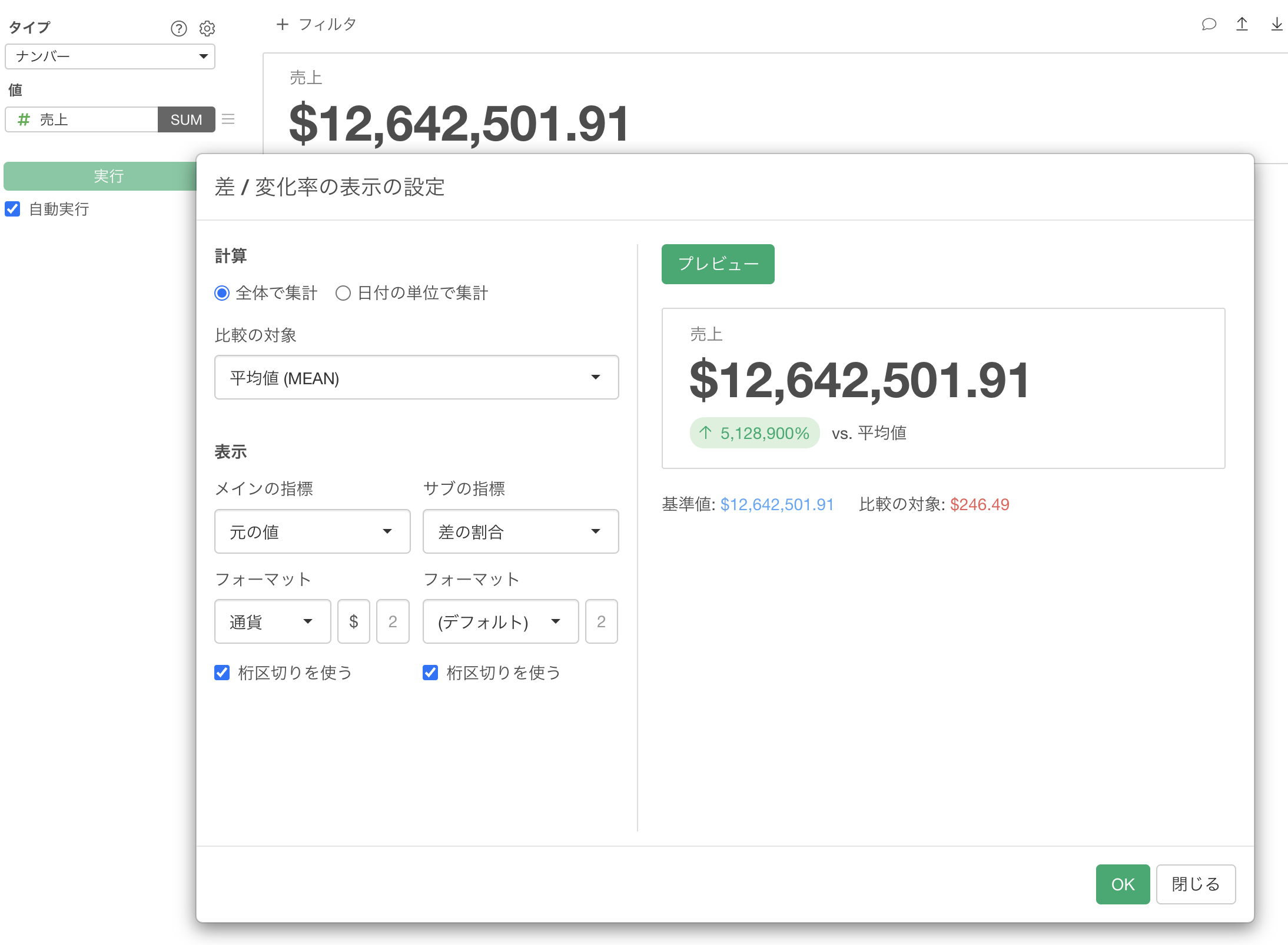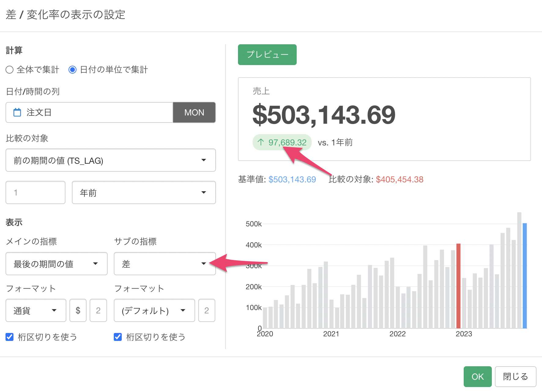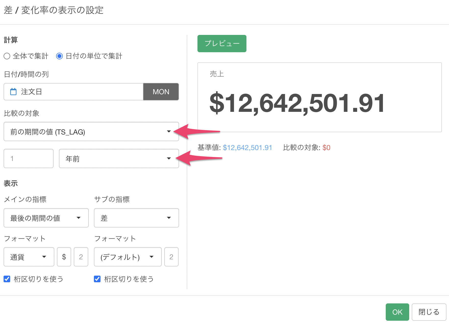 プレビューすることで、メインの指標としてはデータ上の最後の月の売上を、サブの指標として前年の同じ月と比べた売上の差を表示してくれています。