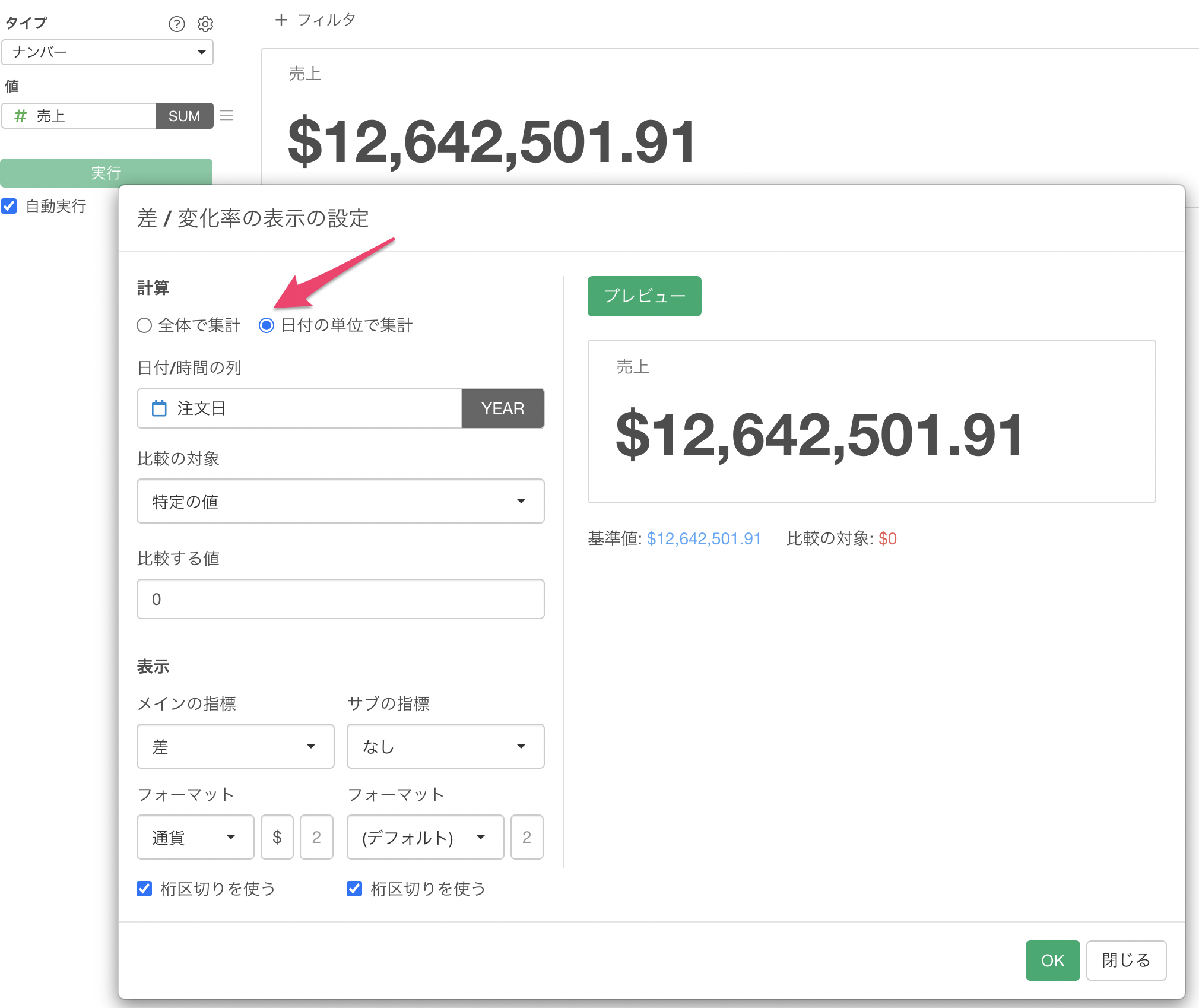 今回は前年同月として、特定の期間と比べた売上の増減をナンバーチャートとして表示をしていきたいため「日付の単位で集計」を選択します。