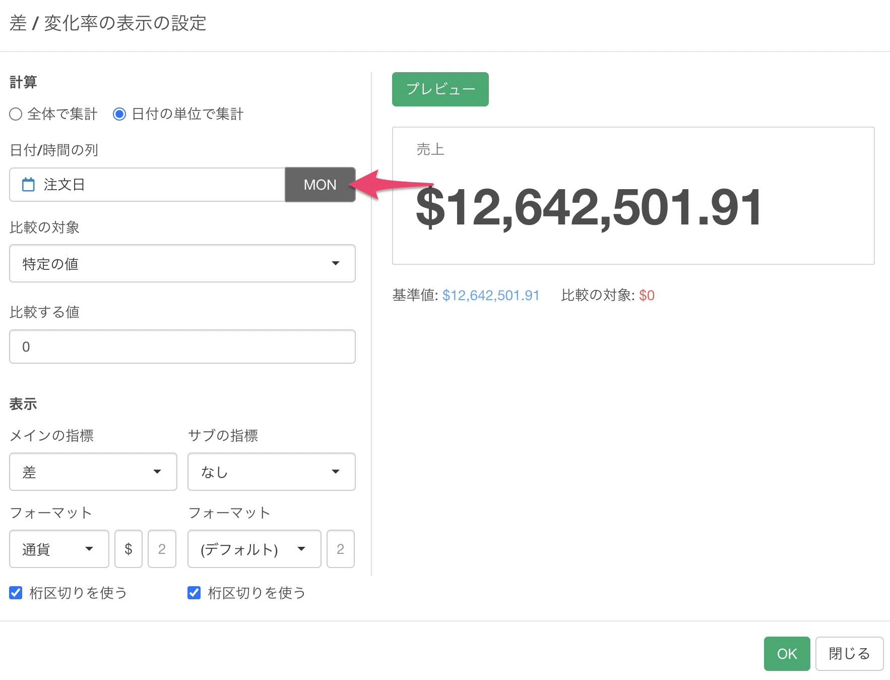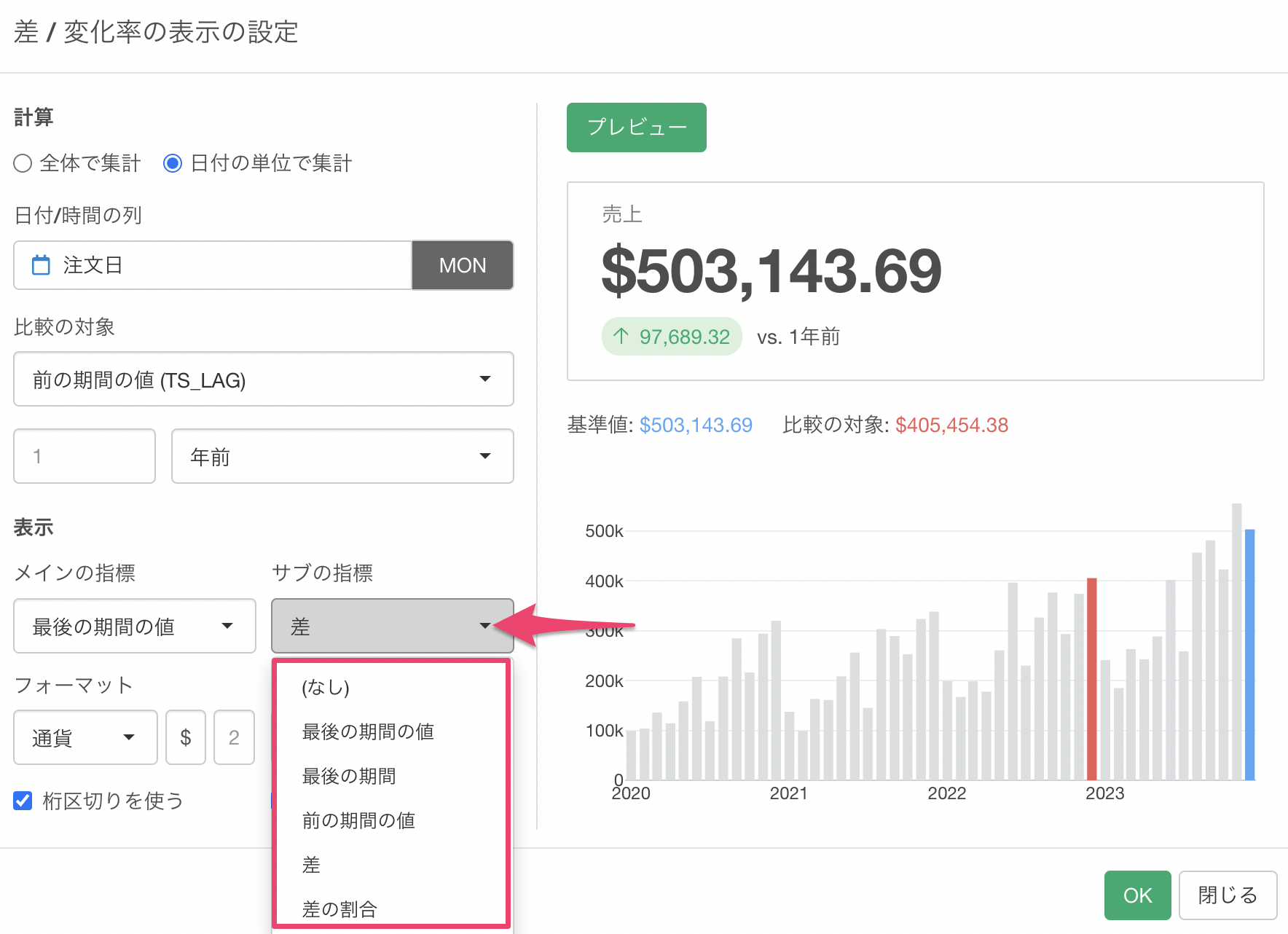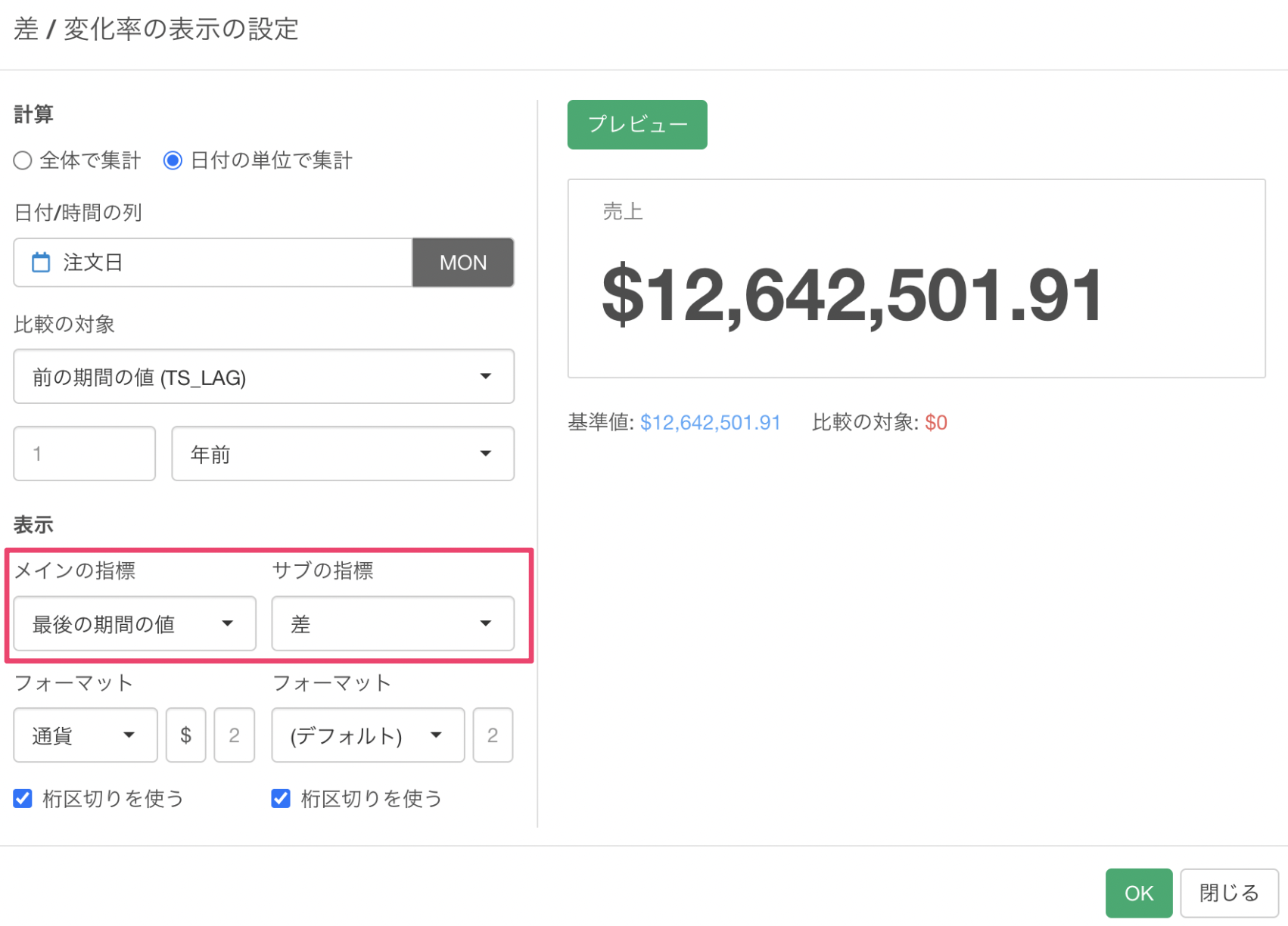 メインの指標にはデフォルトで「最後の期間の値」、サブの指標には「差」が割り当てられています。