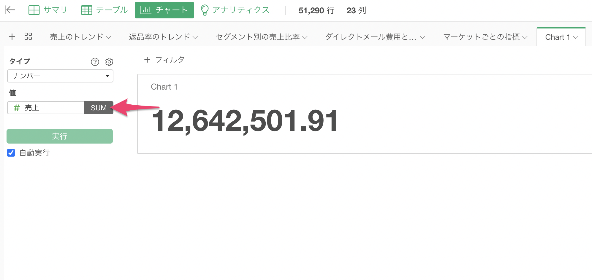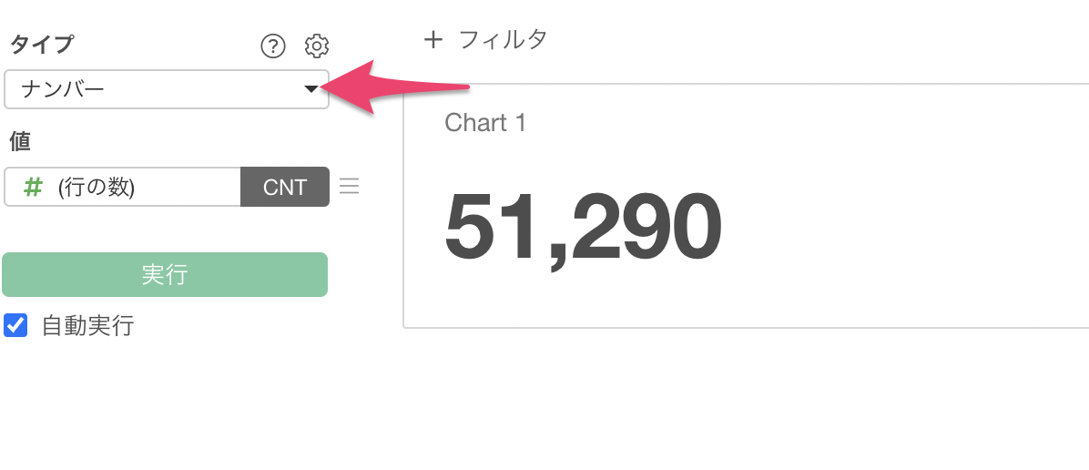 チャートビューからチャートを作成し、タイプに「ナンバー」を選択します。